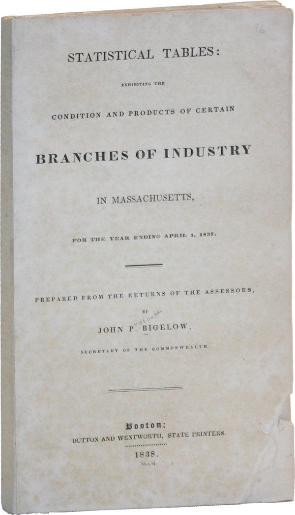 Boston: Dutton and Wentworth, State Printers, 1838. First Edition. Octavo. Printed paper wrappers; 209,[3]pp; includes index. Rear wrapper excised; marginal loss at bottom corner and fore-margin of first ten leaves, diminishing from ca 1/2" marginal loss to small nicks, not affecting text. Ex-NYPL, with small ink pressure stamp on verso of title page (no other markings). Data on various industries arranged by county and municipality; preceded by the text of the law enacted to mandate the gathering of such date, titled "An Act to obtain statistical information in relation to certain branches of industry within the Commonwealth.