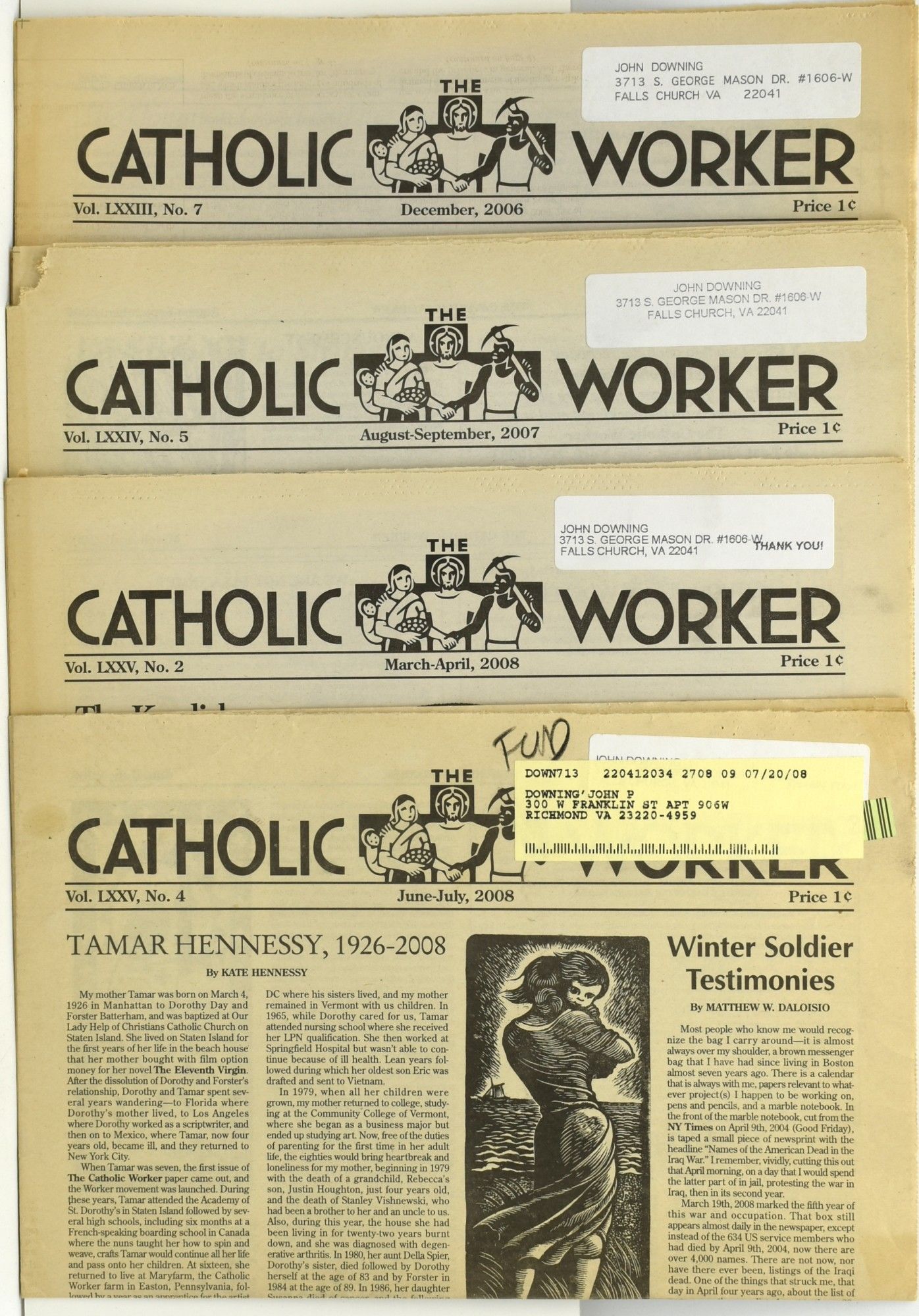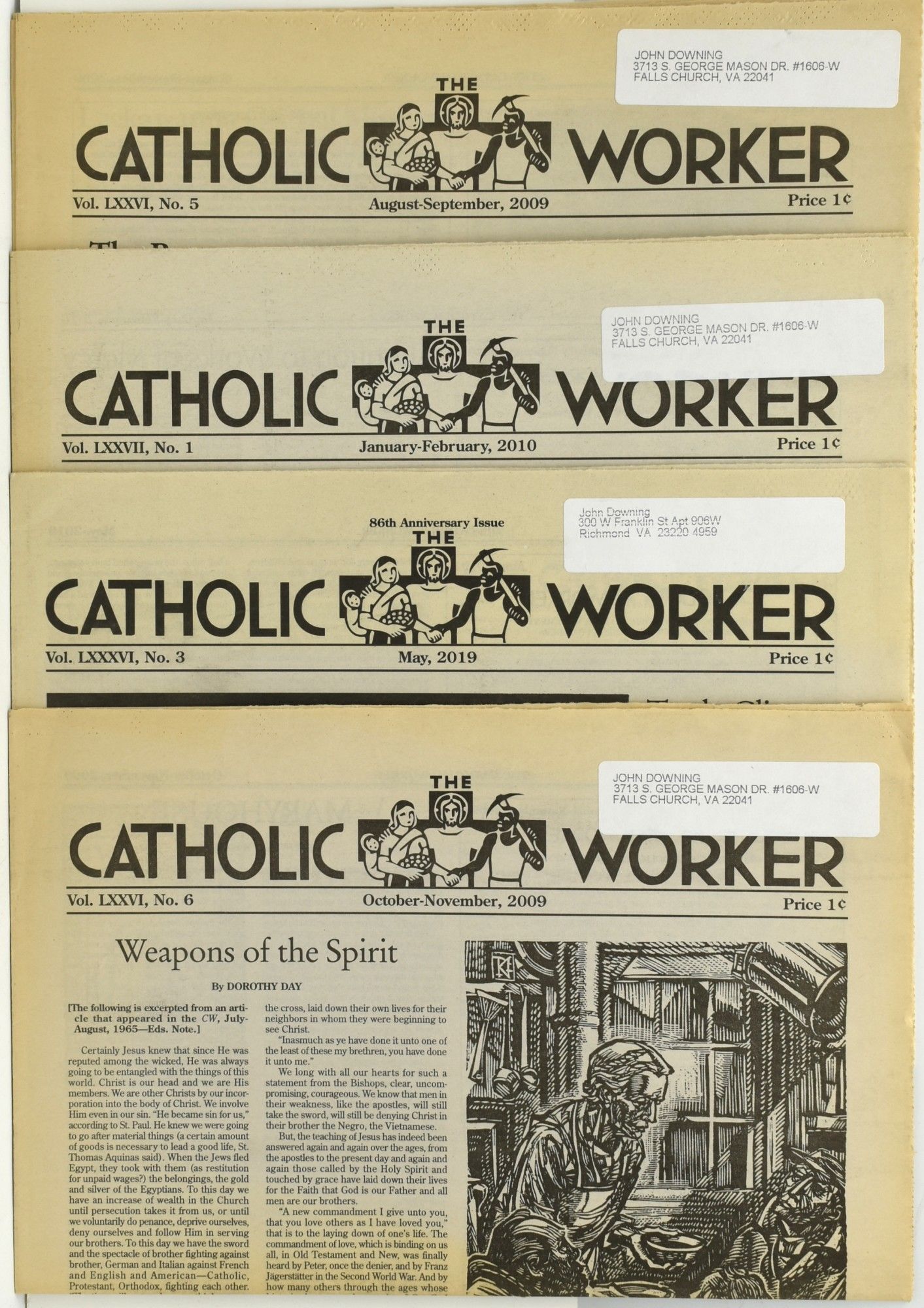 Many were shocked to see news footage of of a Buffalo resident, Martin Gugino, knocked to the ground by a police officer, and left unconcious and bleeding from the head. Mr. Gugino was a Roman Catholic activist, and member of the Catholic Worker movement. In recognition of Mr. Gugino, we offer for sale nine issues of the newspaper The Catholic Worker -- December 2006; August - September 2007; December 2007; March-April 2008; June-July, 2008; October-November 2009; August-September 2009; January-February 2010; May 2019. ~.