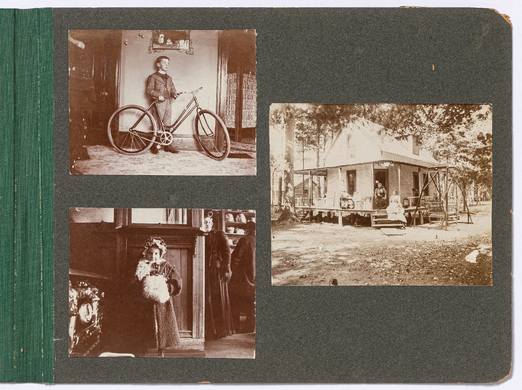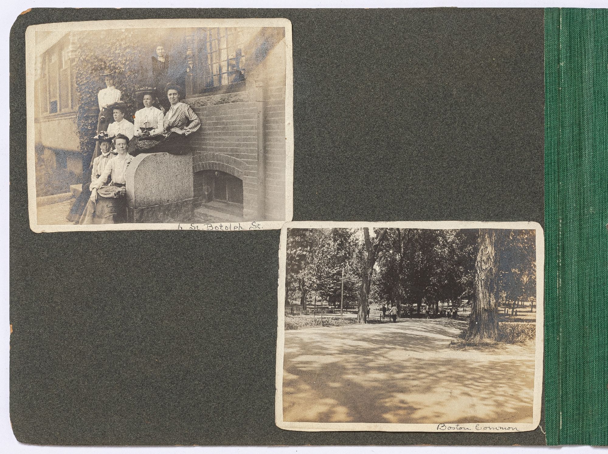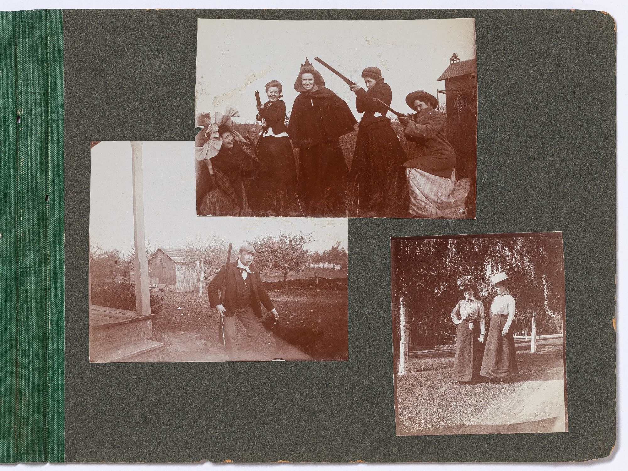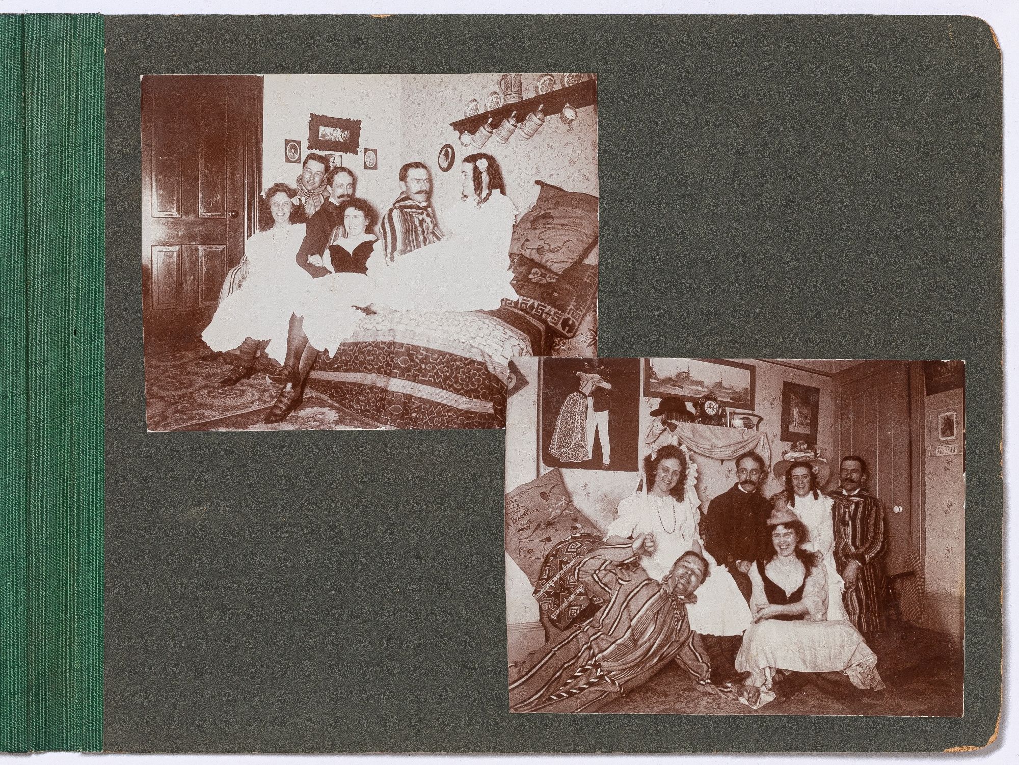 A photo album compiled by a New England Victorian-era family. The photographs show the family having parties, traveling, and spending time at the beach. One section of images shows family and friends making faces and silly poses for the camera. A large group photo shows the family in costume with a caption in the negative reading “photo by Roy.” Other photos show Boston Commons, King’s Chapel, and Longfellow’s house. They pose in a horse drawn carriage, on bicycles, and in fields and lakes nearby. A photo of a group of women shows them holding rifles and laughing in a field. They often dress in costumes such as one photo that shows a group of women in 1700s dresses and wigs. One of these shows the group with faces through newspapers, another shows them in a bed in pajamas.
