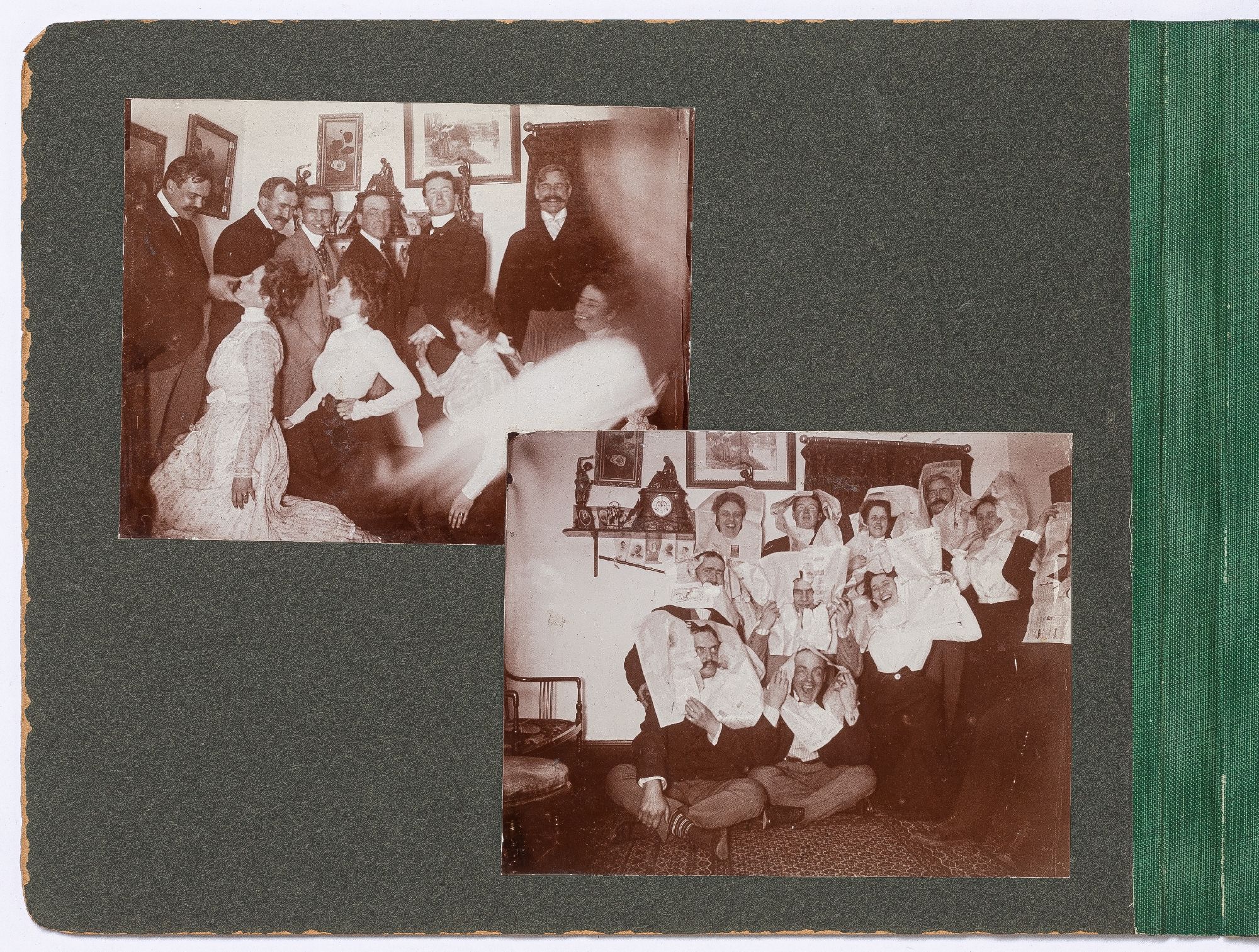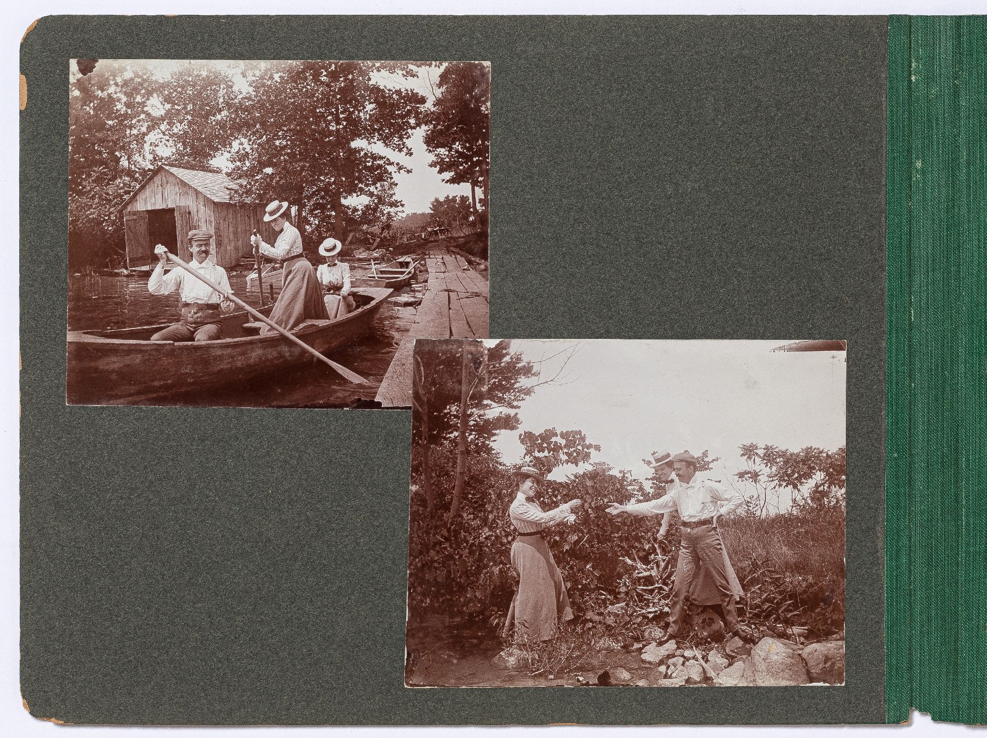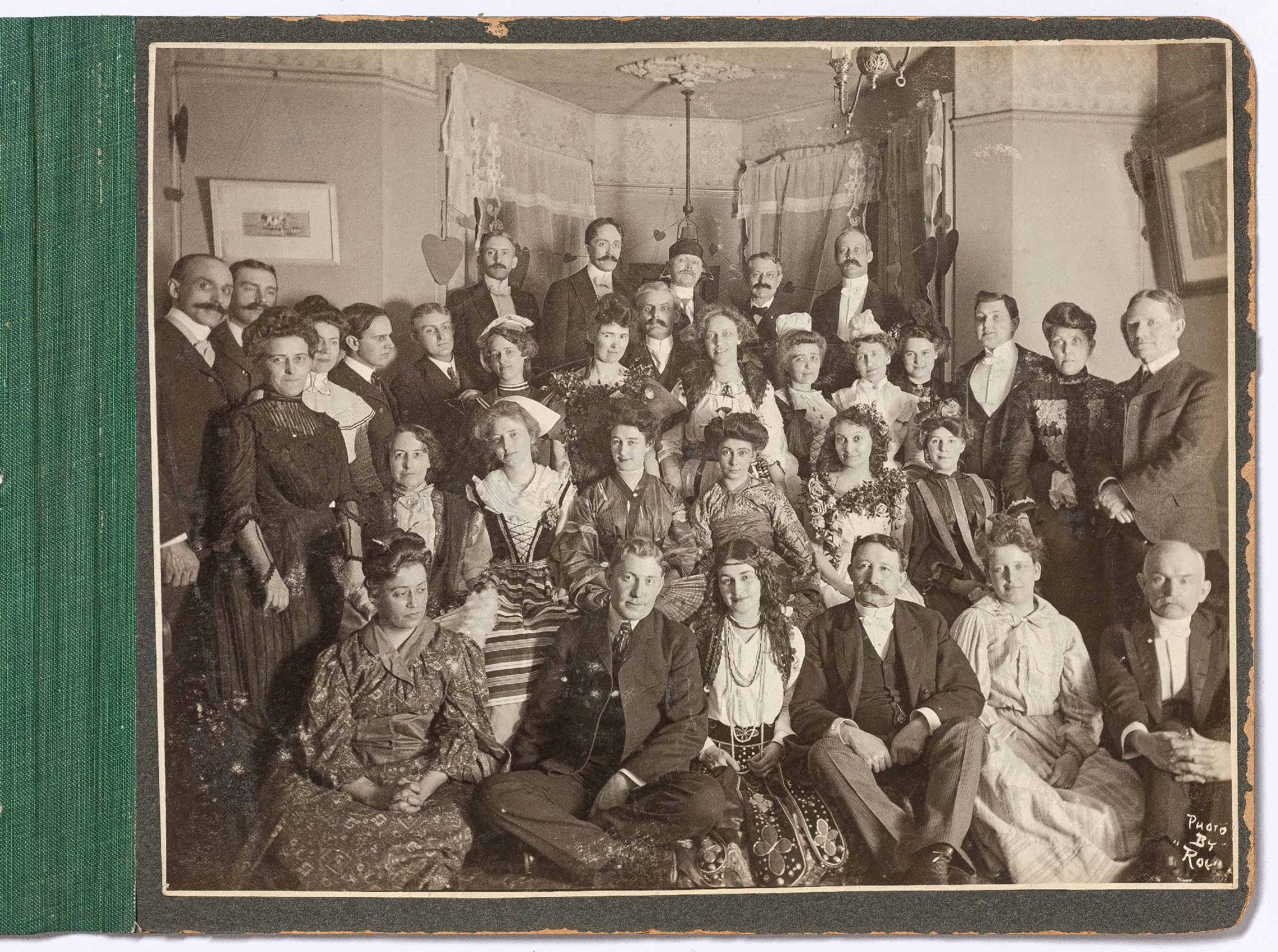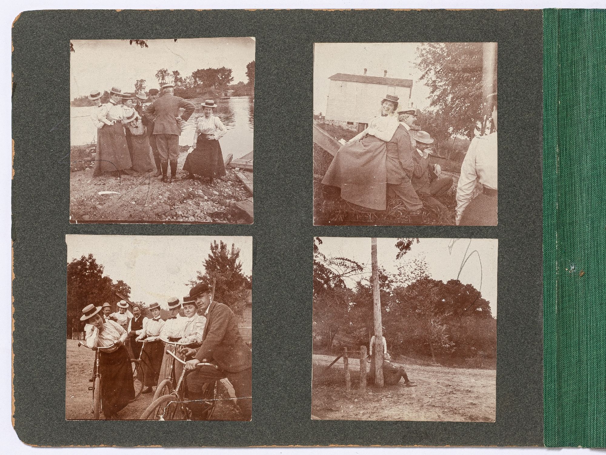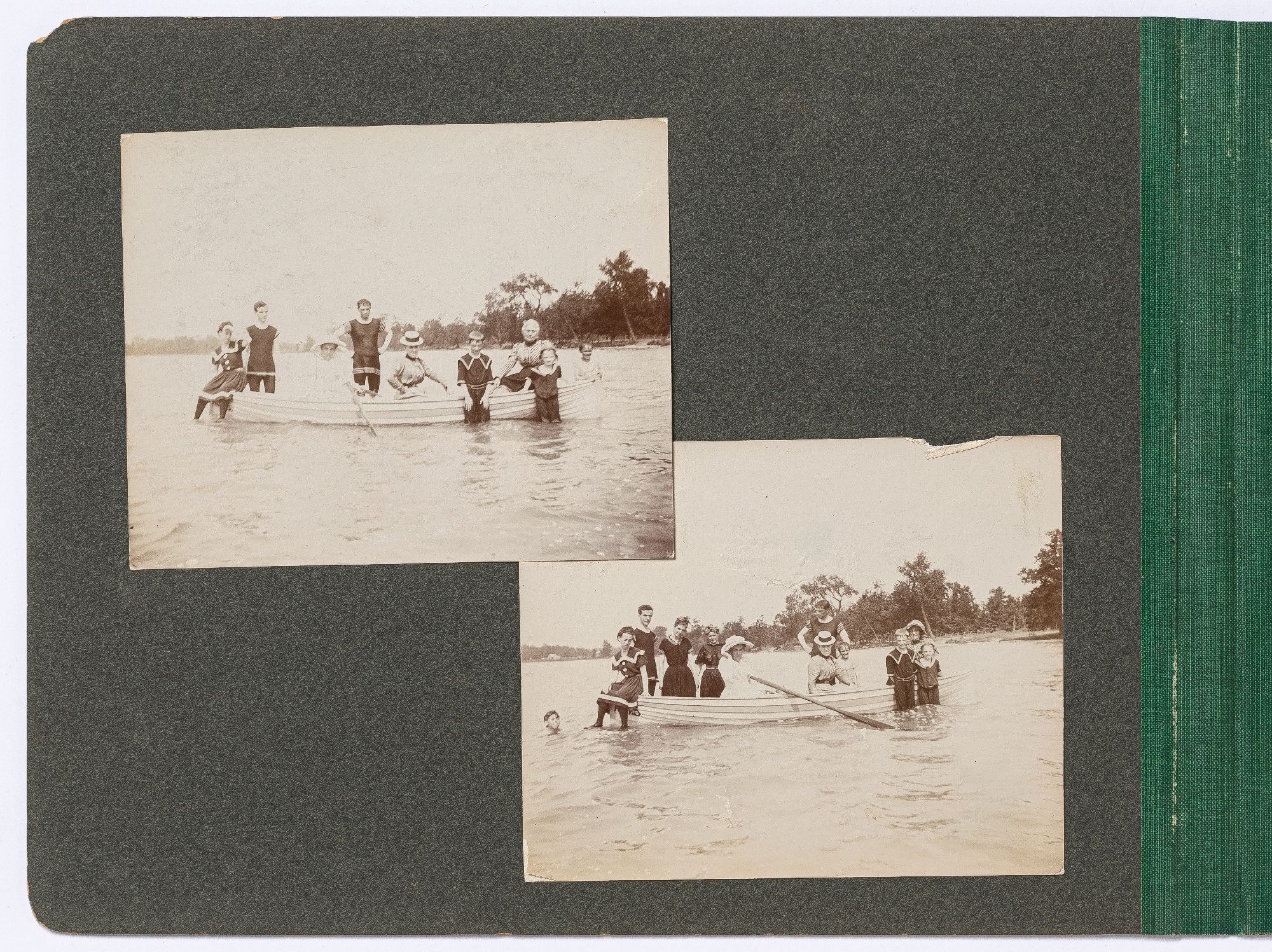 A photo album compiled by a New England Victorian-era family. The photographs show the family having parties, traveling, and spending time at the beach. One section of images shows family and friends making faces and silly poses for the camera. A large group photo shows the family in costume with a caption in the negative reading “photo by Roy.” Other photos show Boston Commons, King’s Chapel, and Longfellow’s house. They pose in a horse drawn carriage, on bicycles, and in fields and lakes nearby. A photo of a group of women shows them holding rifles and laughing in a field. They often dress in costumes such as one photo that shows a group of women in 1700s dresses and wigs. One of these shows the group with faces through newspapers, another shows them in a bed in pajamas.