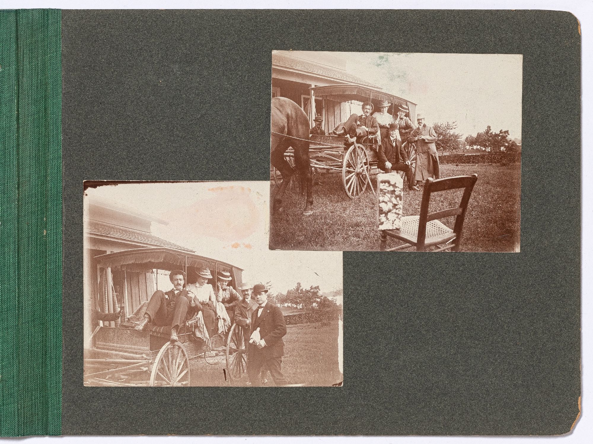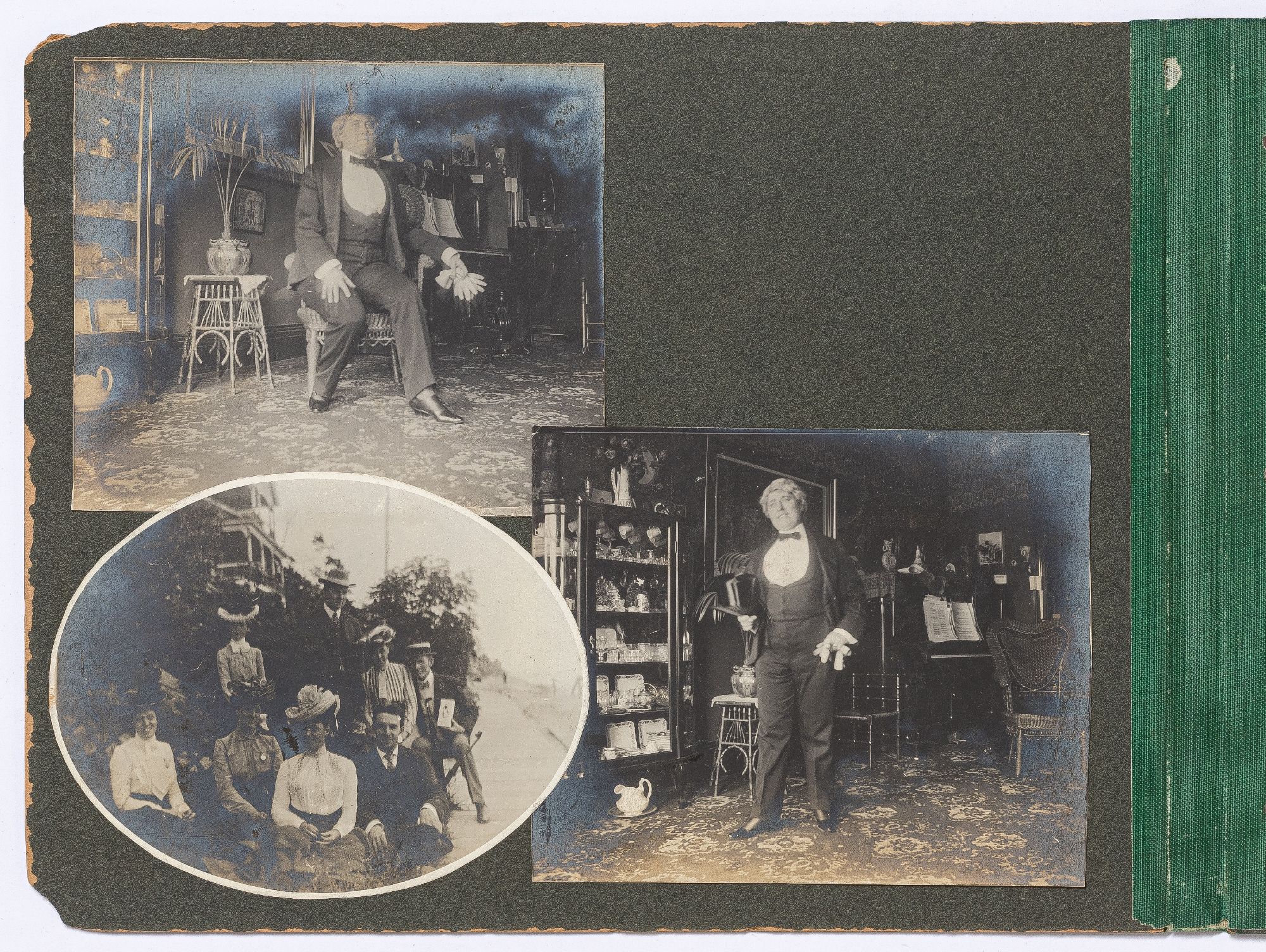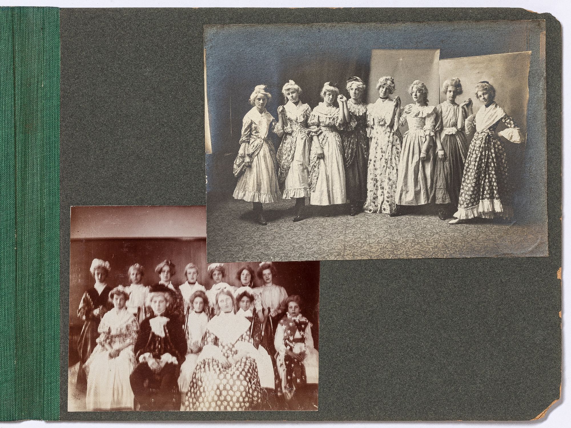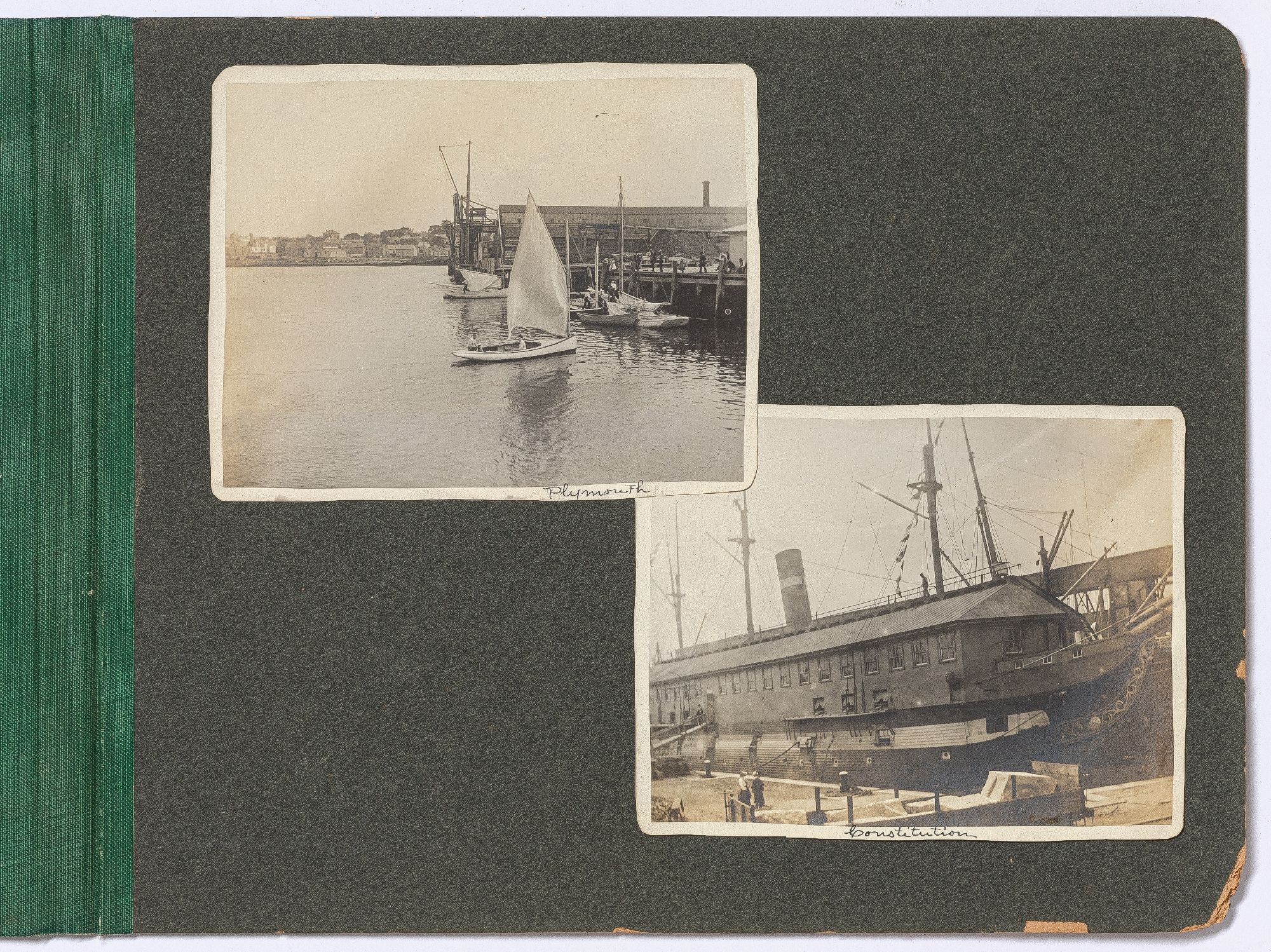 A photo album compiled by a New England Victorian-era family. The photographs show the family having parties, traveling, and spending time at the beach. One section of images shows family and friends making faces and silly poses for the camera. A large group photo shows the family in costume with a caption in the negative reading “photo by Roy.” Other photos show Boston Commons, King’s Chapel, and Longfellow’s house. They pose in a horse drawn carriage, on bicycles, and in fields and lakes nearby. A photo of a group of women shows them holding rifles and laughing in a field. They often dress in costumes such as one photo that shows a group of women in 1700s dresses and wigs. One of these shows the group with faces through newspapers, another shows them in a bed in pajamas.