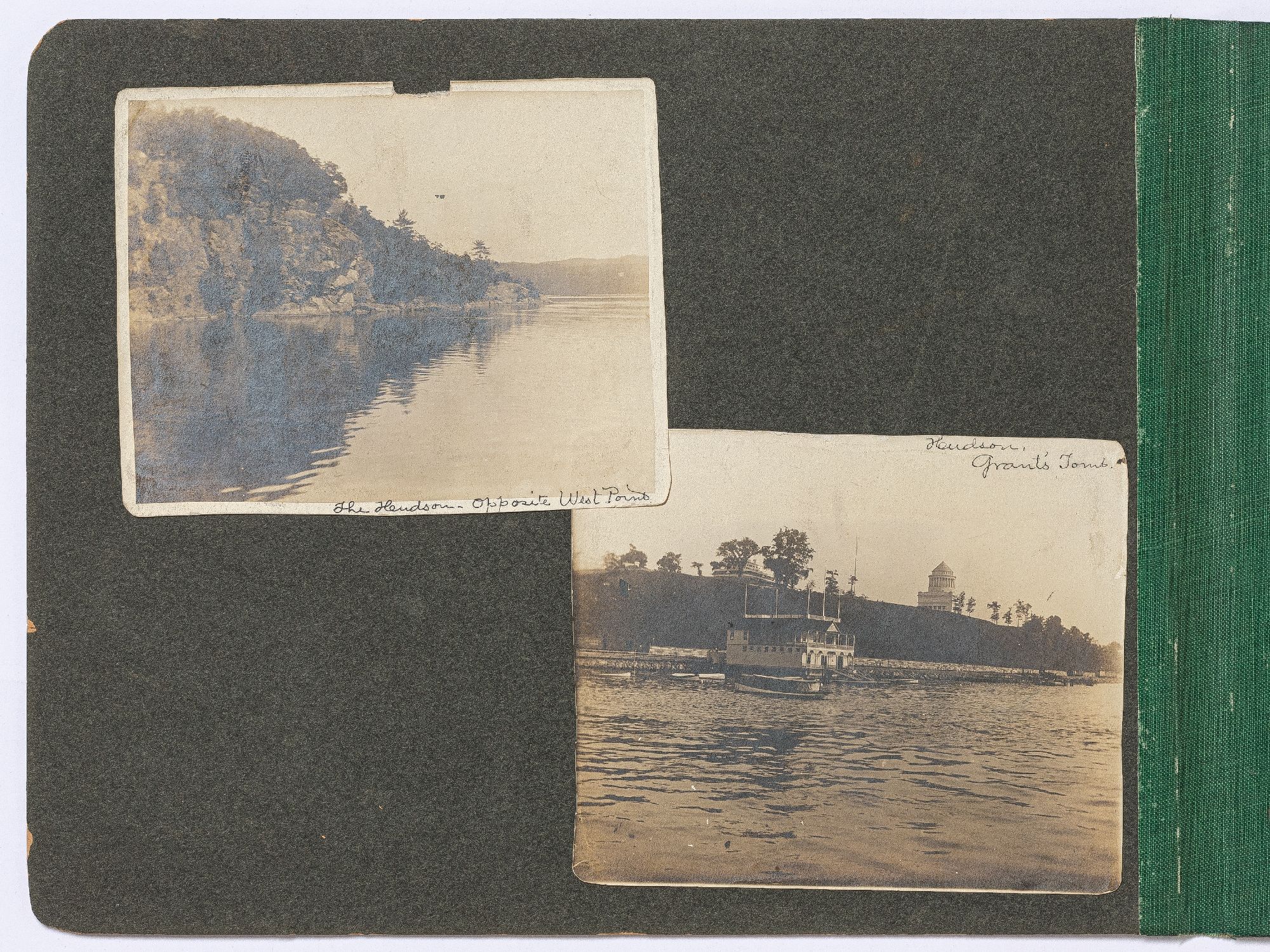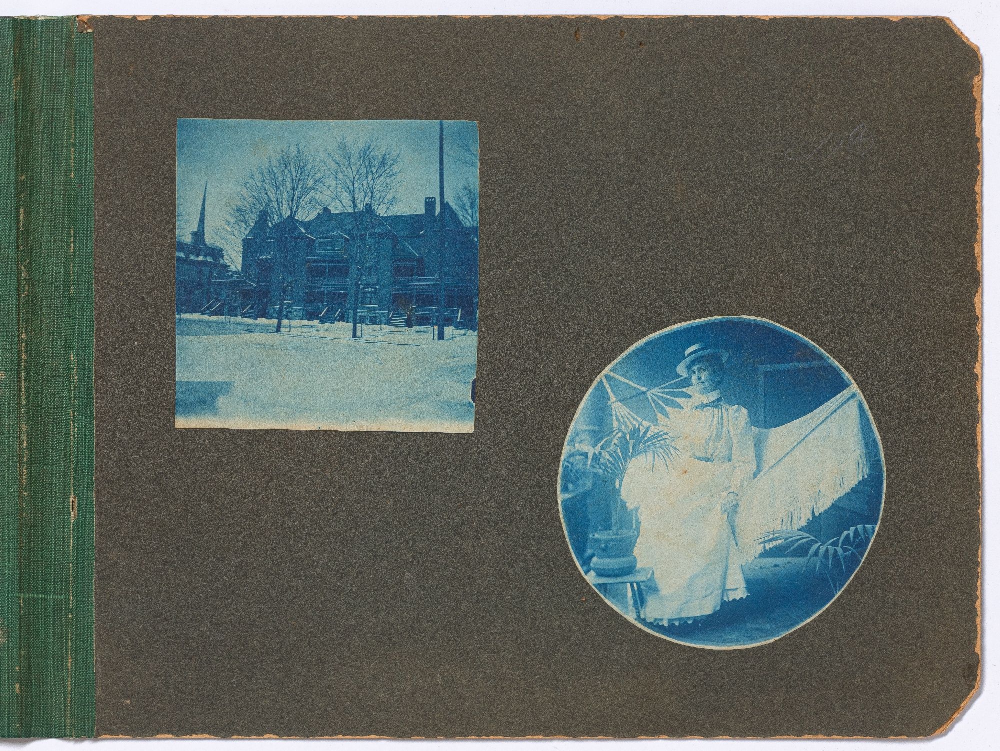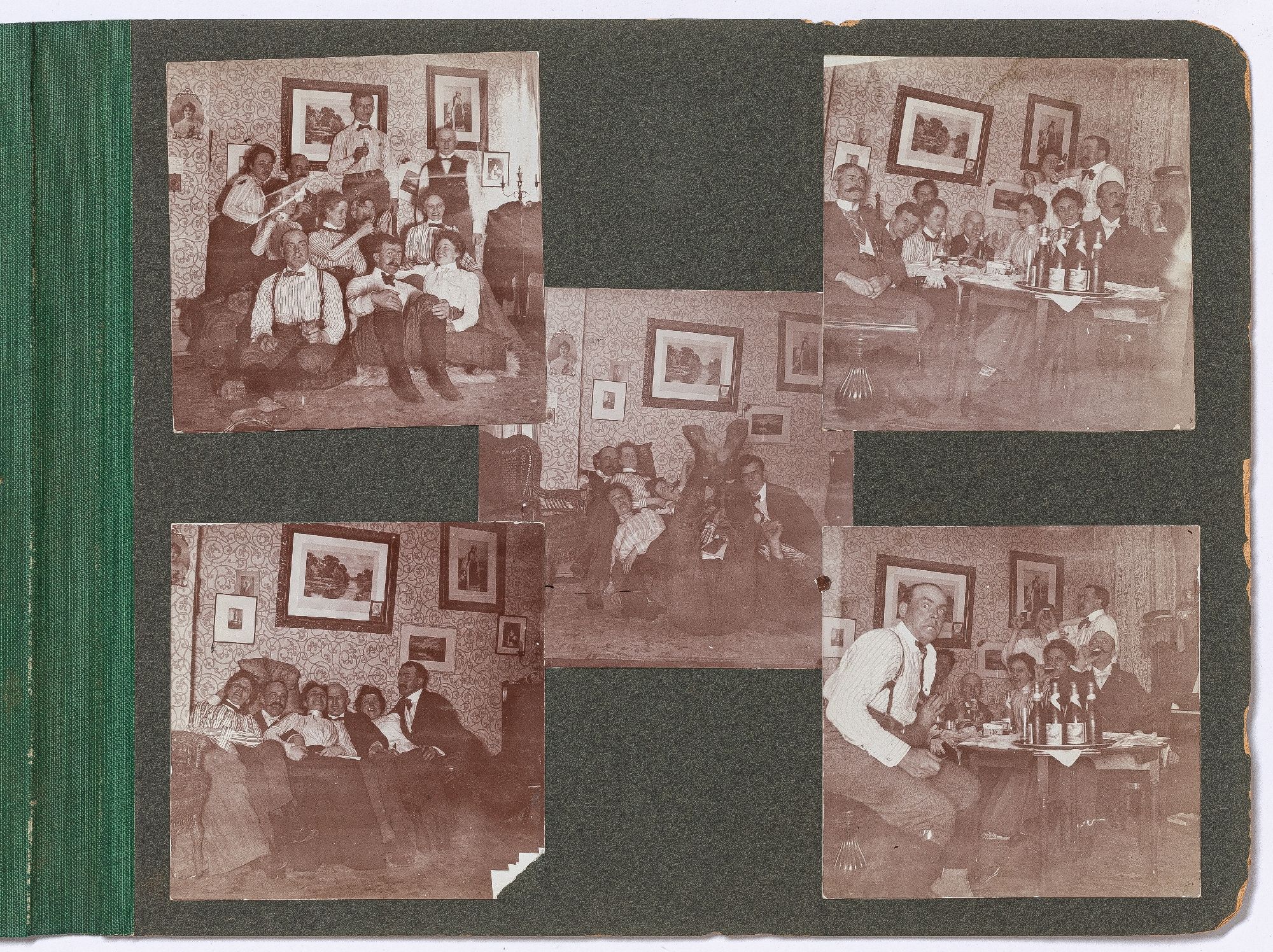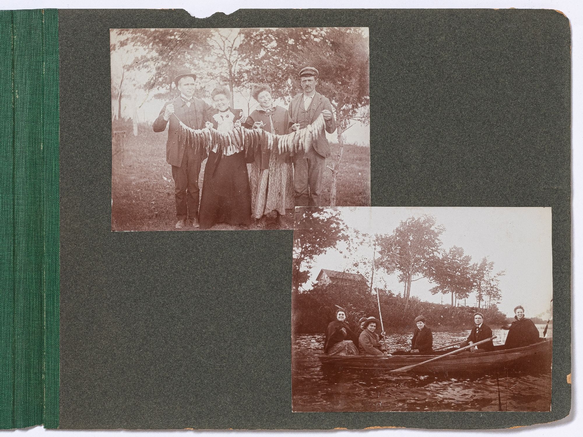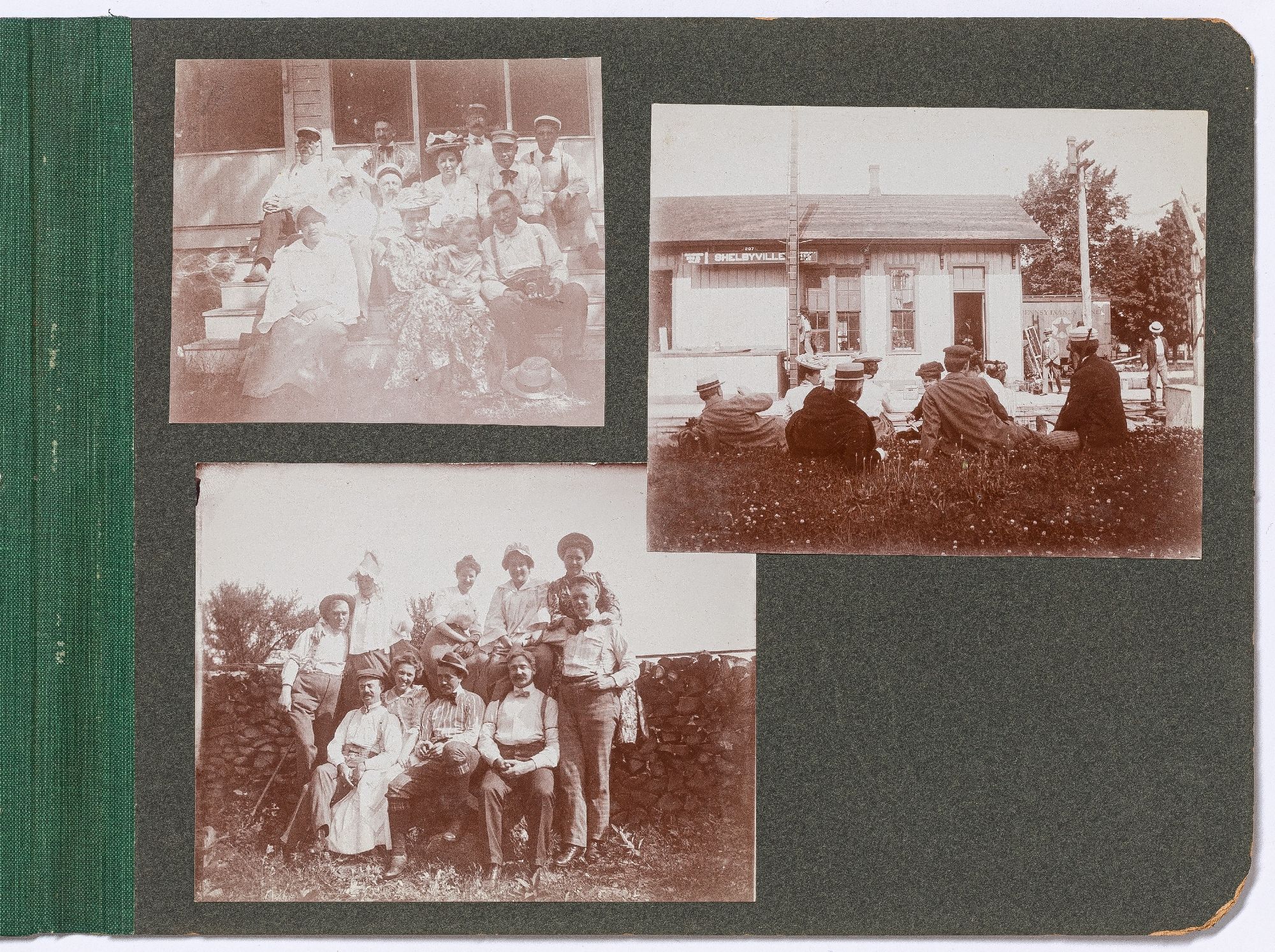 A photo album compiled by a New England Victorian-era family. The photographs show the family having parties, traveling, and spending time at the beach. One section of images shows family and friends making faces and silly poses for the camera. A large group photo shows the family in costume with a caption in the negative reading “photo by Roy.” Other photos show Boston Commons, King’s Chapel, and Longfellow’s house. They pose in a horse drawn carriage, on bicycles, and in fields and lakes nearby. A photo of a group of women shows them holding rifles and laughing in a field. They often dress in costumes such as one photo that shows a group of women in 1700s dresses and wigs. One of these shows the group with faces through newspapers, another shows them in a bed in pajamas.