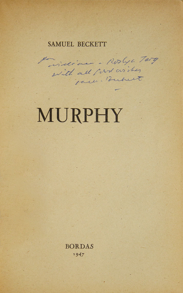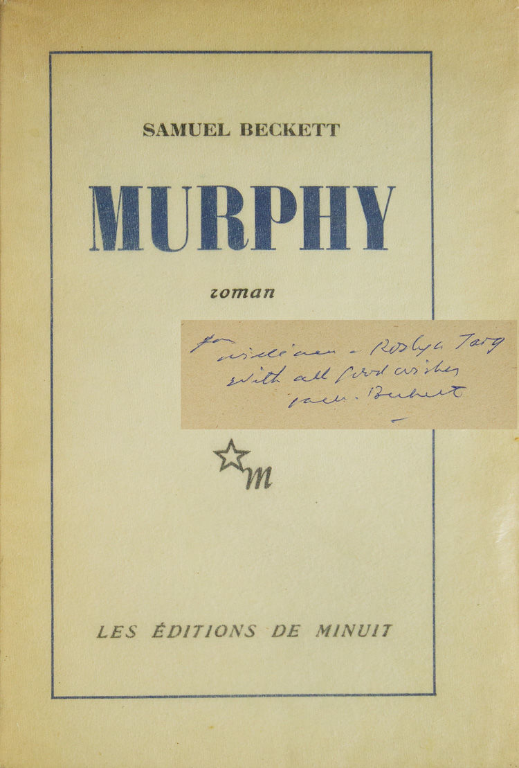 Paris: Bordas / Éditions de Minuit, 1954. First edition in French, second issue. 272 pp. 8vo. Original printed wrappers; glassine; unopened. Text evenly toned, otherwise fine. First edition in French, second issue. 272 pp. 8vo. First French edition, second issue. Inscribed on the title page, "For William & Roslyn Targ with all good wishes Sam Beckett." Beckett's first novel, written in English and originally published in 1938. This French translation appeared 9 years later under the Bordas imprint. At the end of 1953 Les Éditions de Minuit acquired some 2750 unsold copies from Bordas, and in early 1954 they reissued them under their own wrappers.