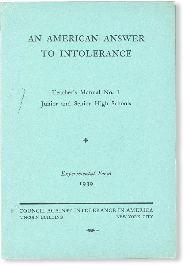 New York: Council Against Intolerance in America, 1939. First Edition. Octavo (23cm.); publisher's green card wrappers; 116pp.; staplebound bibliography pamphlet in chemise mounted inside rear cover. Light wear and a hint of toning, contemporary ownership rubberstamp to title page and rear cover, else Very Good and sound.