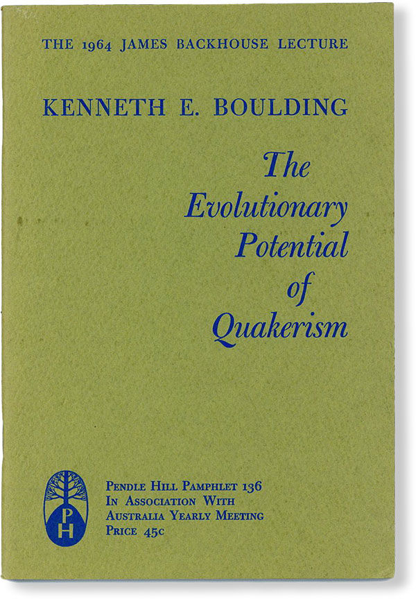 [Lebanon, PA: Pendle Hill], 1964. First Edition. Small octavo (19.5cm.); publisher's green staplebound card wrappers printed in blue; 31pp. Fine condition. The 1964 James Backhouse Lecture originally titled "The Quaker Mutation." Pendle Hill Pamphlet no. 136.