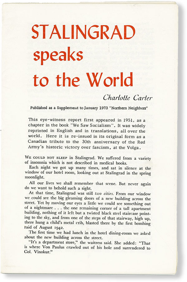 [Gravenhurst, ONT: Northern Book House], 1973. Octavo (21.5cm.); staplebound self-wrappers printed in red and black; 14pp. Near Fine. "Published as a Supplement to January 1973 'Northern Neighbors'" - upper cover. Reissue of an article first published in 1951 by the late Charlotte Carter, founder of Northern Book House and the "Northern Neighbors" magazine. One copy of this edition in OCLC as of June, 2020, at U. Kansas.