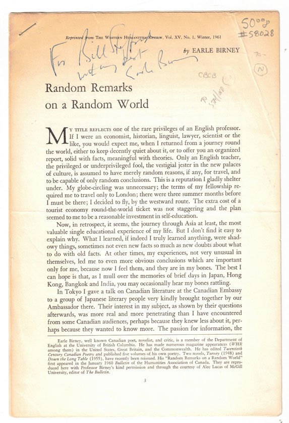Signed association copy. SIGNED. 10-page article stapled in the top left corner. Inscribed by the Canadian experimental poet, novelist, and critic, Earle Birney, to fellow poet Bill Stafford at the head of the article.