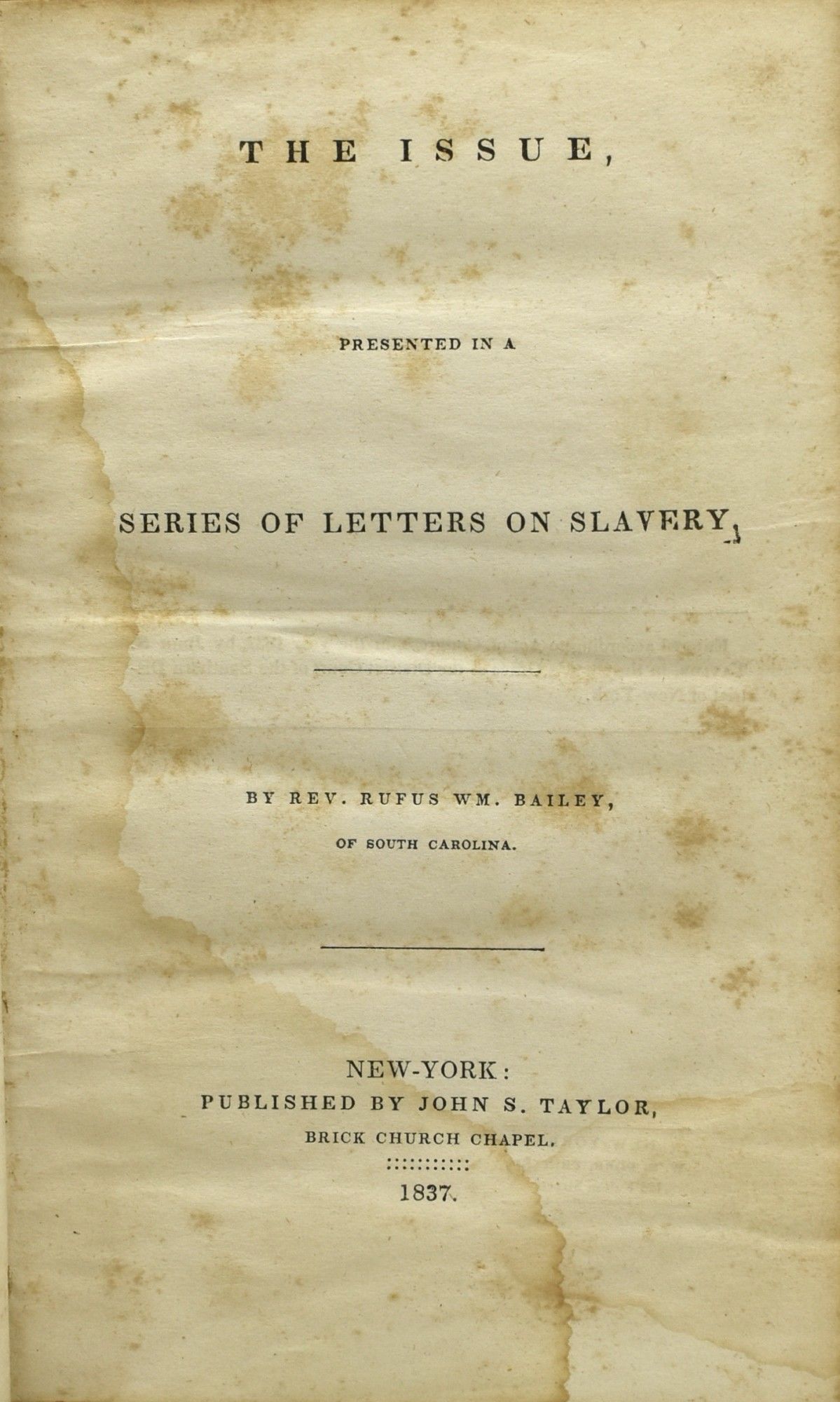 [[AFRICAN-AMERICAN] SLAVERY; COLONIZATION] THE ISSUE, PRESENTED IN A SERIES OF LETTERS ON SLAVERY