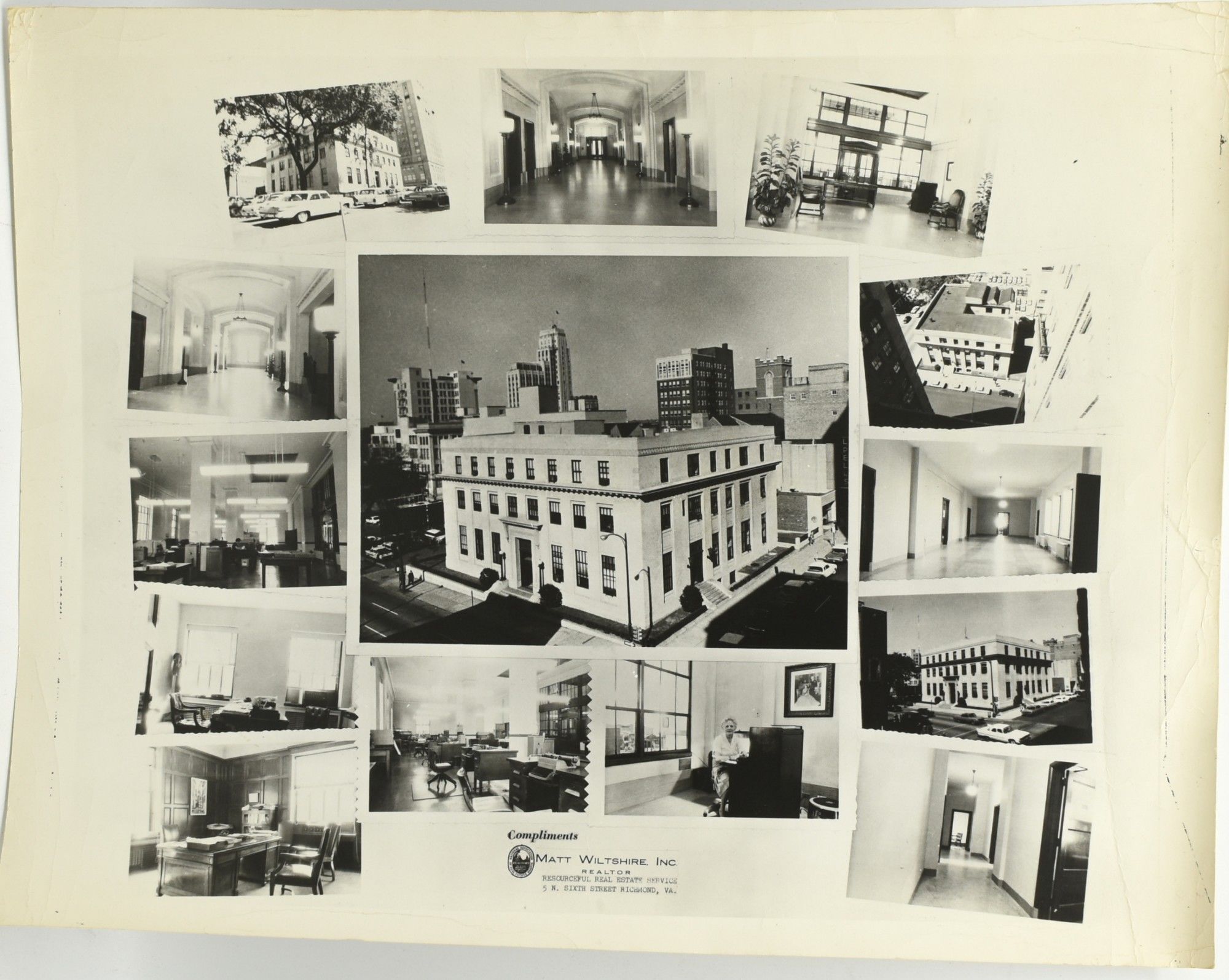 A montage of 14 photographs showing the exterior as well as a number of interior views of the Imperial Tobacco Company building at the corner of Fifth and Franklin Streets in Richmond. The three-story Federal style office building was built to house the American branch of the London tobacco company; it was sold, we believe, in the late 1960's. In now provides a home for the Richmond Free Press. The landmark building appears to have been markets by Matt Wiltshire, Inc. Realtor.~~11 x 14"; black and white; matte paper.