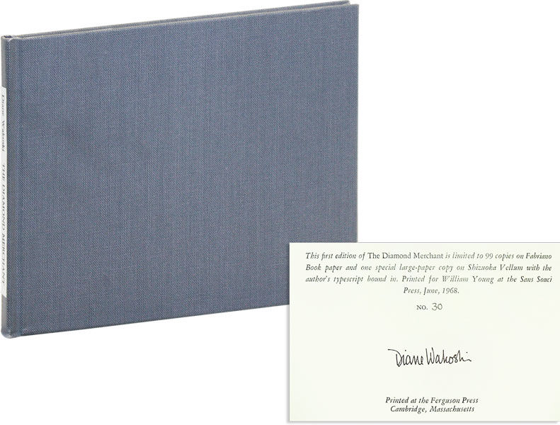 Cambridge: The Sans Souci Press, 1968. First Edition. One of 99 numbered copies signed by the author, this being copy no.30. Oblong octavo (19.25cm); blue-gray cloth-covered boards, with printed title label mounted to spine; [vi],[2],3-34,[8]pp. A Fine copy, lacking the dustjacket. An attractive volume containing two long poems, letterpress printed on Fabriano paper.