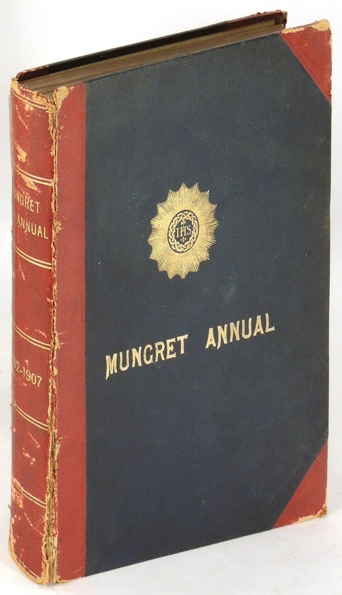 Limerick, Ireland: Mungret College, 1907. Hardcover. Good. Hardcover. The yearbook for Mungret College, a Jesuit school near Limerick, Ireland, which was open from 1882 through 1974. It also served as a small secondary school with about 200 boarders. This collection includes several songs and/or articles in Gaelic; however, most of the text is in English. Photographic illustrations and articles about the school, town of Limerick, students, and staff are included. Each of the five included annual issues has about 70 pages. Bound in three quarter red leather over black cloth boards with gilt title to spine and front cover. Both hinges are cracked and the boards are a bit loose, but remain attached. Writing in pen to front free endpaper, and occasional smudge marks to margins, but clean overall. One page is torn down the middle and half of the page (which had an illustration) is no longer present. An interesting look into the history of this small Irish school. Size: Quarto. EDU/061820.
