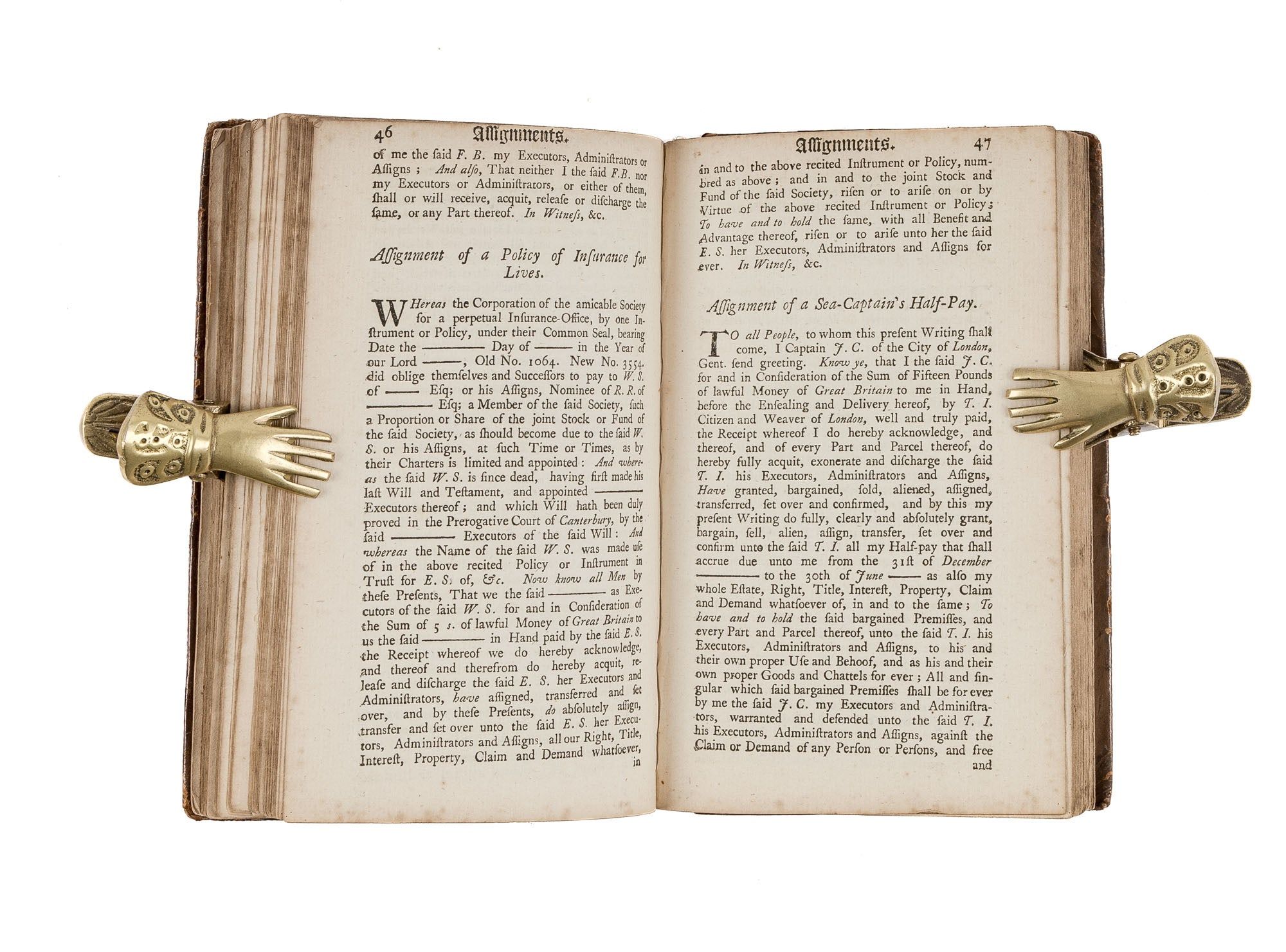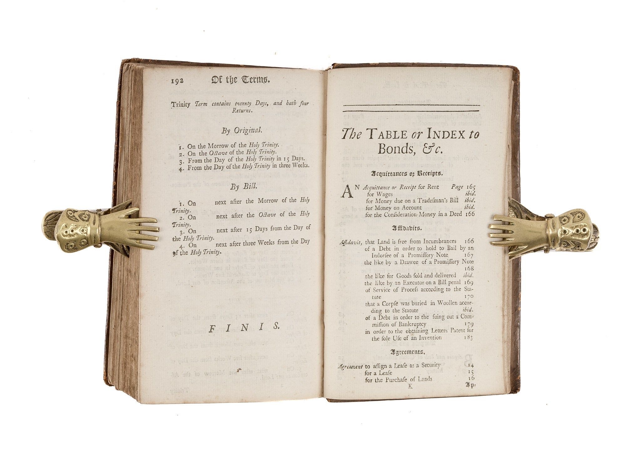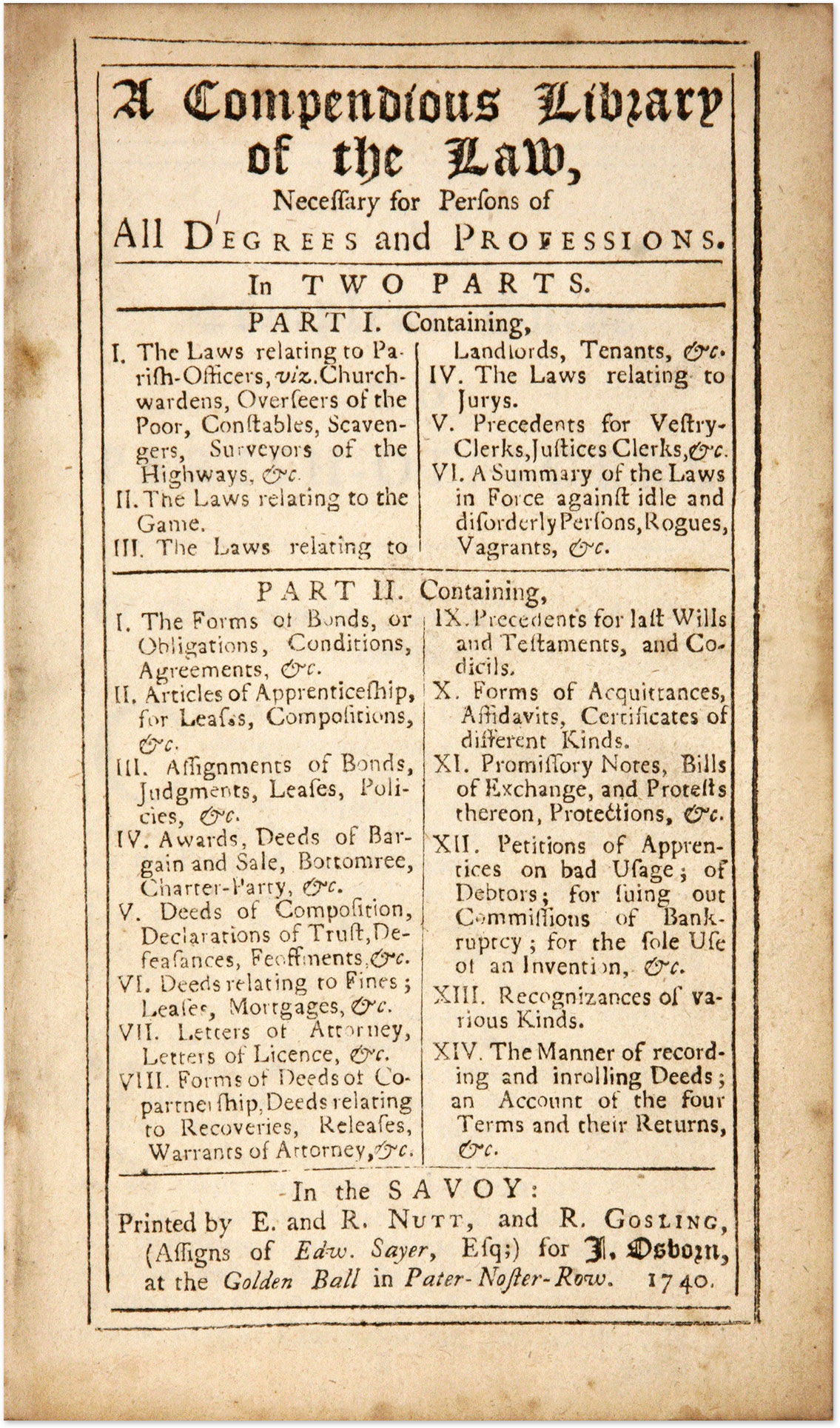 1740. London: E. and R. Nutt, And R. Gosling, 1740.. London: E. and R. Nutt, And R. Gosling, 1740. A Compact Gentleman's Law Library [Great Britain]. A Compendious Library of the Law: Necessary for Persons of All Degrees and Professions. In Two Parts. Part I. Containing, I. The Laws Relating to Parish-Officers, Viz. Church-Wardens, Overseers of the Poor, Constables, Scavengers, Surveyors of the Highways, &c. II. The Laws Relating to the Game. III. The Laws Relating to Landlords, Tenants, &c. IV. The Laws Relating to Juries. V. Precedents for Vestry-Clerks, Justices Clerks, &c. VI. A Summary of the Laws in Force Against Idle and Disorderly Persons, Rogues, Vagrants, &c. Part II. Containing, I. The Forms of Bonds, Or Obligations, Conditions, Agreements, &c. II. Articles of Apprenticeship, For Leases, Compositions, &c. III. Assignments of Bonds, Judgments, Leases, Policies, &c. IV. Awards, Deeds of Bargain and Sale, Bottomree, Charter-Party, &c. V. Deeds of Composition, Declarations of Trust, Defeasances, Feoffments, &c. VI. Deeds Relating to Fines, Leases, Mortgages, &c. VII. Letters of Attorney, Letters of Licence, &c. VIII. Forms of Deeds of Copartnership, Deeds Relating to Recoveries, Releases, Warrants of Attorney, &c. IX. Precedents for Last Wills and Testaments, And Codicils. X. Forms of Acquittances, Affidavits, Certificates of Different Kinds. XI. Promissory Notes, Bills of Exchange, And Protests Thereon, Protections, &c. XII. Petitions of Apprentices on Bad Usage, Of Debtors, For Suing Out Commissions of Bankruptcy, For the Sole Use of an Invention, &c. XIII. Recognizances of Various Kinds. XIV. The Manner of Recording and Inrolling Deeds, And Account of the Four Terms and Their Returns, &c. [London]: Printed by E. and R. Nutt, And R. Gosling, 1740. Two parts. [ii], 196, [8]; 192, [8] pp. 12mo. (6-1/2" x 4"). Contemporary calf, blind rules to boards, blind fillets along joints, raised bands to unlettered spine. Light rubbing and a few minor scuffs and faint stains to boards, moderate rubbing to extremities, spine ends worn away, boards beginning to separate but secure, corners bumped and somewhat worn, front free endpaper lacking. Light toning, two signatures detached, light soiling to title page. $450. * First edition. This handbook covered the most common civic obligations and legal matters that occurred in the life of a gentleman, professional or tradesman. A well-received work, it went through two more editions i.
