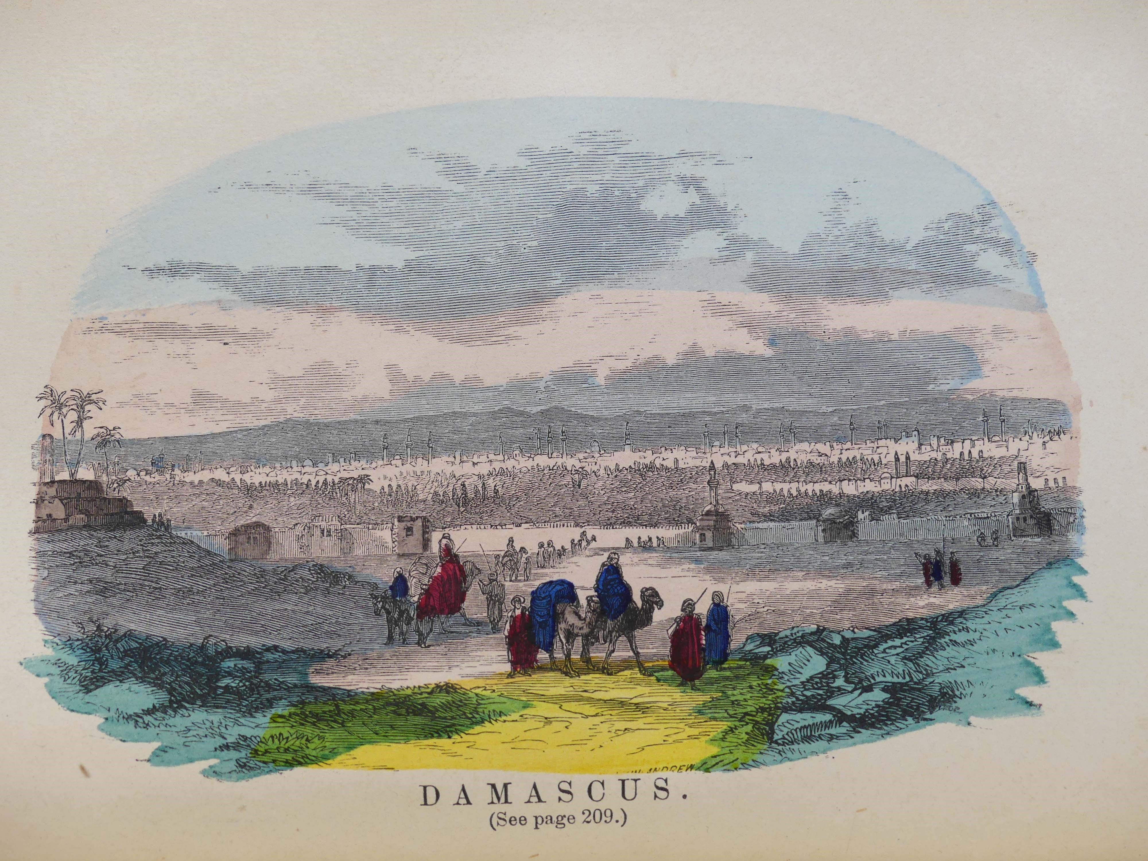 New York: H. Dayton, 1860. Hard Cover. Very Good/No Jacket. Ink gift note on front endpaper, faint stain on corner of first few pages. 1860 Hard Cover. xii, [13]-240 pp. 12mo. Light brown cloth, gilt titles, blind-stamped borders. Hand-colored engraved frontispiece of Damascus, engraved plates and cuts throughout text. An illustrated travelogue of the Middle East and Asia, published by J.N. Stearns under the pseudonym 'Uncle Merry'.
