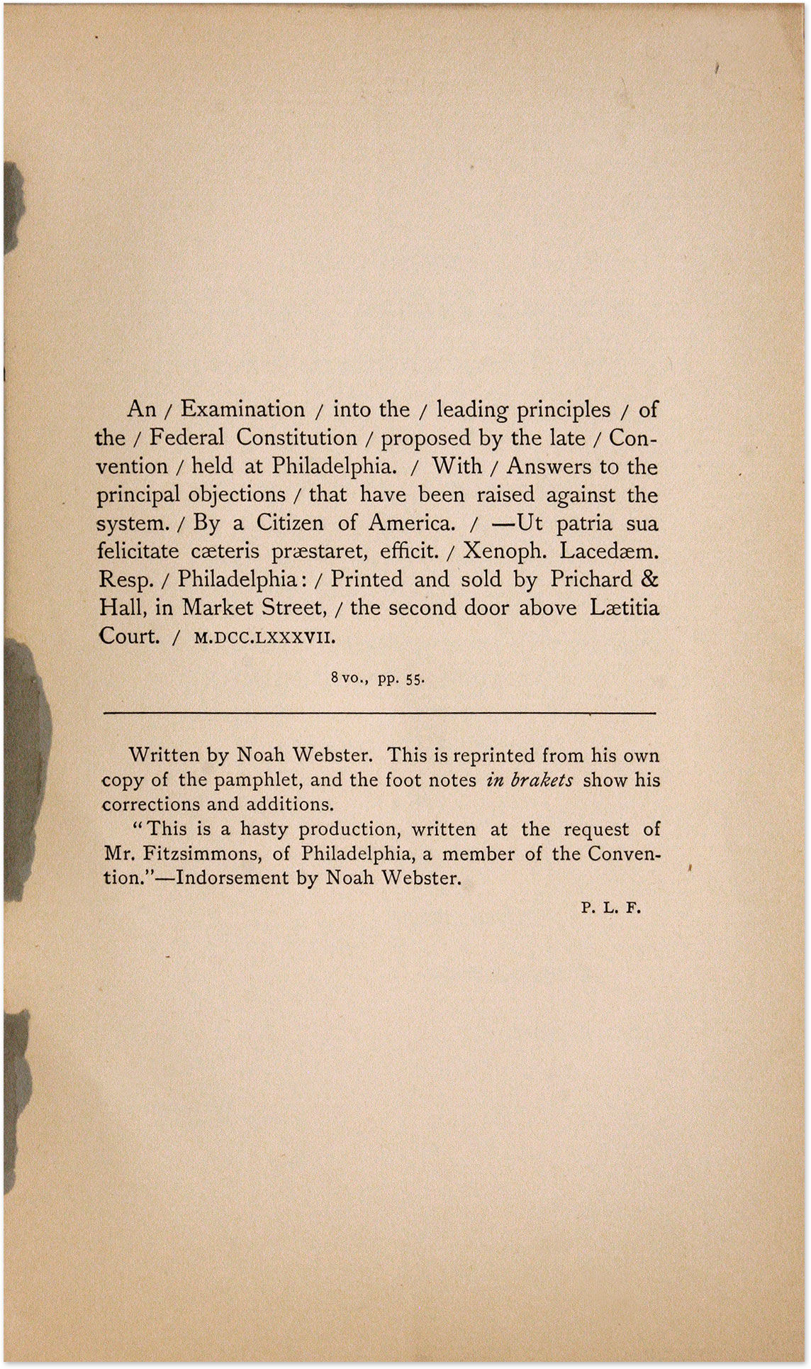 1888. Brooklyn, NY: s.n., 1888]. 55 pp.. Brooklyn, NY: s.n., 1888]. 55 pp. Noah Webster Promotes Ratification of the US Constitution [Webster, Noah (1758-1843)]. Ford, Paul Leicester [1865-1902], Editor. An Examination Into the Leading Principles of the Federal Constitution Proposed by the Late Convention Held at Philadelphia: With Answers to the Principal Objections That Have Been Raised Against the System. Philadelphia: Printed and Sold by Pritchard & Hall, 1787. Reprint. [Brooklyn, NY: s.n., 1888]. 55 pp. Octavo (9-1/2" x 6"). Stab-stitched pamphlet in plain paper wrappers, untrimmed fore and bottom-edges. A few finger smudges, some wear to spine ends, front wrapper re-attached with archival tape, small tear to fore-edge of front wrapper, light toning to interior, several uncut signatures. $150. * Only edition. "Written by Noah Webster. This is reprinted from his own copy of the pamphlet, and the foot notes in brackets show his corrections and additions" (editor's note).