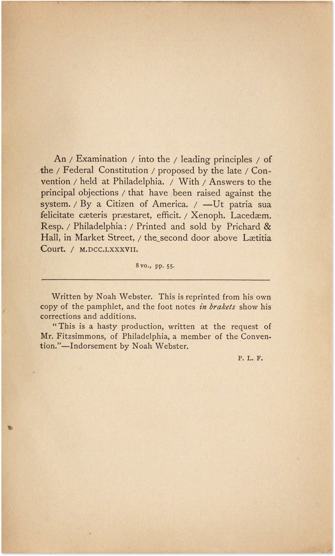 1888. Brooklyn, NY: s.n., 1888]. 55 pp.. Brooklyn, NY: s.n., 1888]. 55 pp. Noah Webster Promotes Ratification of the US Constitution [Webster, Noah (1758-1843)]. Ford, Paul Leicester [1865-1902], Editor. An Examination Into the Leading Principles of the Federal Constitution Proposed by the Late Convention Held at Philadelphia: With Answers to the Principal Objections That Have Been Raised Against the System. Philadelphia: Printed and Sold by Pritchard & Hall, 1787. Reprint. [Brooklyn, NY: s.n., 1888]. 55 pp. Octavo (9-1/2" x 6"). Stab-stitched pamphlet in plain paper wrappers, untrimmed fore and bottom-edges. Some wear to spine ends, light toning to interior. $150. * Only edition. "Written by Noah Webster. This is reprinted from his own copy of the pamphlet, and the foot notes in brackets show his corrections and additions" (editor's note).