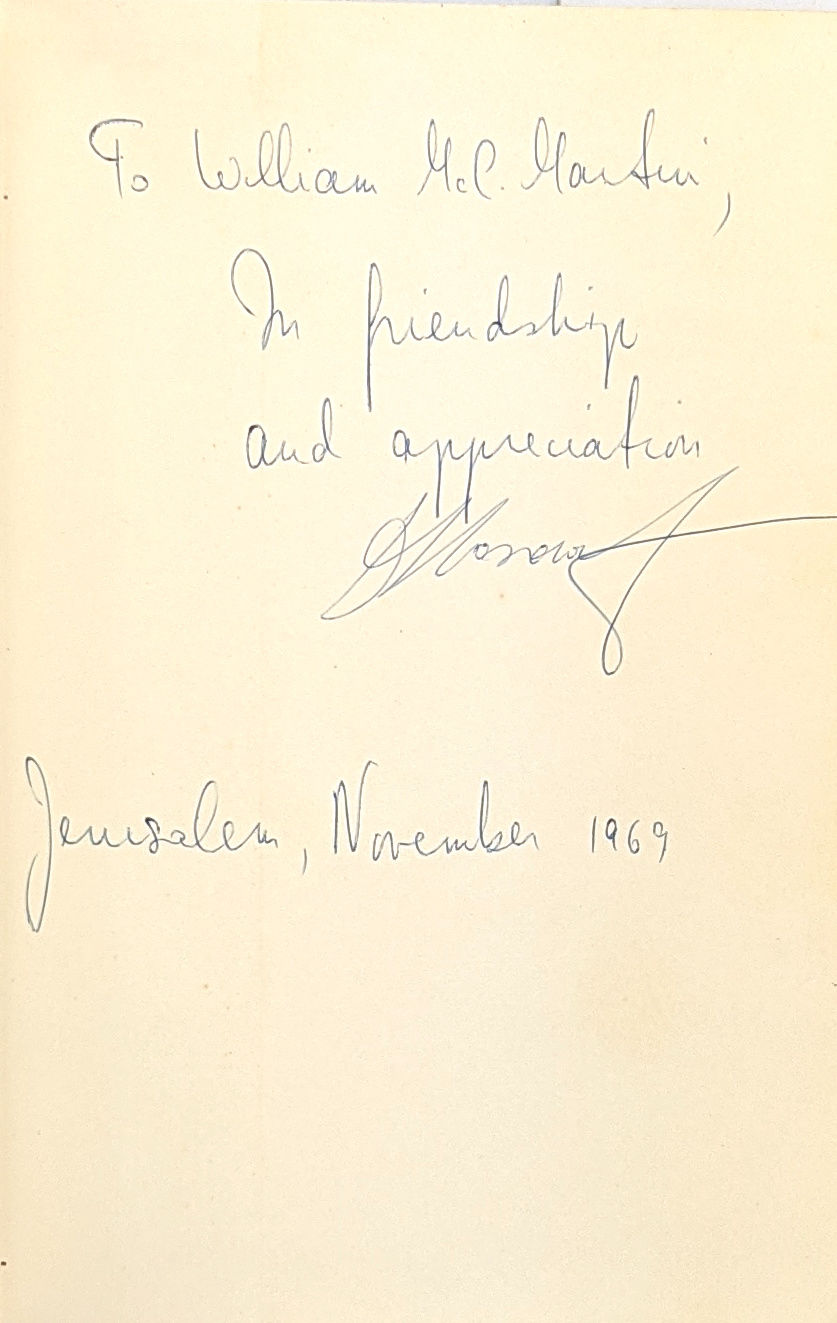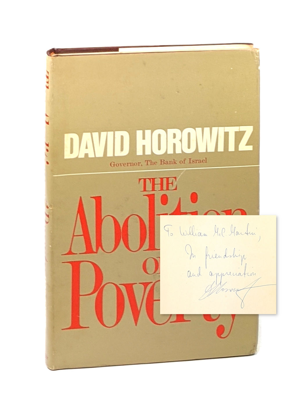 New York: Praeger Publishers, 1969. Very Good/Very Good. New York: Praeger Publishers, 1969. First Edition. Signed by Horowitz to Martin with inscription, "To William McC. Martin, / In friendship / and appreciation / David Horowitz / Jerusalem, November 1969." William McChesney Martin, Jr. was the longest serving Chairman of the Federal Reserve, serving under five Presidents and holding the post until January, 1970.