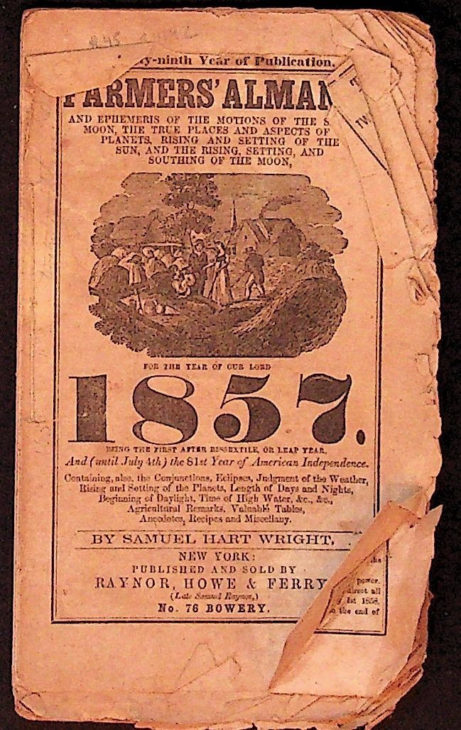 New York: Raynor, Howe, & Ferry, 1857. Paperback. Very Good. Paperback. Includes a page of recipes involving corn meal: corn cakes, corn and wheat bread, buckwheat cakes, corn meal pudding, and fritters. Original paper wrappers with black title to front cover. Bound with string. Most corners are creased and folded. Small tears / chipping to margins of many pages. Writing in pencil on a few pages. Occasional foxing. Very good overall. 36 pages. Almanacs. ALM/070220.