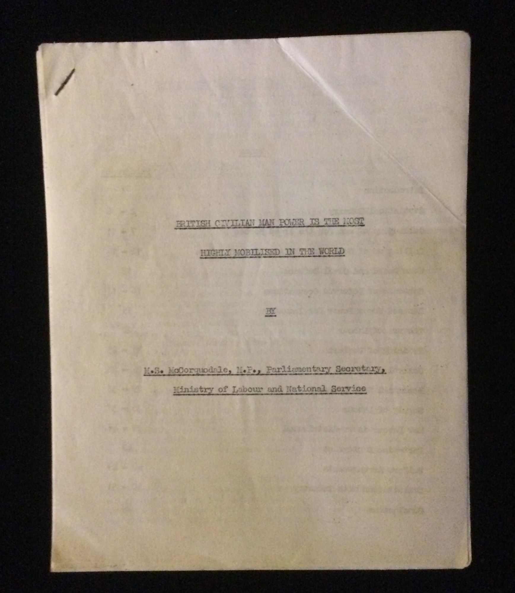 London: (Parliament), 1943. No Binding. Good. Mimeographed copy of the original, typed manuscript of WWII, 11 page report by Malcolm McCorquodale, the Parliamentary Secretary of the Ministry of Labour and National Service. on the UK manpower supply for the war effort. McCorquodale, was M.P., Conservative Party. Undated, but statistics referred to in the detailed report are 1942. Other references to this report show that it was published by British Information Services (NY) on September 27, 1943.