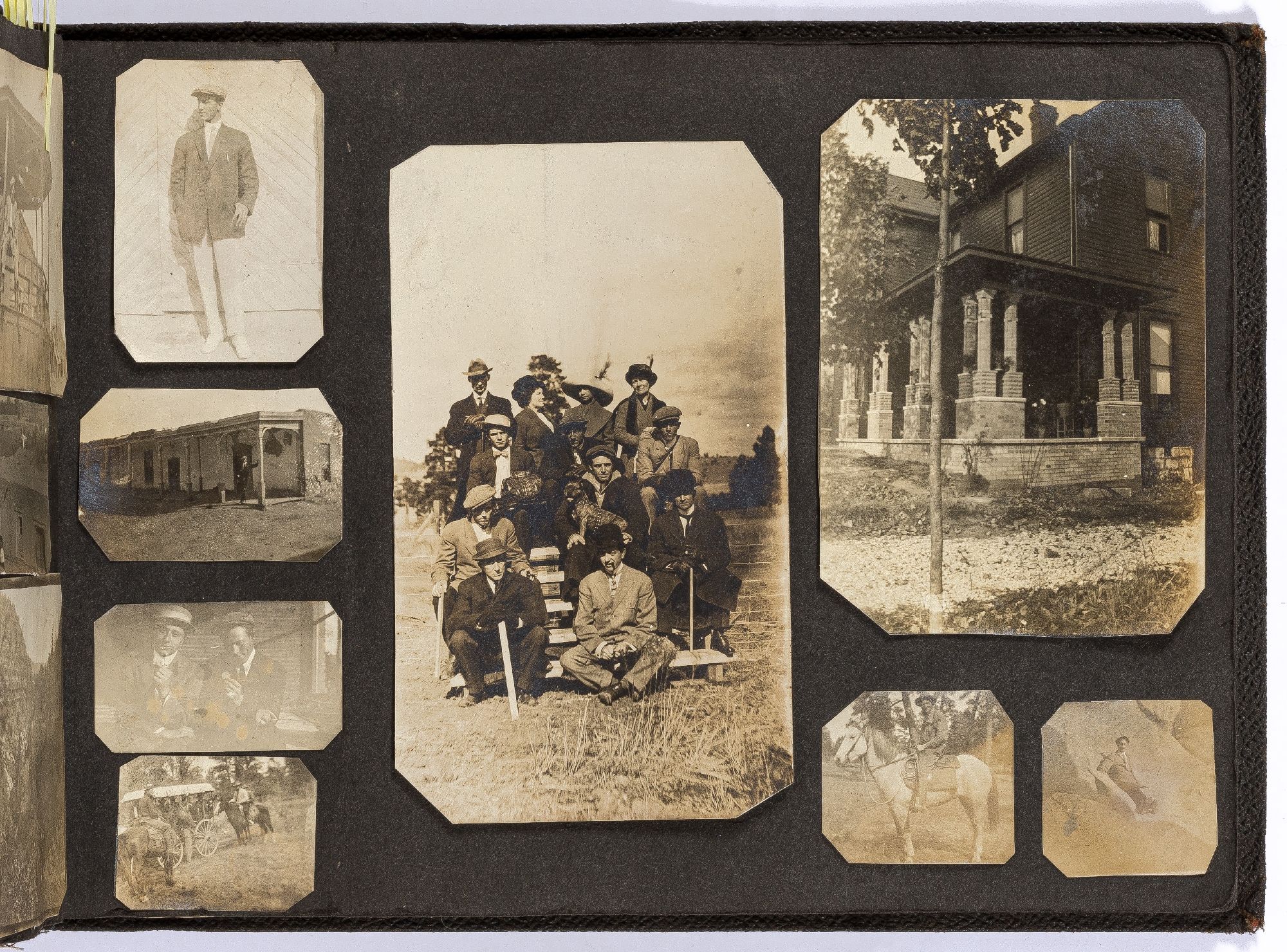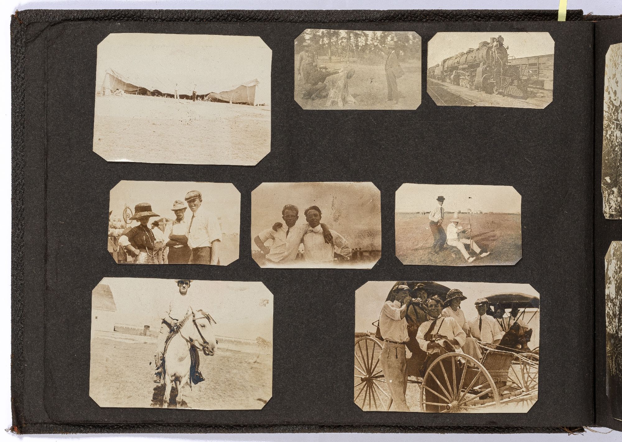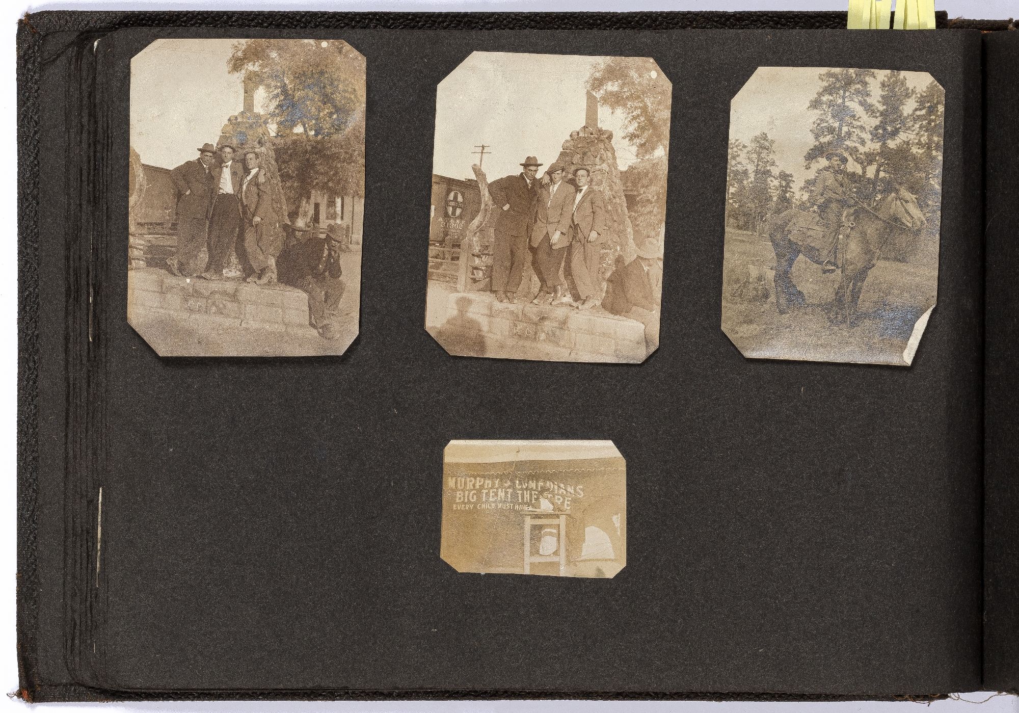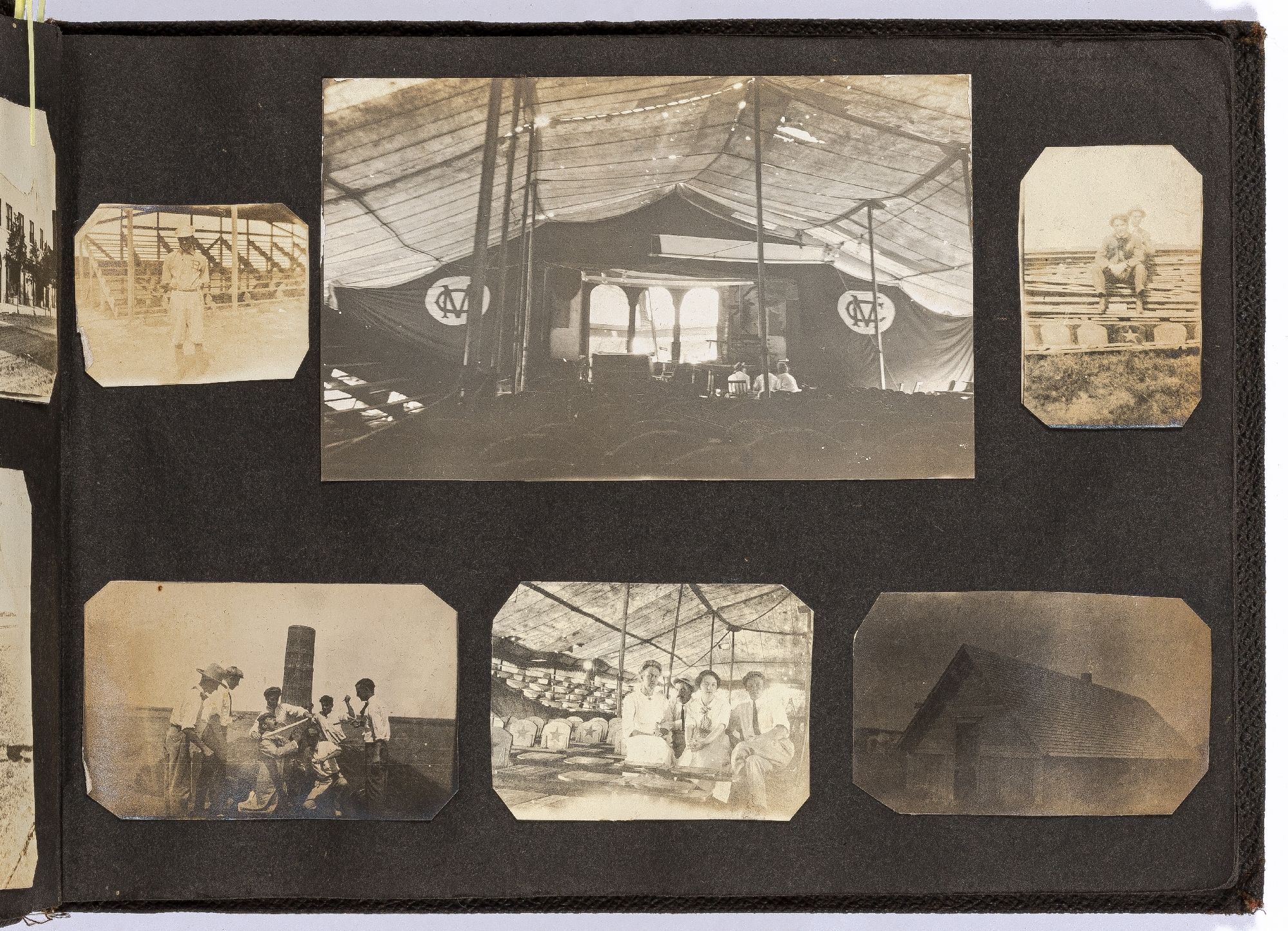 A photo album compiled by a vaudeville performer with Murphy’s Comedians around 1915. The album begins with a group shot of performers in costume behind a tent in their backstage area. Performers, both men and women, are seen practicing instruments and acts backstage, during their leisure time, and setting up the tents. One of the tents is seen during set up with the “MC” banners for Murphy’s Comedians on either side of the stage. Another shows two men standing on the canvas and beams of a disassembled tent. Throughout the album the performers are seen traveling around the country with images of locomotives, horse drawn wagons, and automobiles. When not performing the troupe is spends their time playing baseball, picnicking, reading, and boating. Murphy’s Comedian’s show had an emphasis on stories from the American West including *The Last Roundup*, which they describe as “the greatest play of the Western Plains.”