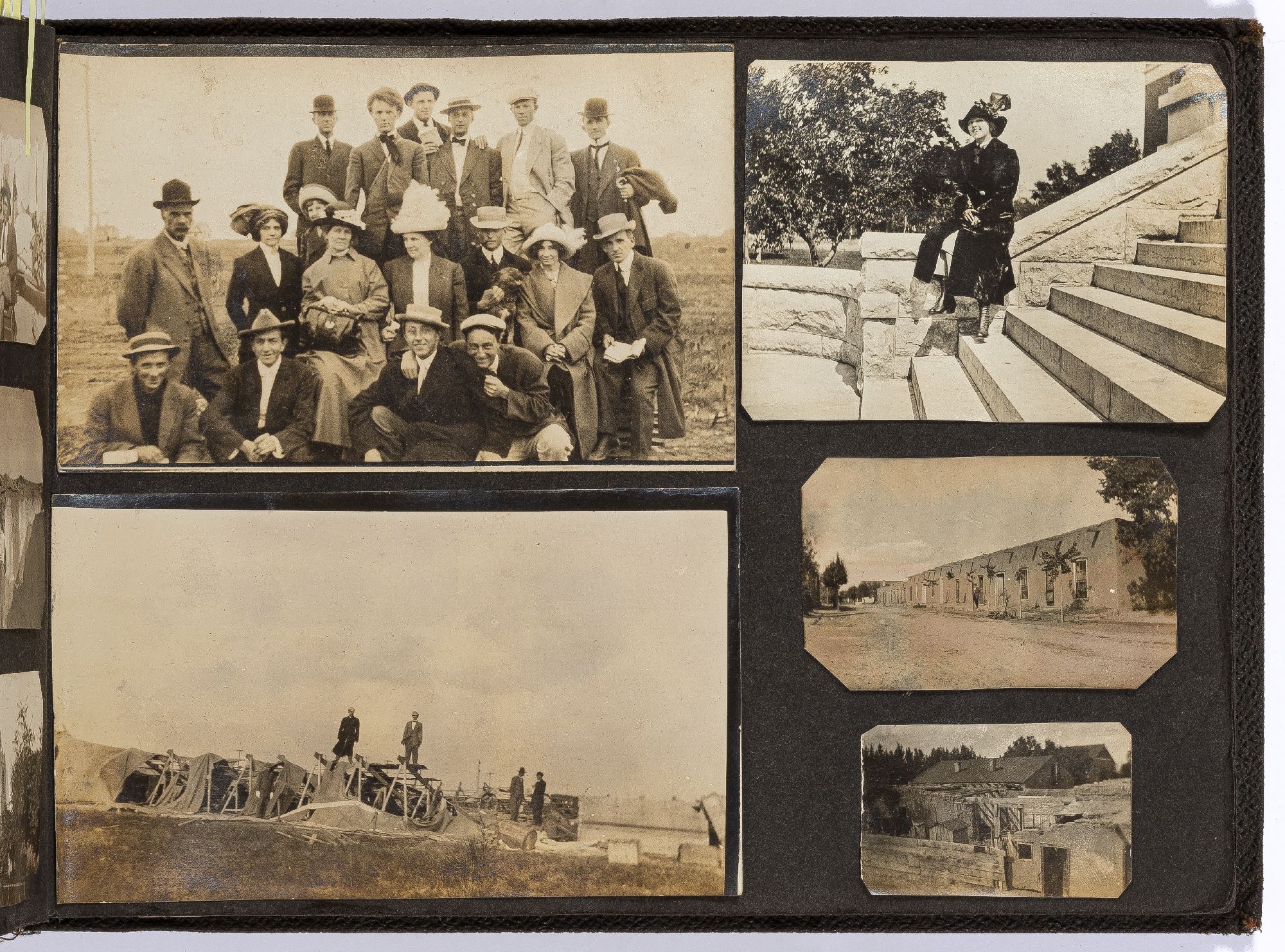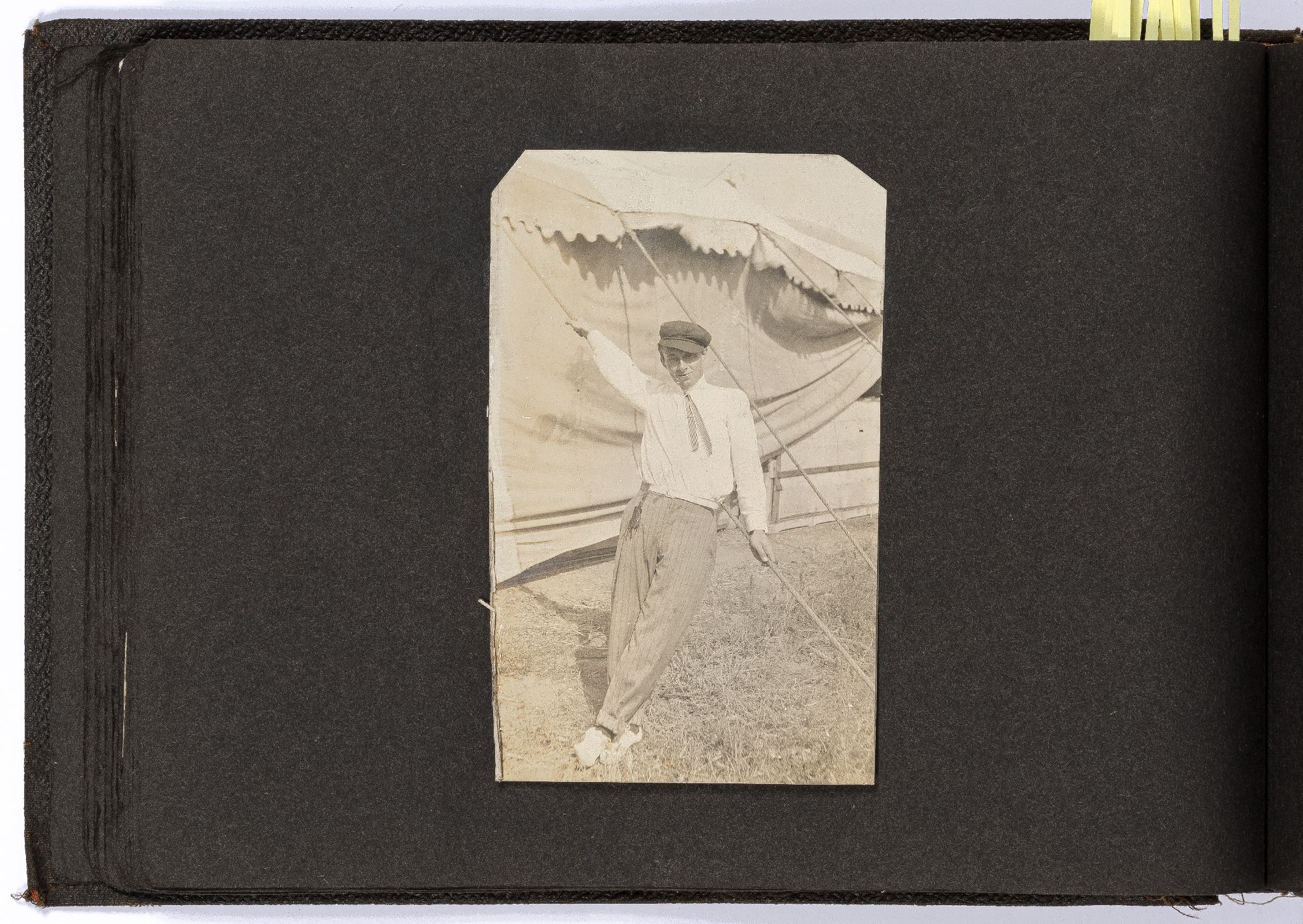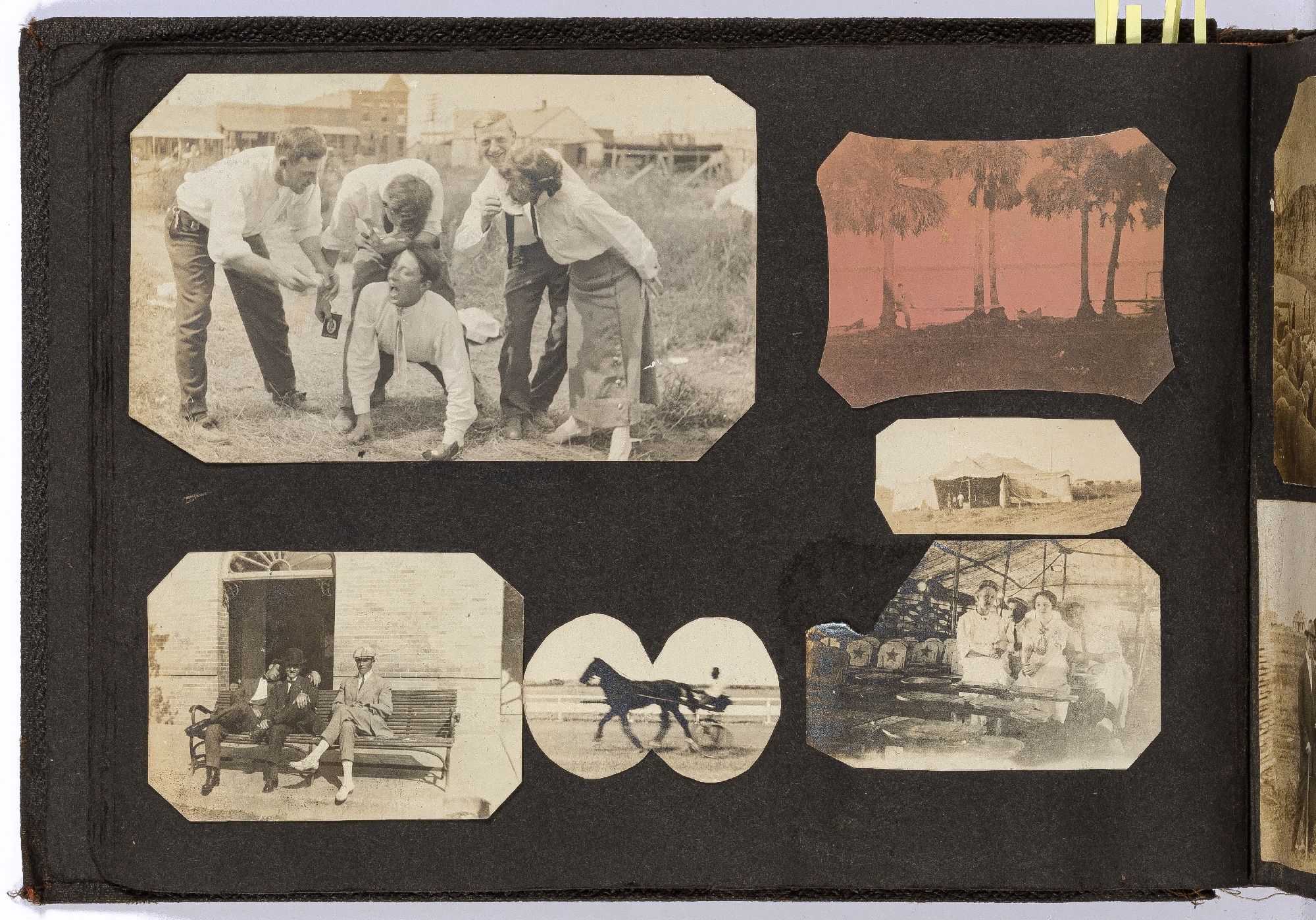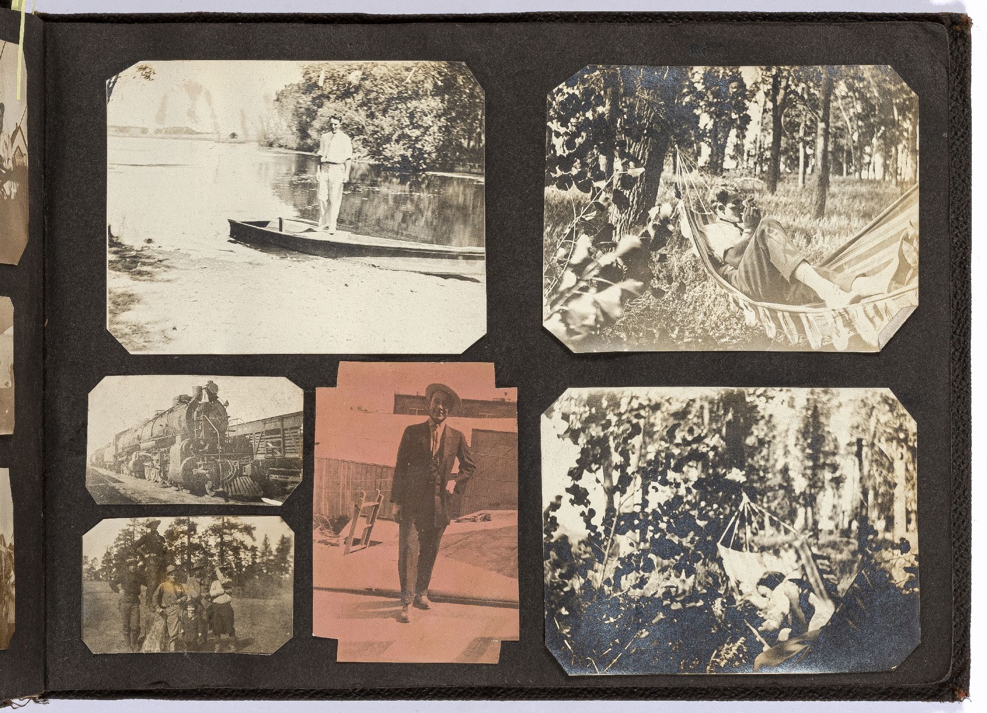 A photo album compiled by a vaudeville performer with Murphy’s Comedians around 1915. The album begins with a group shot of performers in costume behind a tent in their backstage area. Performers, both men and women, are seen practicing instruments and acts backstage, during their leisure time, and setting up the tents. One of the tents is seen during set up with the “MC” banners for Murphy’s Comedians on either side of the stage. Another shows two men standing on the canvas and beams of a disassembled tent. Throughout the album the performers are seen traveling around the country with images of locomotives, horse drawn wagons, and automobiles. When not performing the troupe is spends their time playing baseball, picnicking, reading, and boating. Murphy’s Comedian’s show had an emphasis on stories from the American West including *The Last Roundup*, which they describe as “the greatest play of the Western Plains.”