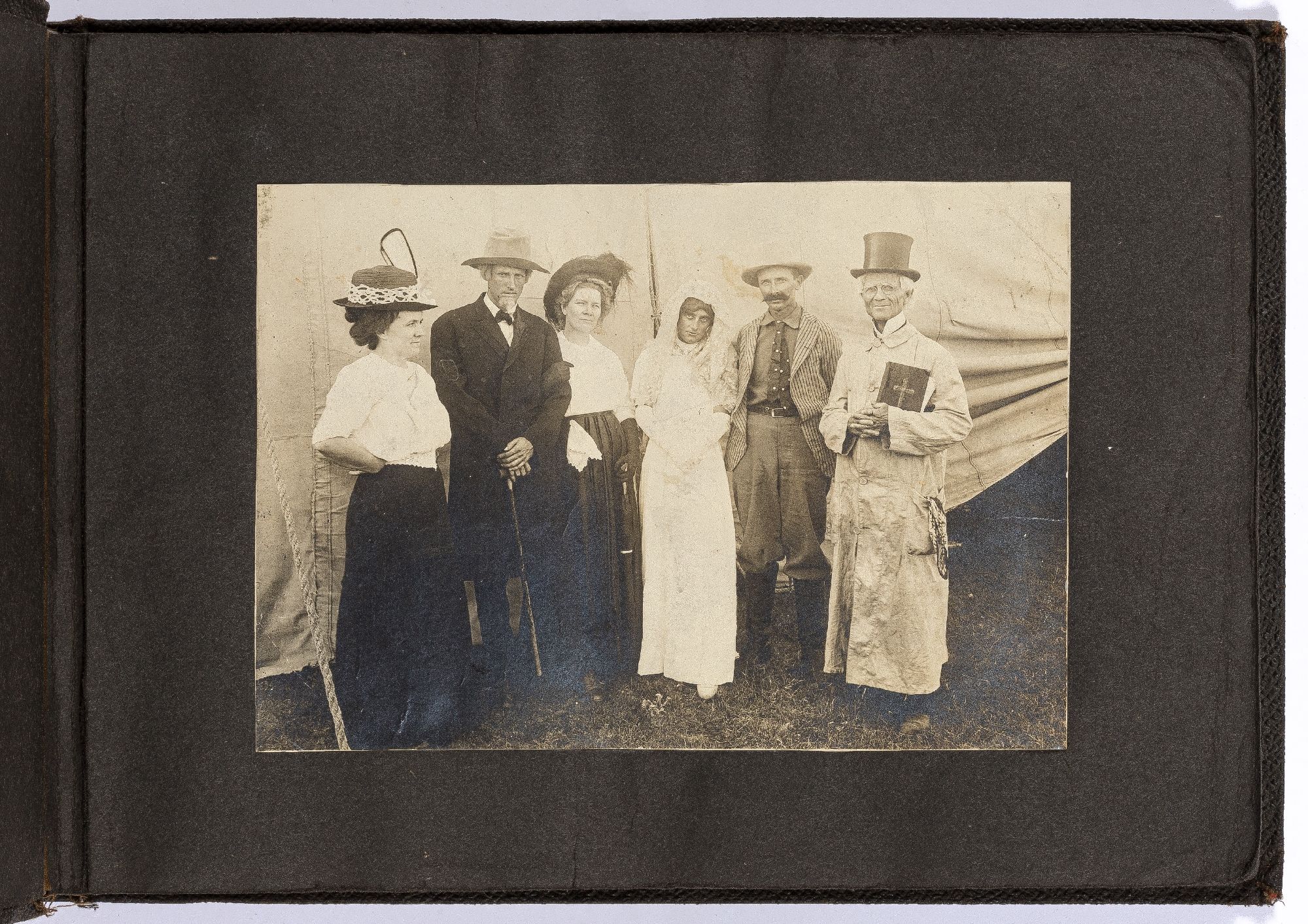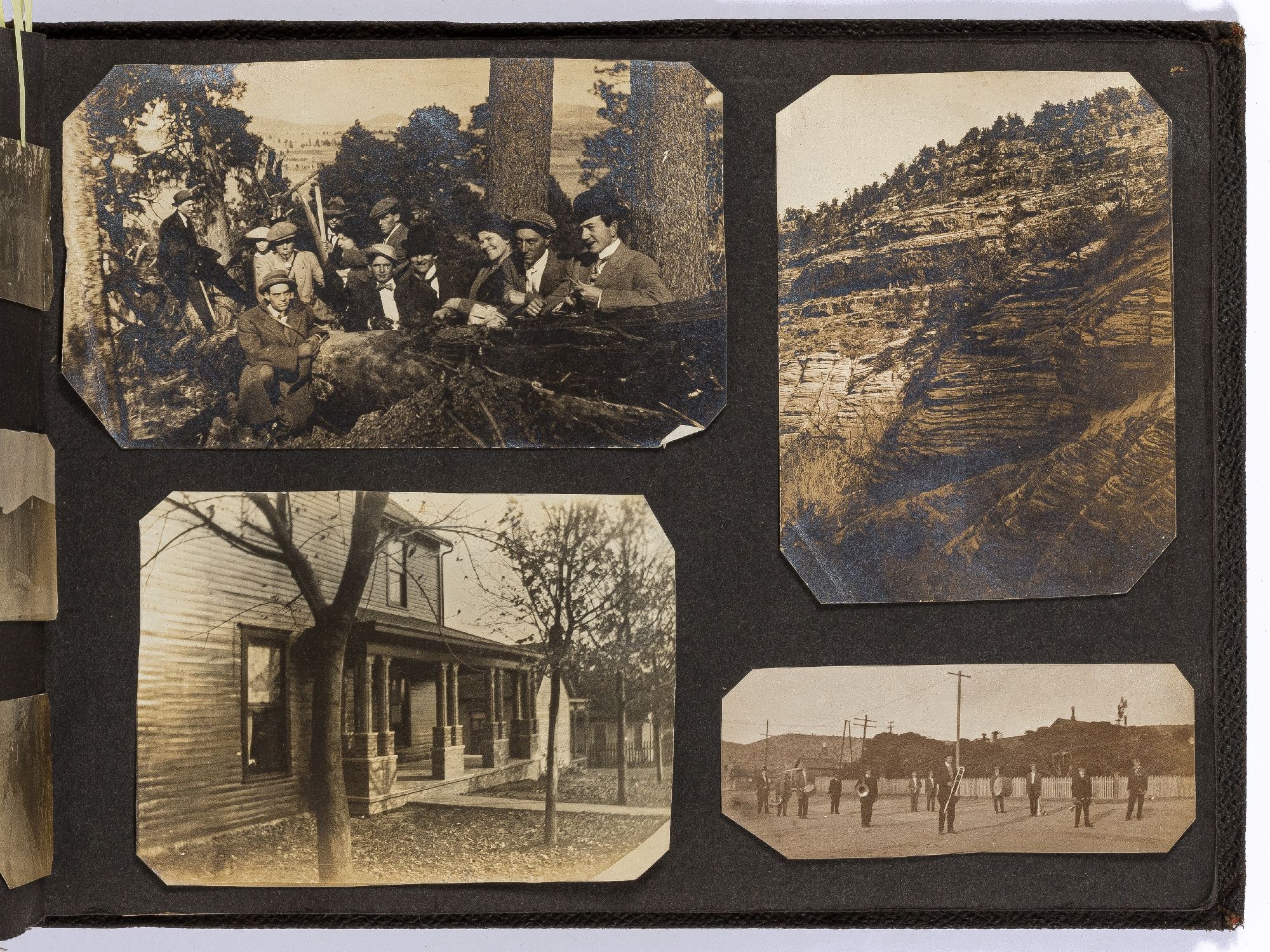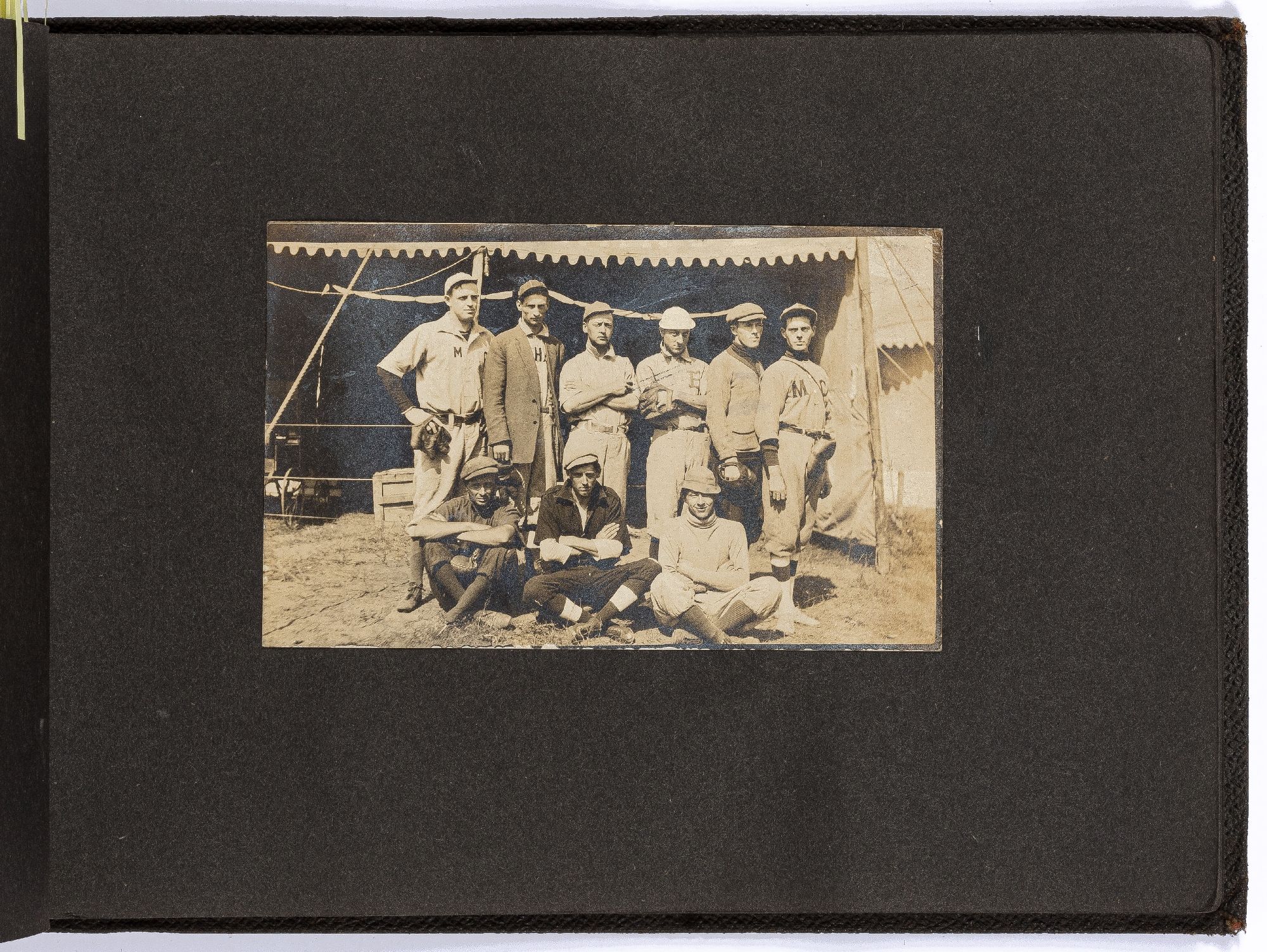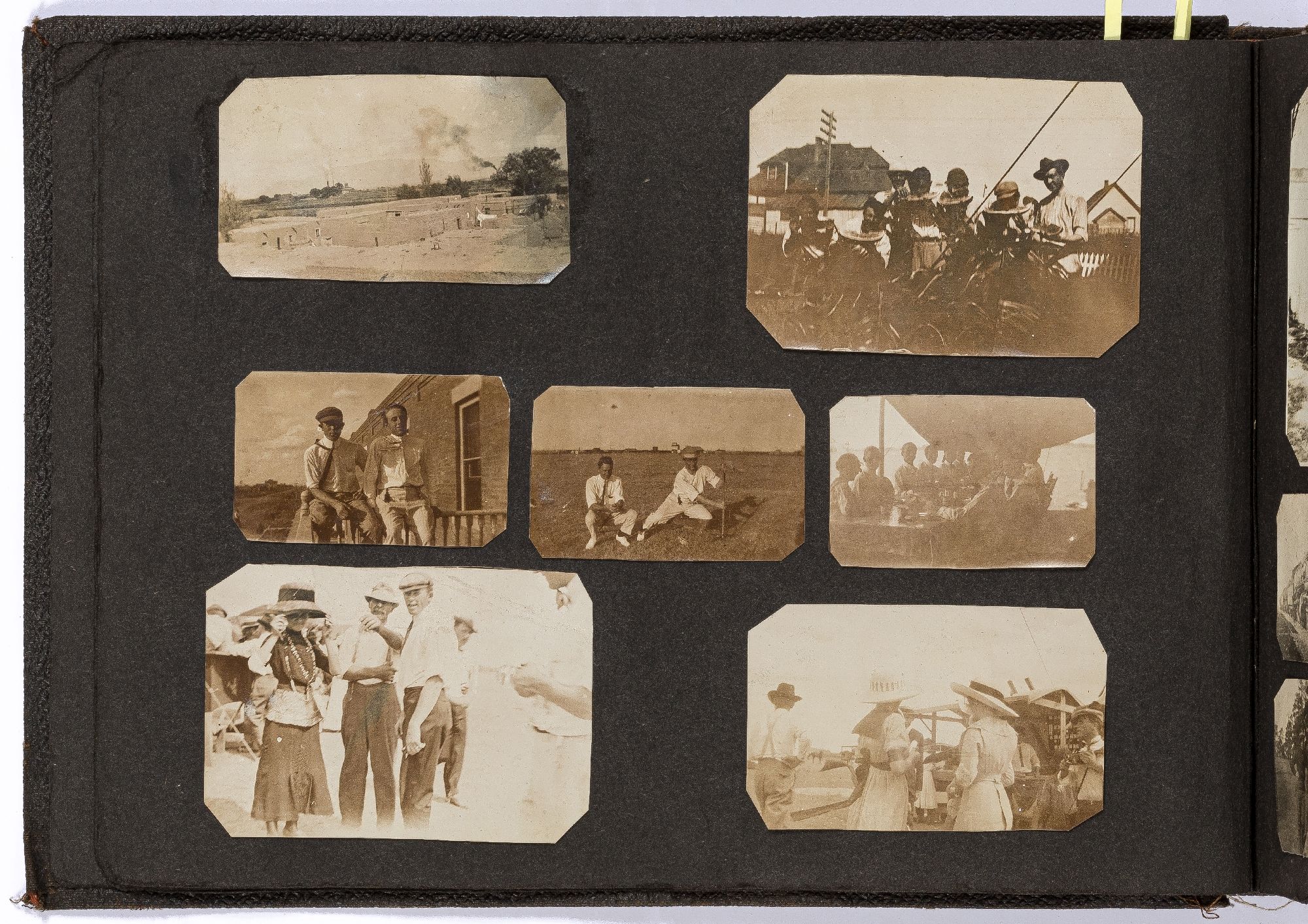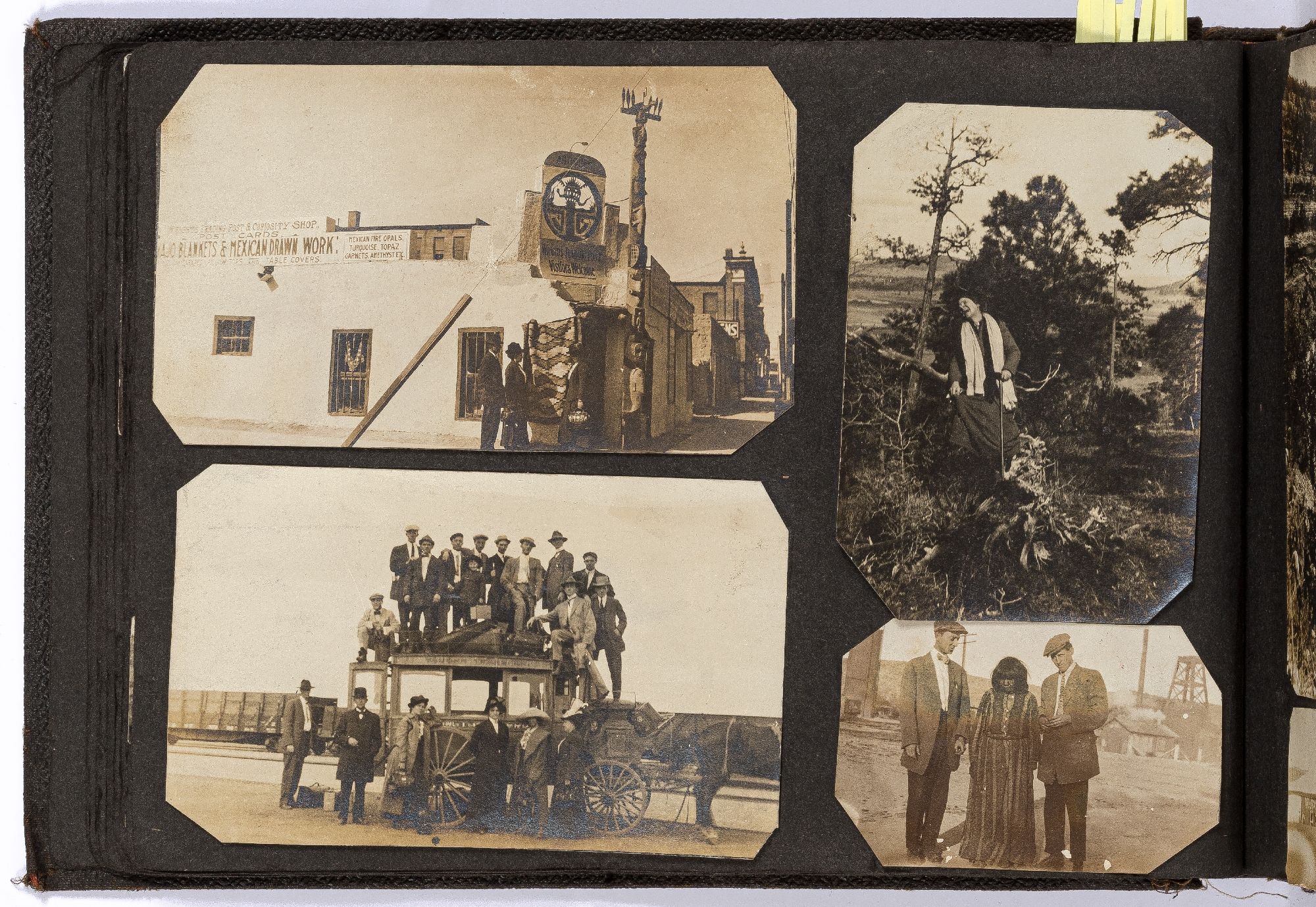 A photo album compiled by a vaudeville performer with Murphy’s Comedians around 1915. The album begins with a group shot of performers in costume behind a tent in their backstage area. Performers, both men and women, are seen practicing instruments and acts backstage, during their leisure time, and setting up the tents. One of the tents is seen during set up with the “MC” banners for Murphy’s Comedians on either side of the stage. Another shows two men standing on the canvas and beams of a disassembled tent. Throughout the album the performers are seen traveling around the country with images of locomotives, horse drawn wagons, and automobiles. When not performing the troupe is spends their time playing baseball, picnicking, reading, and boating. Murphy’s Comedian’s show had an emphasis on stories from the American West including *The Last Roundup*, which they describe as “the greatest play of the Western Plains.”