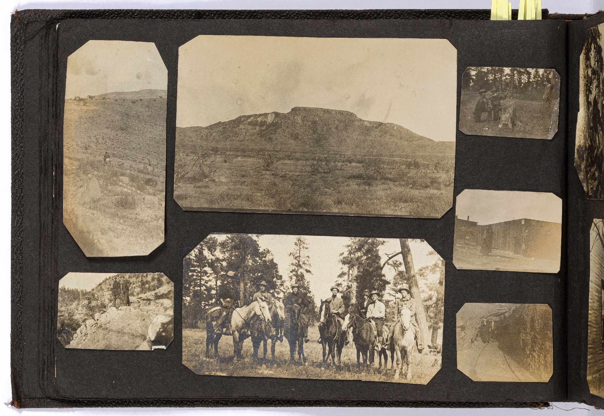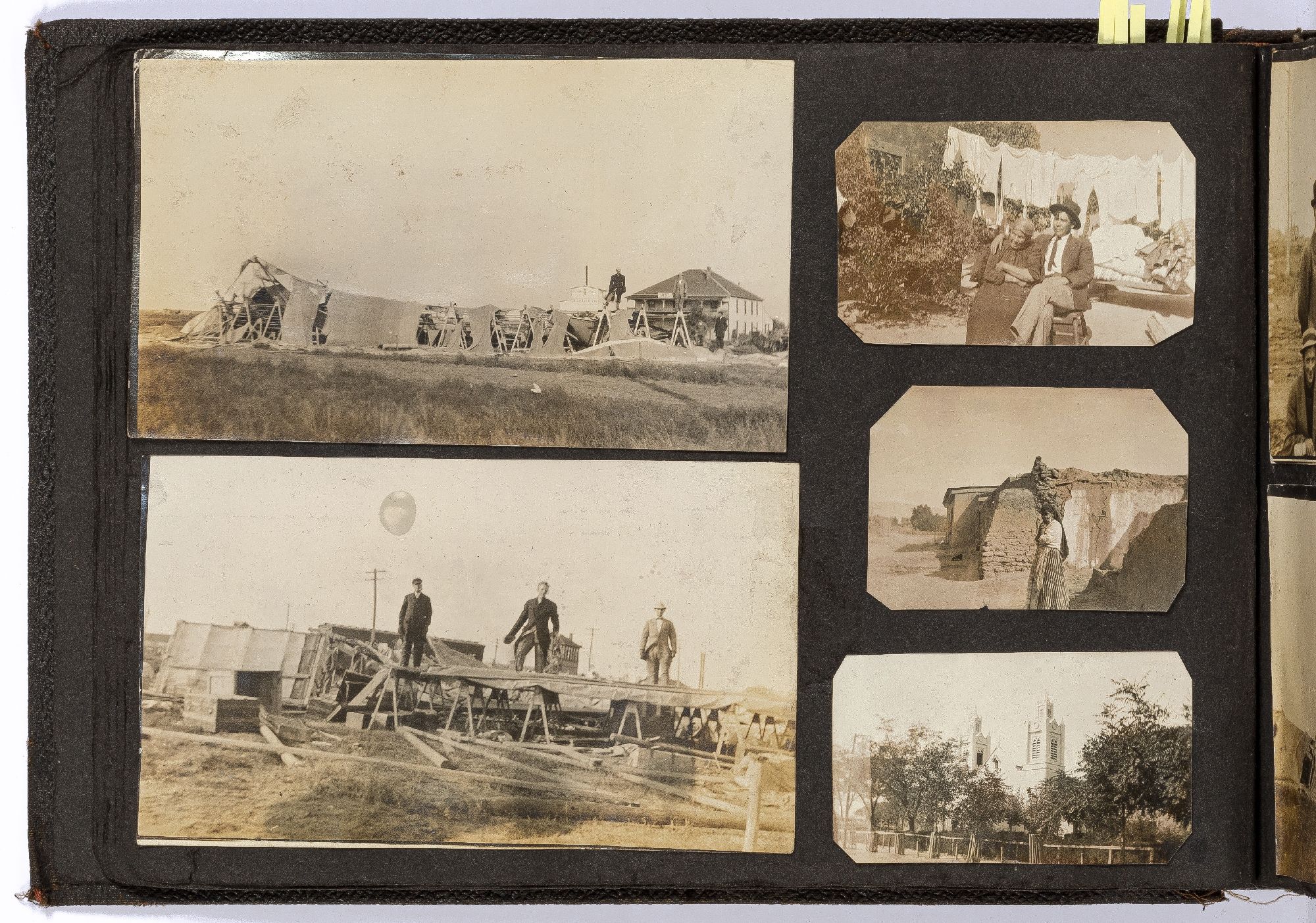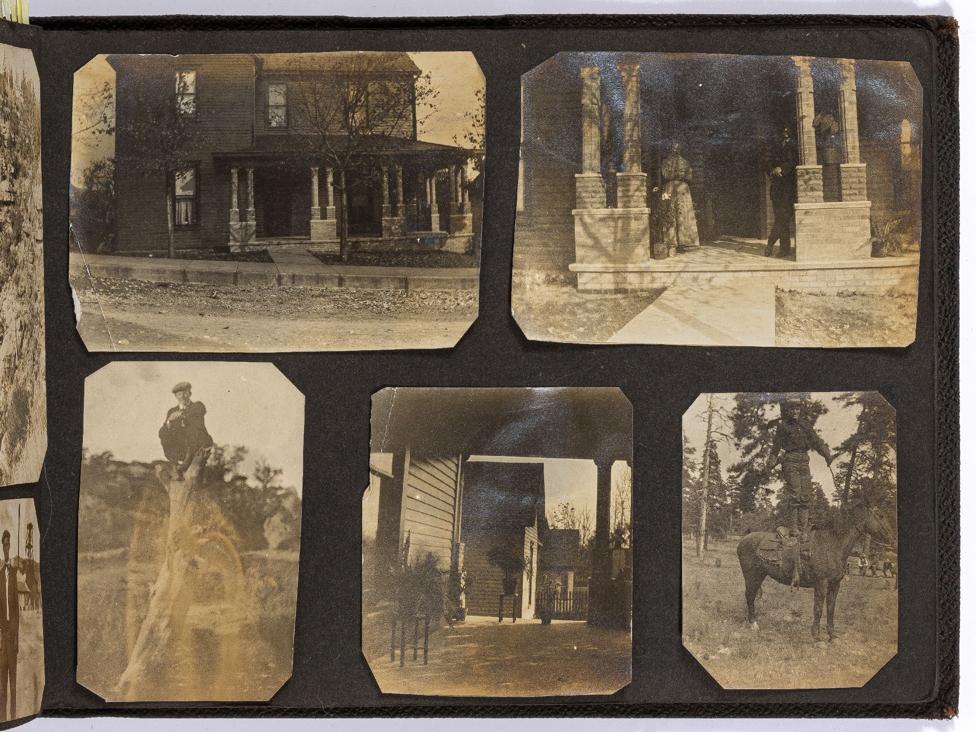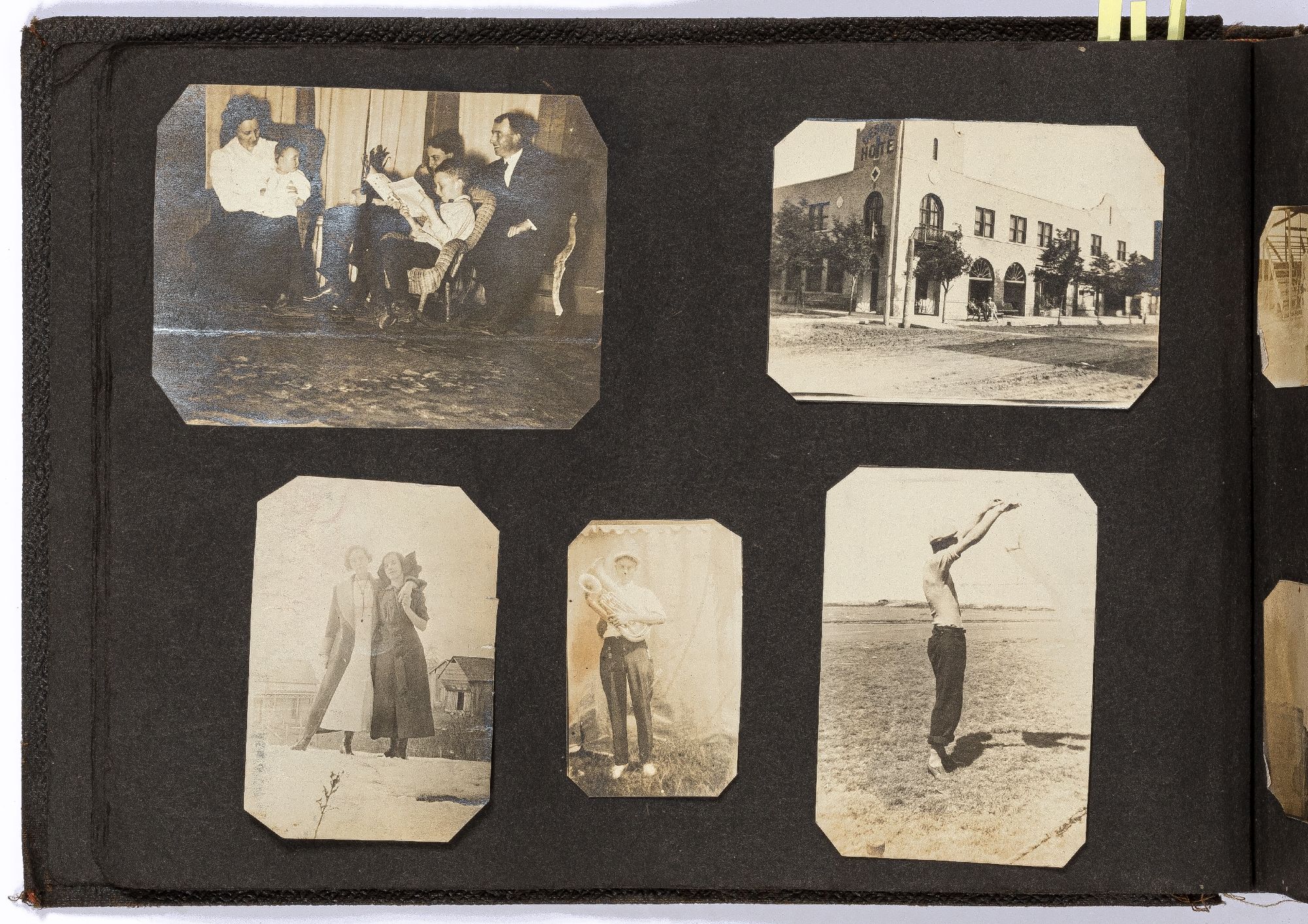 A photo album compiled by a vaudeville performer with Murphy’s Comedians around 1915. The album begins with a group shot of performers in costume behind a tent in their backstage area. Performers, both men and women, are seen practicing instruments and acts backstage, during their leisure time, and setting up the tents. One of the tents is seen during set up with the “MC” banners for Murphy’s Comedians on either side of the stage. Another shows two men standing on the canvas and beams of a disassembled tent. Throughout the album the performers are seen traveling around the country with images of locomotives, horse drawn wagons, and automobiles. When not performing the troupe is spends their time playing baseball, picnicking, reading, and boating. Murphy’s Comedian’s show had an emphasis on stories from the American West including *The Last Roundup*, which they describe as “the greatest play of the Western Plains.”