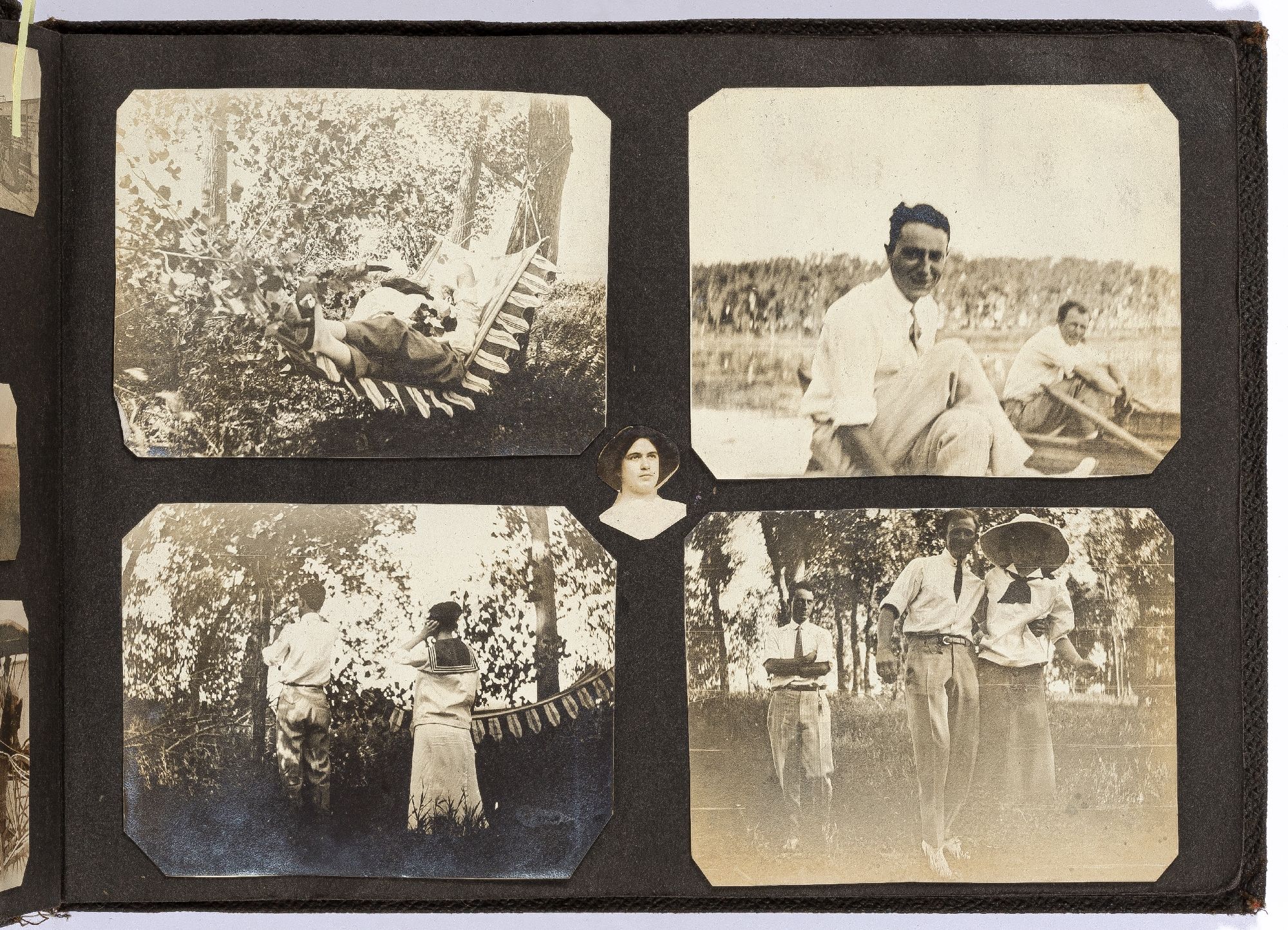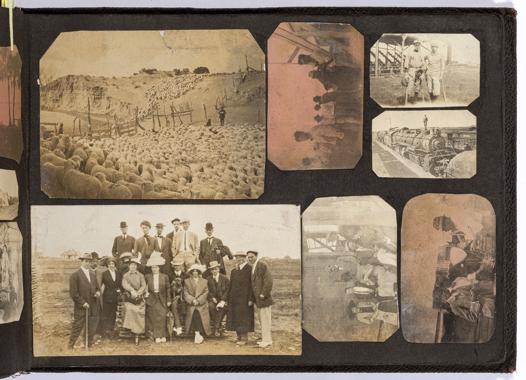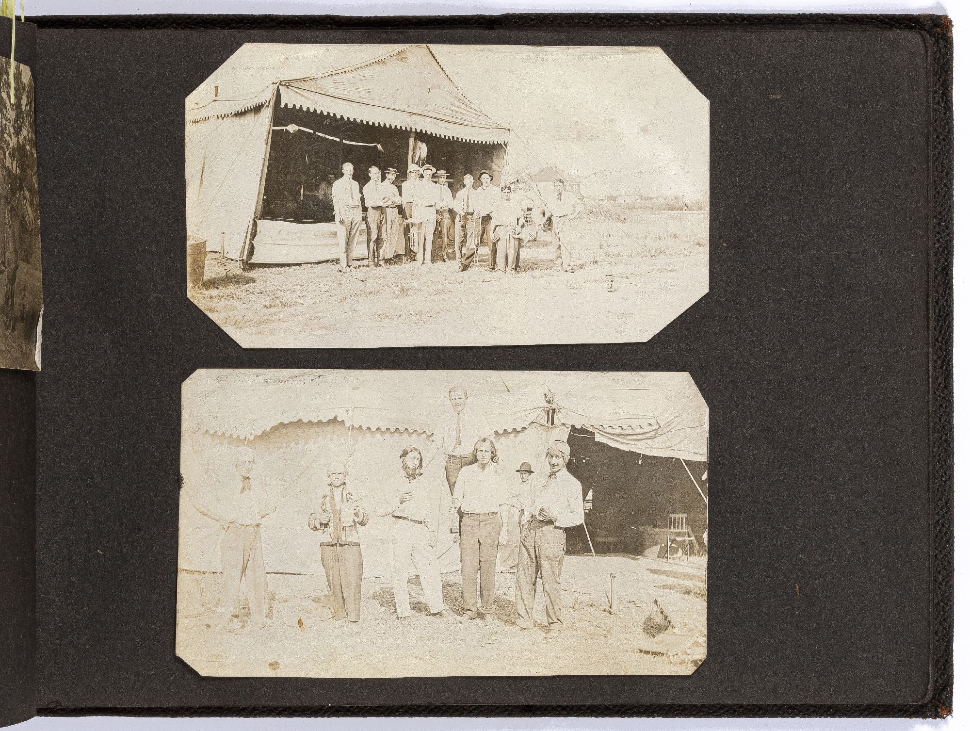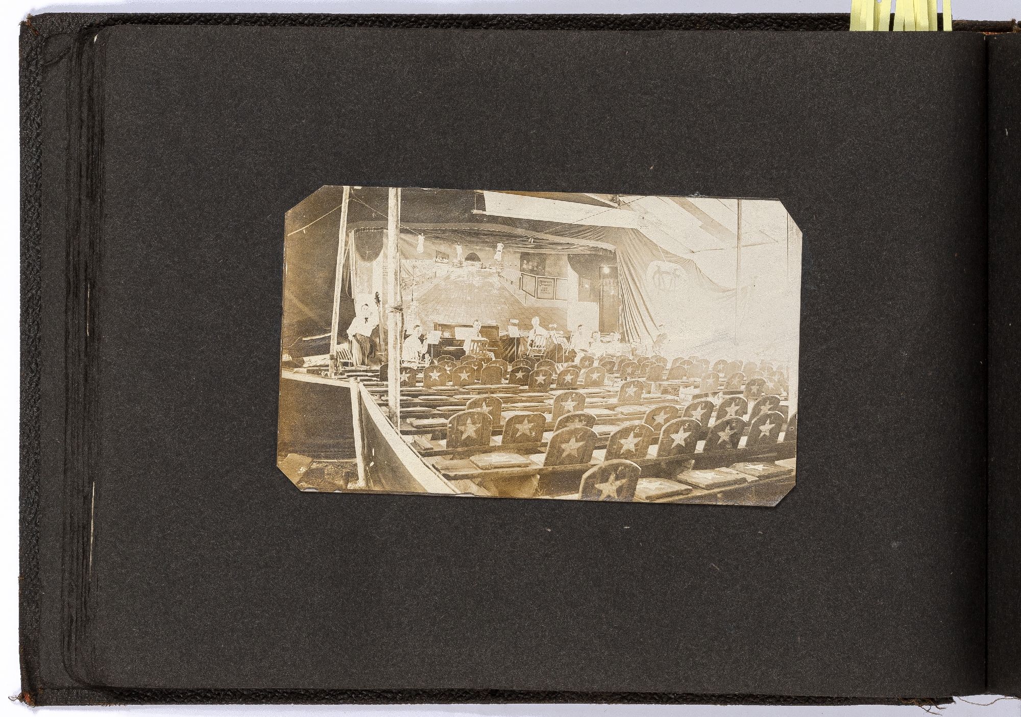 A photo album compiled by a vaudeville performer with Murphy’s Comedians around 1915. The album begins with a group shot of performers in costume behind a tent in their backstage area. Performers, both men and women, are seen practicing instruments and acts backstage, during their leisure time, and setting up the tents. One of the tents is seen during set up with the “MC” banners for Murphy’s Comedians on either side of the stage. Another shows two men standing on the canvas and beams of a disassembled tent. Throughout the album the performers are seen traveling around the country with images of locomotives, horse drawn wagons, and automobiles. When not performing the troupe is spends their time playing baseball, picnicking, reading, and boating. Murphy’s Comedian’s show had an emphasis on stories from the American West including *The Last Roundup*, which they describe as “the greatest play of the Western Plains.”