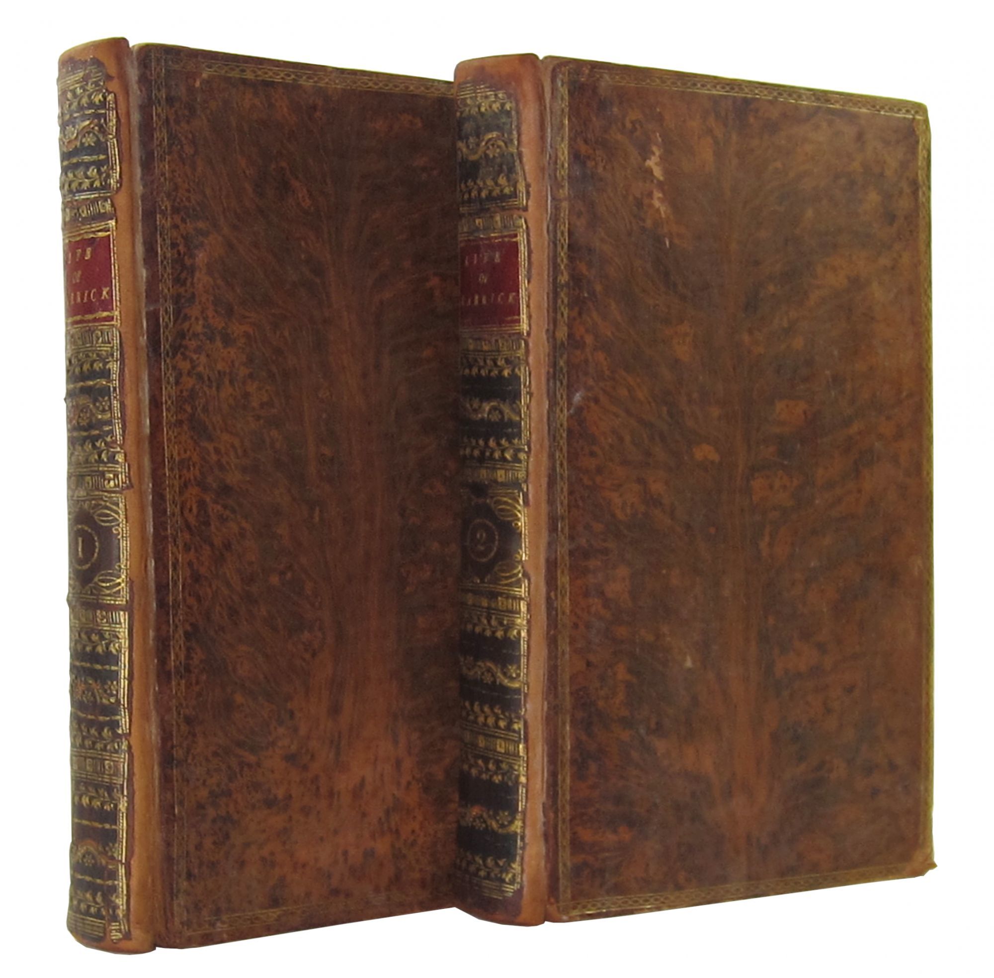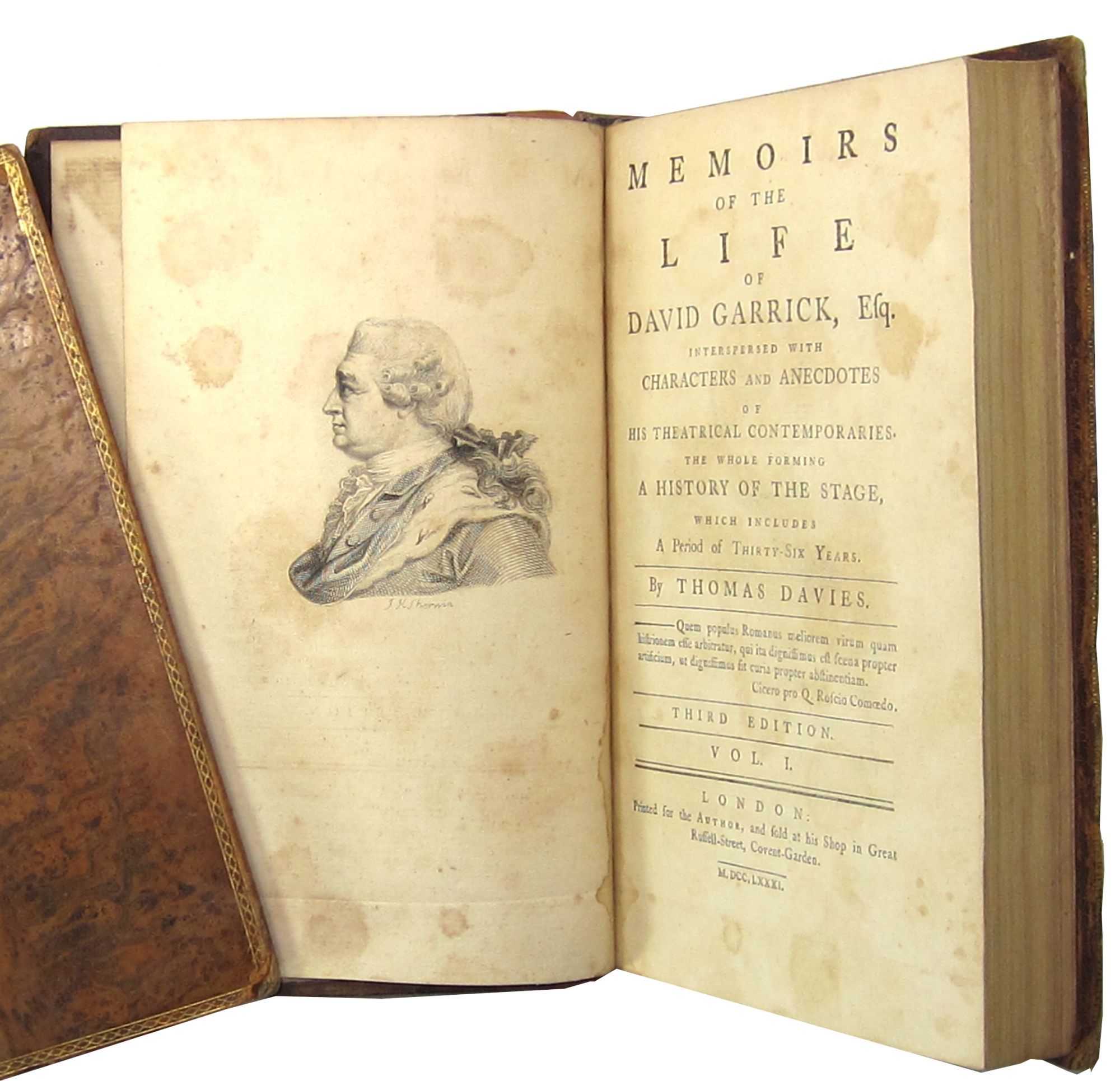 London: Printed for the Author, and sold at his Shop in Great Russell Street, Covent-Garden, 1781. Very Good. London: Printed for the Author, and sold at his Shop in Great Russell Street, Covent-Garden, 1781. Third Edition [with Davies's corrections]. Octavo; Vol I [16] + 352pp; Vol II [16] + 434pp + 2pp of Subscription Prospectus for Davies's forthcoming Dramatic Miscellanies. Frontispiece portrait engraving of Garrick by John Keyse Sherwin (1751-1790). Original tree calf with spines ornamented in gilt, title labeled against crimson. Panel borders and edges tooled in gilt. Each volume with original bound-in green and white ribbon marker.