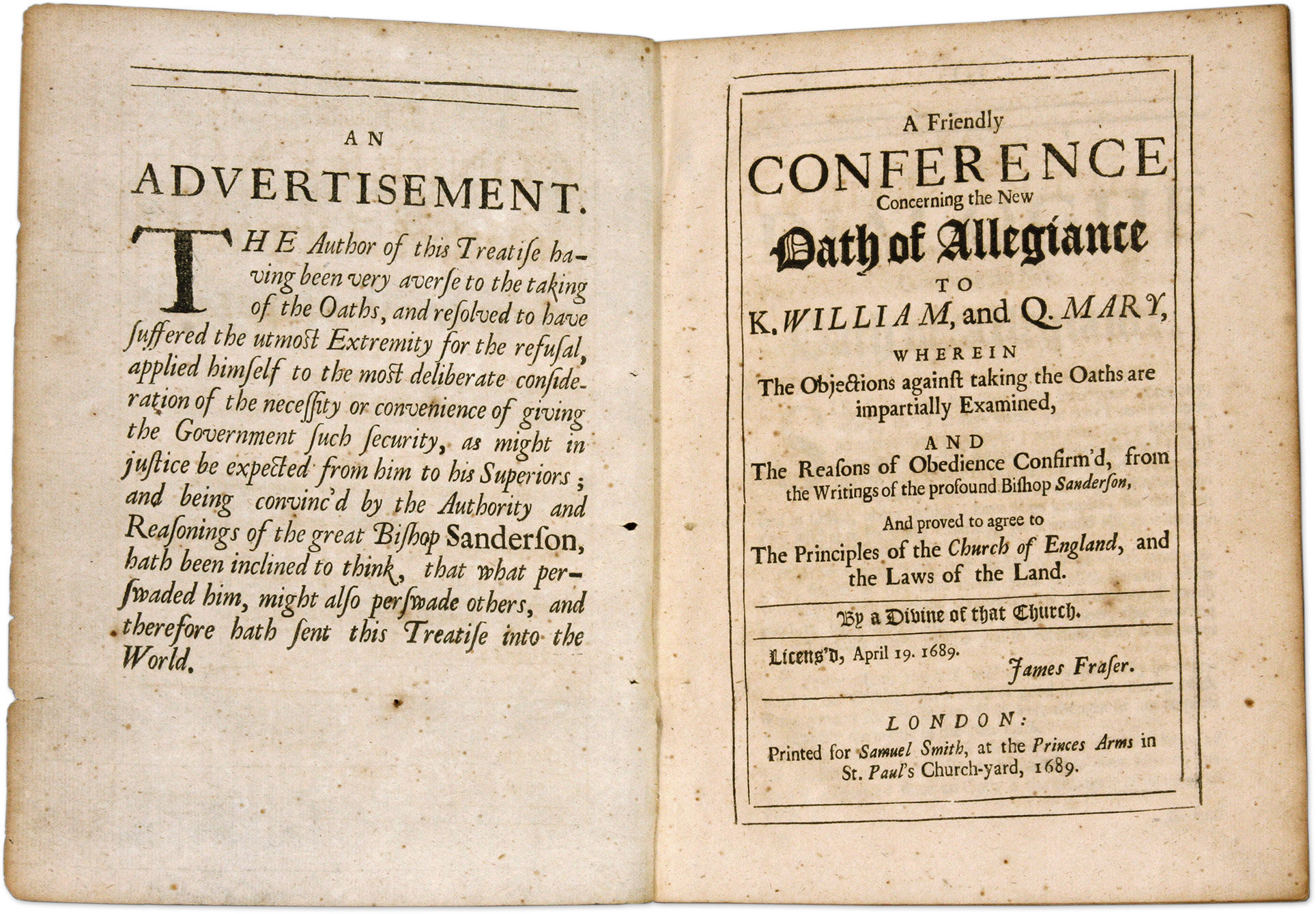 1689. London: Printed for Samuel Smith, 1689.. London: Printed for Samuel Smith, 1689. "The Reasons of Obedience Confirm'd" [Oaths]. [Great Britain]. A Friendly Conference Concerning the New Oath of Allegiance to K. William, And Q. Mary, Wherein the Objections Against Taking the Oaths are Impartially Examined. And the Reasons of Obedience Confirm'd, From the Writings of the Profound Bishop Sanderson, And Proved to Agree to the Principles of the Church of England, And the Laws of the Land. By a Divine of that Church. Licens'd, April 19. 1689. James Fraser. London: Printed for Samuel Smith, 1689. [iv], 35, [1] pp. Author advertisement to verso of first leaf, bookseller advertisement to verso of final leaf. Quarto (7-3/4" x 6"). Disbound stab-stitched pamphlet. Moderate toning, somewhat heavier in places, faint spotting, final signature just beginning to detach. $750. * Only edition. "This anonymous tract, licensed for publication on 19 April 1689, directly addresses the new requirement that office holders, both civil and ecclesiastical, must subscribe to an oath of loyalty to King William and Queen Mary. To ease the consciences of the scrupulous, the new oath asked only for loyalty. It deftly sidestepped the issue of legitimacy and read: 'I do sincerely promise and swear that I will be faithful and bear true allegiance to their majesties King William and Queen Mary.' Nevertheless with King James still alive many individuals with troubled consciences were unclear what obligation they still owed King James. They were anxious not to violate their sworn oath to him and wondered whether William and Mary were usurpers like Cromwell. Office holders had six months during which to swear to the oath or lose their posts.": Malcolm, Ed., The Struggle for Sovereignty II:944-945. English Short-Title Catalogue R17117.