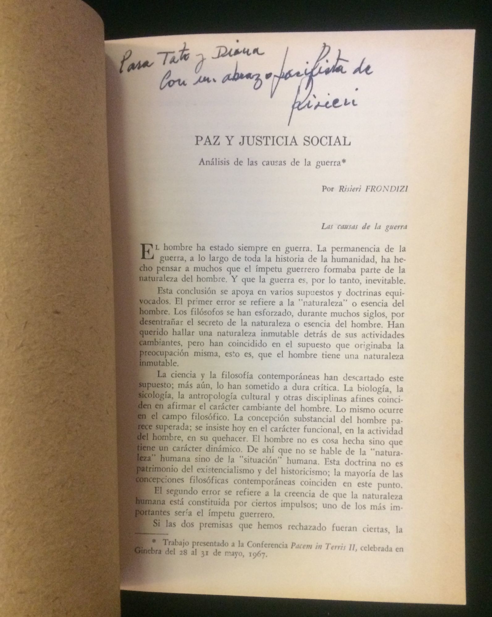 Sobreitero de Cuandernos Americanos, 1967. 1st Edition. Soft cover. Fine. A finely preserved, inscribed copy of anti-war paper by Risieri Frondizi, Argentian philosopher, anthropologist and one of that country's pre-eminent intellectuals. Frondizi (1910 - 1983) spent his early career in academe at the Universidad Nacional de Tucumán, where he served from its founding in 1937 as its' director of the Faculty of Philosophy and Letters through 1946, when he was dismissed when Juan Peron's came to power. In the late 1950s Frondizi became rector of the University of Buenos Aires. In 1958, his brother Arturo Frondizi became president of a civilian government but was overthrown in 1962 by a military coup that supported the return of Perón. Another military coup in June 1966 led to the forcible clearing of facilities of the University of Buenos Aires - an event known as La Noche de los Bastones Largos ("The Night of the Long Batons") - and over 300 university professors, including Frondizi, were exiled. This paper apparently was written on the heals of the assault on the academy and Frondizi's exile. The pamphlet comes from the private library of architect Cesar Pelli (1926 - 2019) and his wife, landscape architect Diane Balmori (1932-2016), both Argentinian-born. Pelli studied at Tucuman in the 1940s when Frondizi was professor there. The pamphlet is inscribed in intimate and affectionate parlance: "Par Tato y Diana con un abrazo pacifista de Risieri". Tato is a term for brother; the translation roughly is " with peaceful embrace". The pamphlet was published by Sobreitero de Cuandernos Americanos, September - October de 1967. It has brown, flecked paper covers, stapled spine, 27 pages. Frondizi presented the paper at the conference Pacem in Terris II (the second international convocation after Pope John XXIII's 1963 conference) in Geneva, May 28-31, 1967. Fine condition. Laid-in is a publication list and ordering instruction sheet for publisher Centro Editor de America Latina.