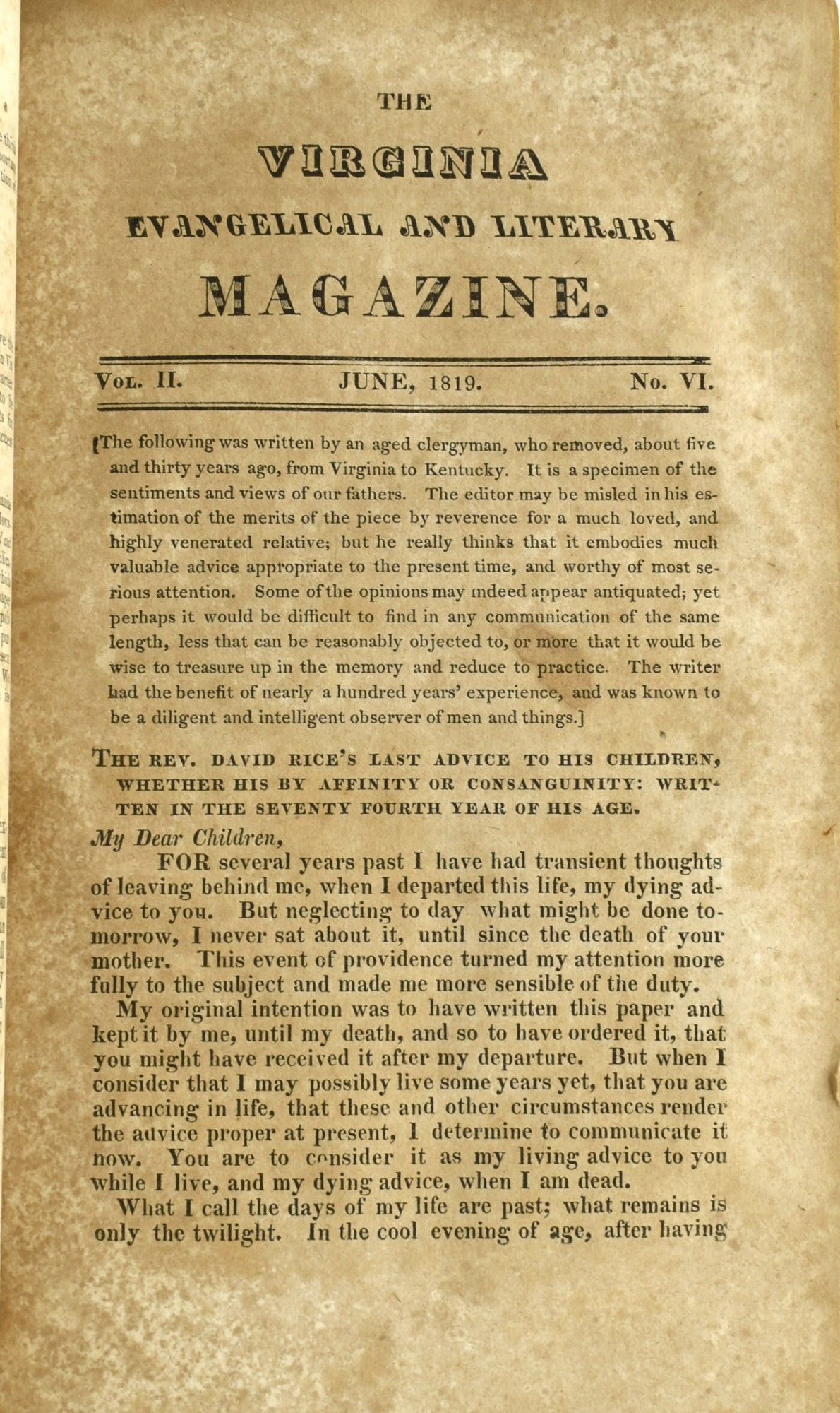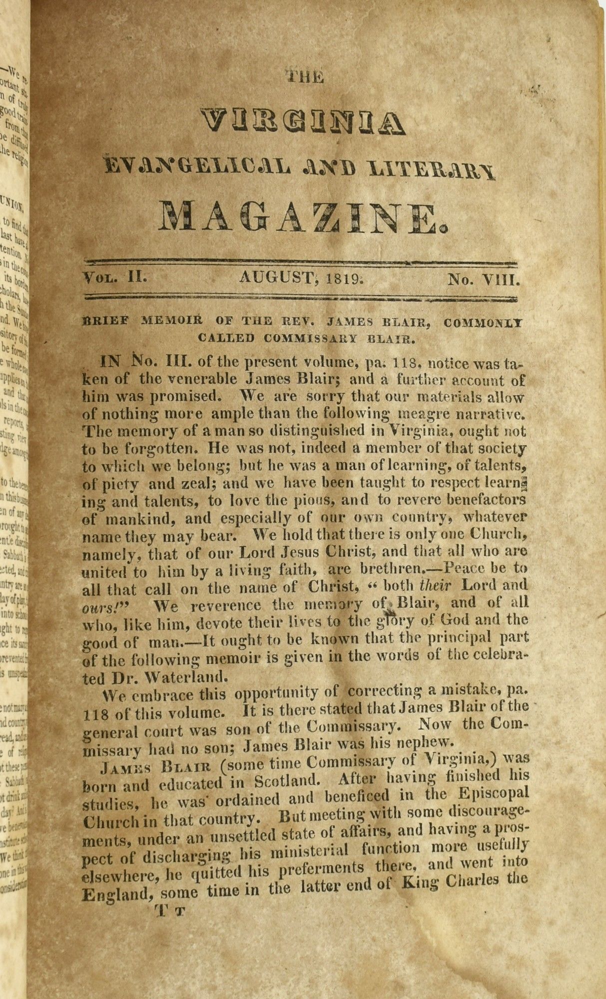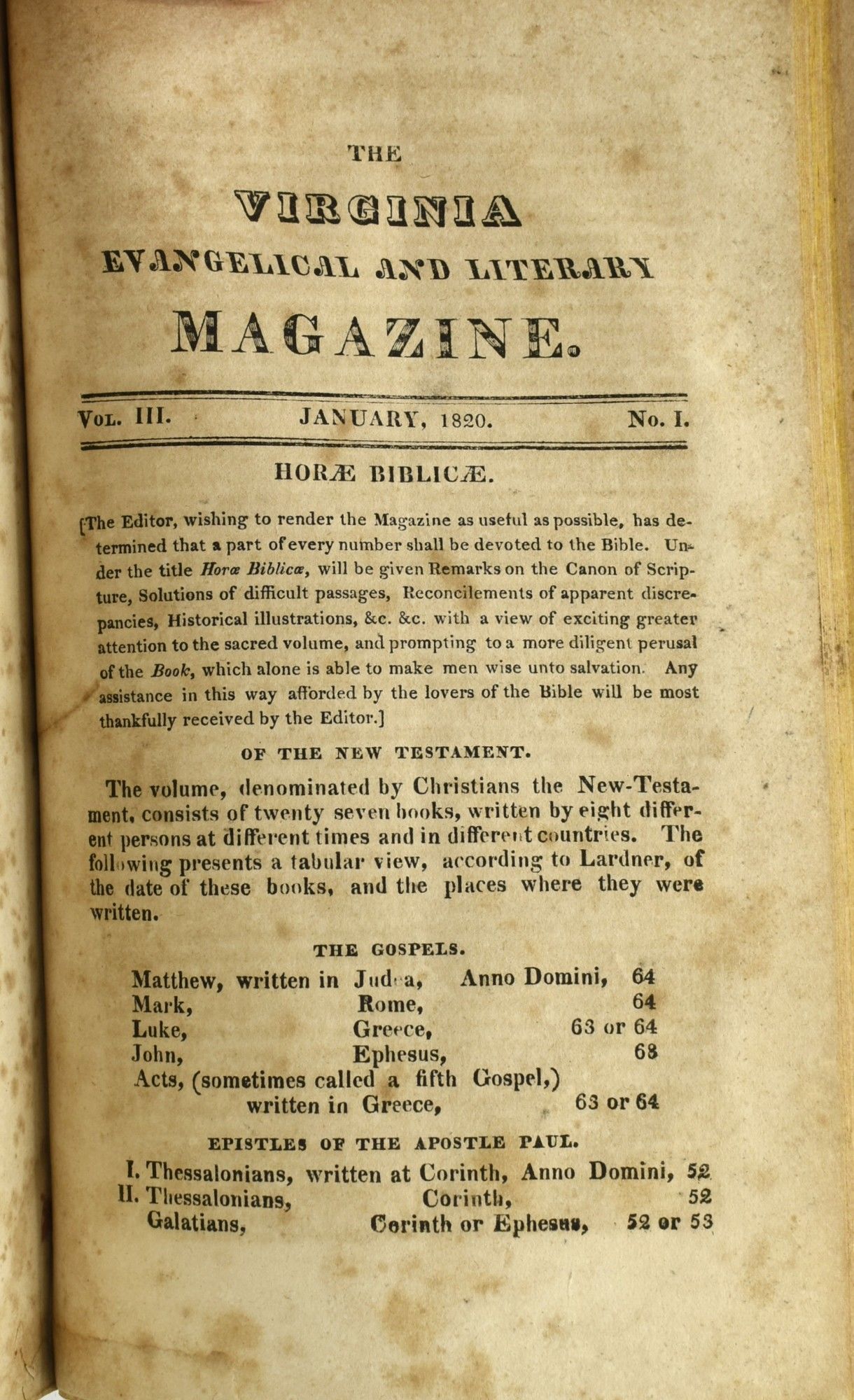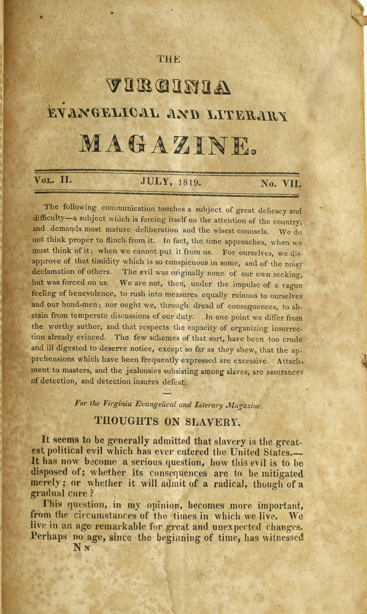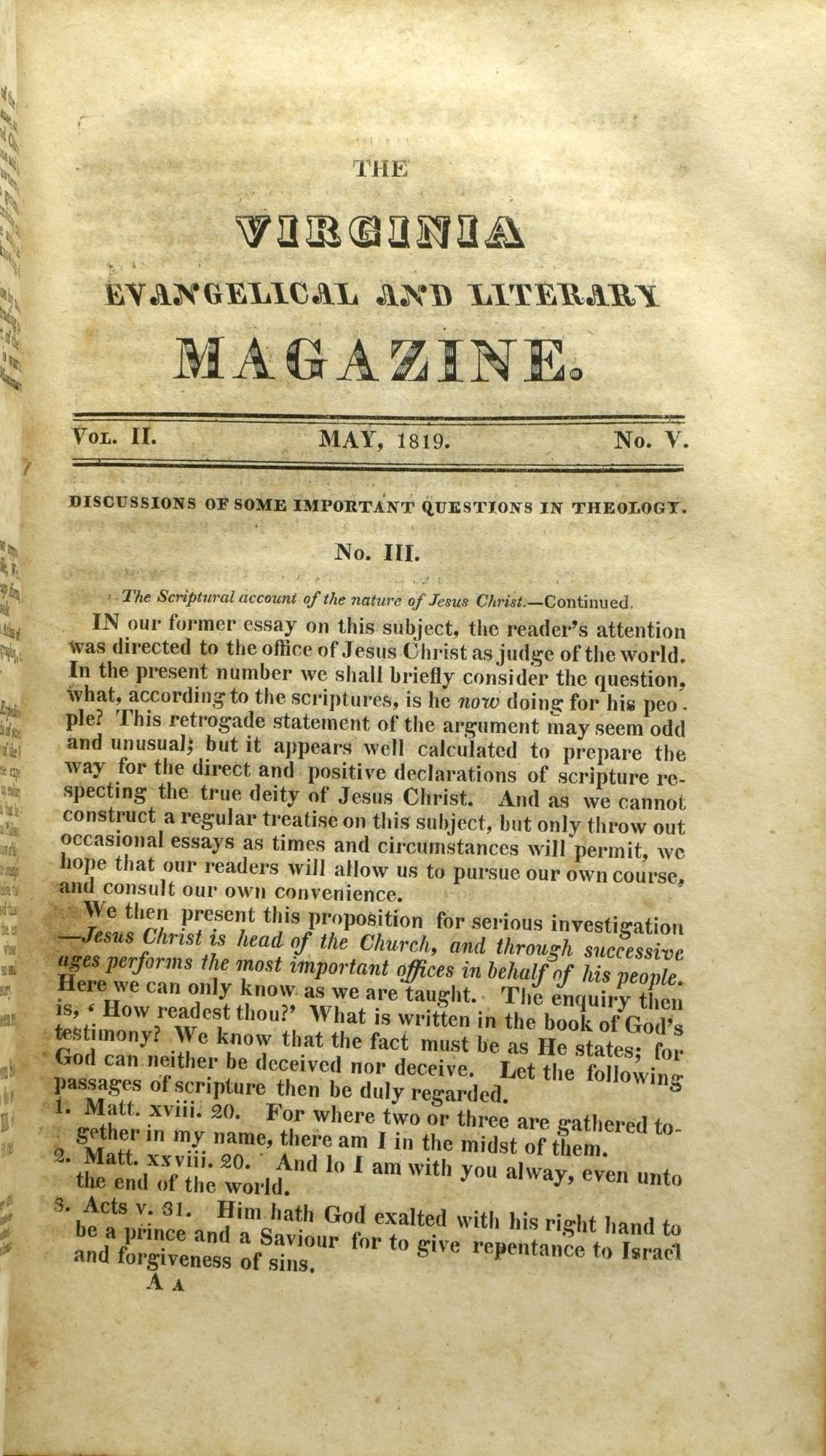[Richmond]: [William W. Grey], 1820. Good binding. The Virginia Evangelical and Literary Magazine was issued for about 10 years, beginning in January 1818 and concluding with a final issue in December 1828. John Holt Rice edited it, with the assistance of Moses Hoge, John D. Blair, and George Baxter. Many, if not most, articles were submitted anonymously or under pseudonyms -- Timothius, Acadmemicus, and the like. ~~The 10 issues are Volume II, No. 1, January 1819; No 2, February 1819 [Note this issue has corner loss to a number of leaves affecting a few letters of type--the seems almost certainly the result of a mouse looking for a meal]; No. 4, April 1819 [Note one leaf has a 3" closed tear]; No. 5, May 1819, contains images of the Idols of Pomare; No. 6, June 1819; No. 7, July 1816 contains "Thoughts on Slavery": "All immediate emancipation is out of the question, and perhaps domestic emancipation will always be impracticable", though the magazine appears to favor the rightness of teaching slaves to read and write [Note some loss to top corner of a number lof leaves not affecting text]; No. 8, August 1819 contains "Origins of Presbyterianism~ in Virginia", also Ecclesiastical Statistics reported to the church's Assembly; No. 9, September 1819; No. 10, October 1819 in which the Memoirs of Samuel Davies, which have been features in a number of the previous issues, is continued: The popularity of Davies in Virginia is almost unbounded"; No. 11, November 1819; Volume III, No. 1, 1820, contains a lengthy review of the Memoirs of Henry Obookiah, a native of Owhyhee, and introduced Horae Biblicae, in which the magazine begins addressing various scriptural issues.~~Bound in sheep with the boards separating but still attached. Lacking the morocco title label; the number label (Volume II) is laid in. With the attractive contemporary name label for Cyrus Johnston on the pastedown. An early Richmond magazine imprint, and rather uncommon. ~~. Good binding.