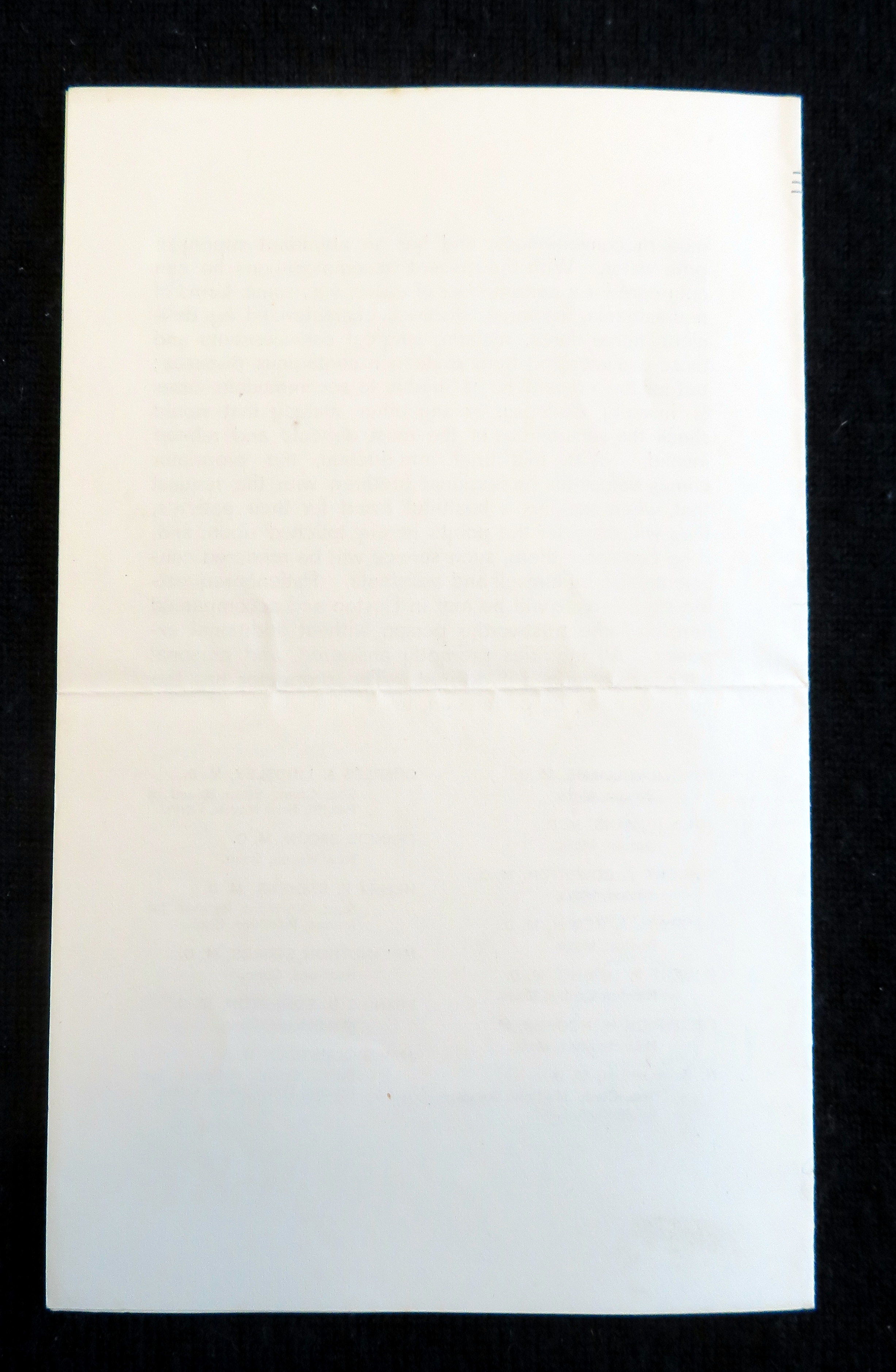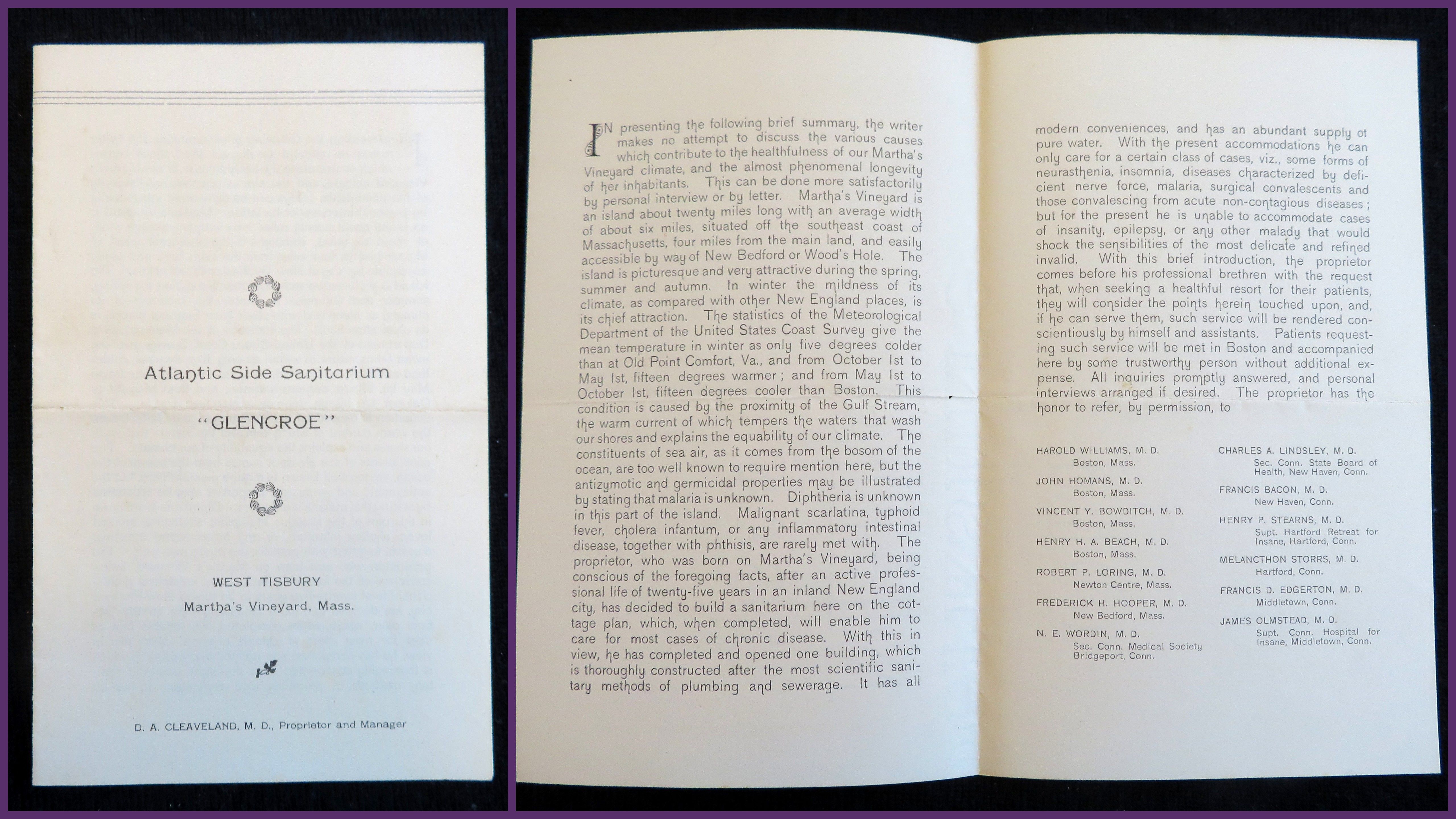 West Tisbury, Martha's Vineyard, MA, [1900]. General wear. Crease folds. Single fold pamphlet advertising a newly built sanitarium called Glencroe, in the small town of West Tisbury located on Martha's Vineyard in Massachusetts. The proprietor, Dr. D. A. Cleaveland, of the sanitarium starts by praising the weather, which apparently in winter is only "five degrees colder than Old Point Comfort, VA", and then continues on to state the numerous diseases which are not a problem for the islands residents. "Diphtheria is unknown in this part of the island. Malignant Scarlatina, typhoid fever, cholera infantum, or any inflammatory intestinal disease, together with phthisis, are rarely met with..." Cleaveland spends some time describing the "modern conveniences" of Glencroe, before addressing the types of patients he wishes to receive, "with the present accommodations he can only care for a certain class of cases, viz., some forms of neurasthenia, insomnia, diseases characterized by deficient nerve force, malaria, surgical convalescents, and those convalescing from acute non-contagious disease; but for the present he is unable to accommodate cases of insanity, epilepsy, or any other malady that would shock the sensibilities of the most delicate and refined invalid." Single fold. Measures 7" x 4 1/4" (folded), 8 1/2" x 7" (unfolded).