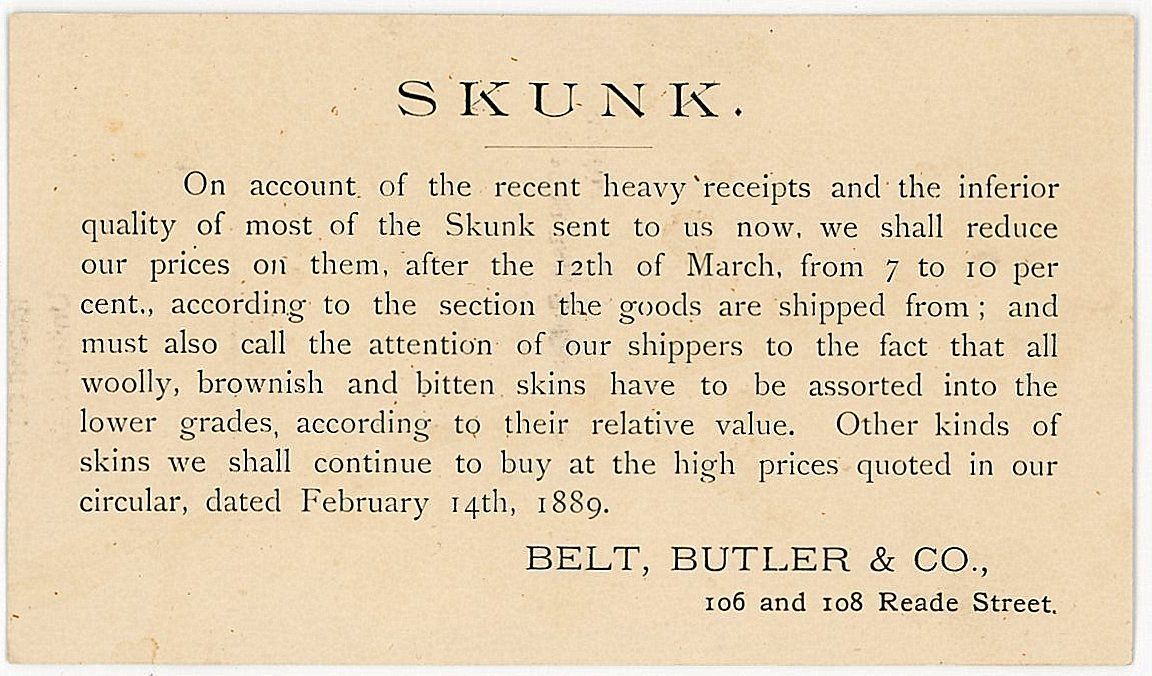 New York, NY: Belt, Butler & Co, 1889. A 3 1/4" x 5 5/8" notification card printed on heavy stock, titled "SKUNK". It is a notification to traders regarding the recent heavy receipts and the inferior quality of most of the Skunk sent advising that prices will particularly on all woolly, brownish and bitten skins that will be assorted into lower grades and assigned value accordingly. Other kinds of skins will continue to be paid at the prices quoted in their circular of February 14, 1889. Belt, Butler & Co. were sellers of wools, hides and furs. Skunk pelts are divided into four grades, with the most prized being the ones with a greater amount of black. These grades are further subdivided in value according to their locality, with the most valuable occurring in northern regions, where the fur is finer and darker. Skunks are notable for being easy to trap, even approaching traps they had been previously caught in. Because skunks are difficult to kill without having them discharge their musk (and thus ruin their fur) they were typically dispatched with a paralyzing blow to the lower back or drowned if caught in a box trap.