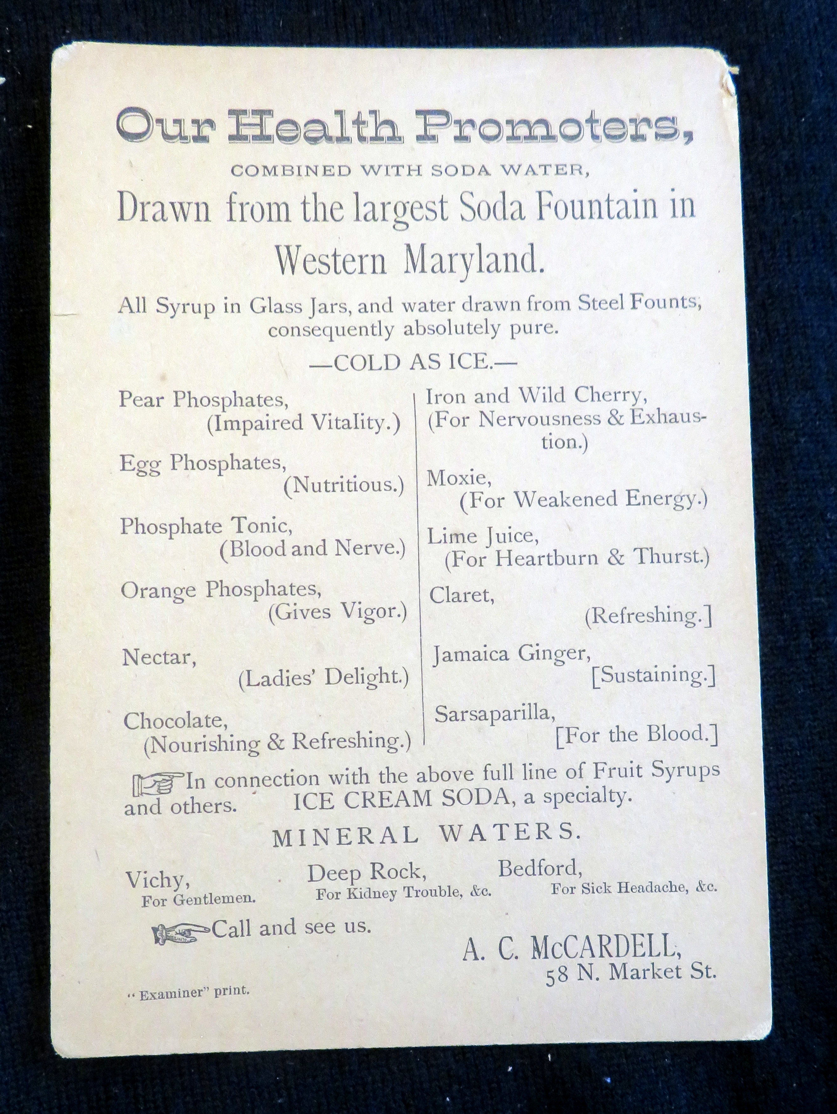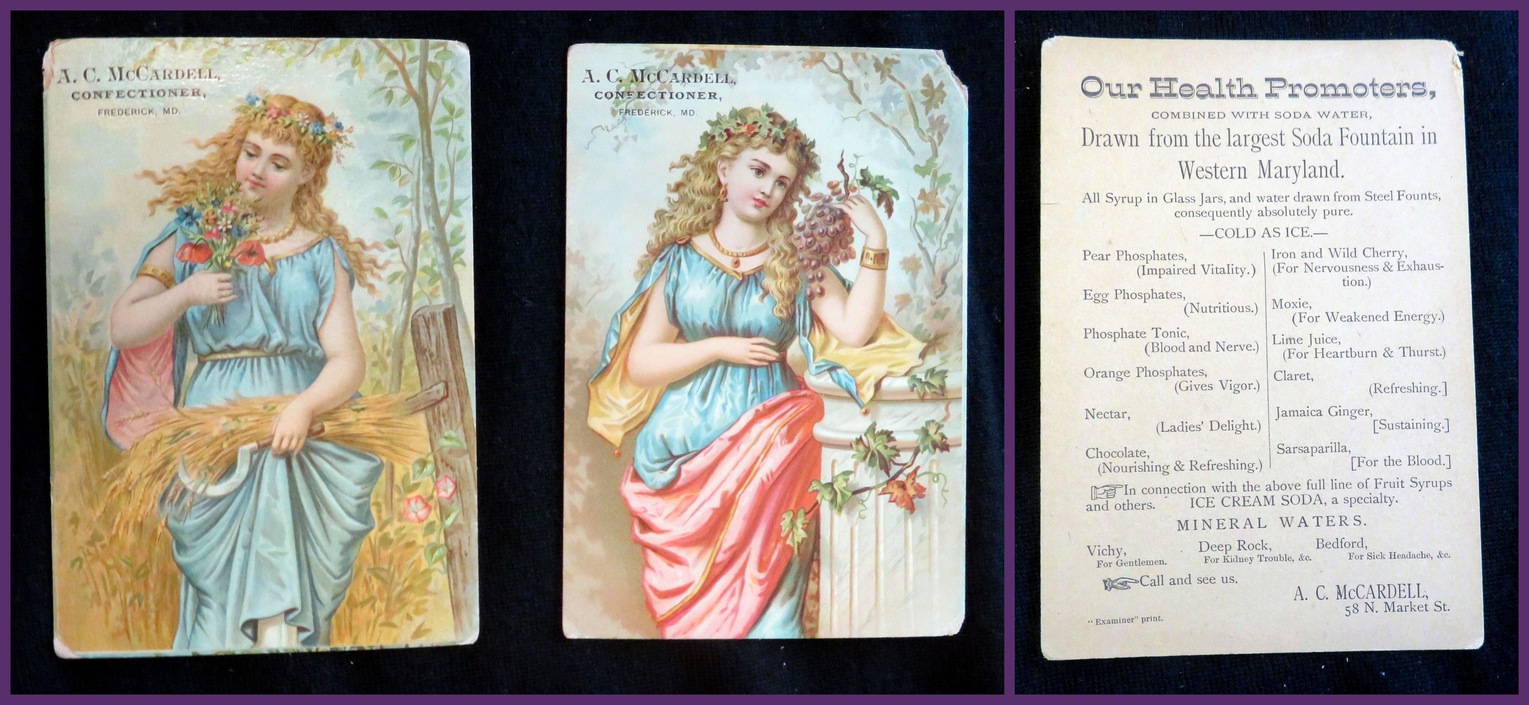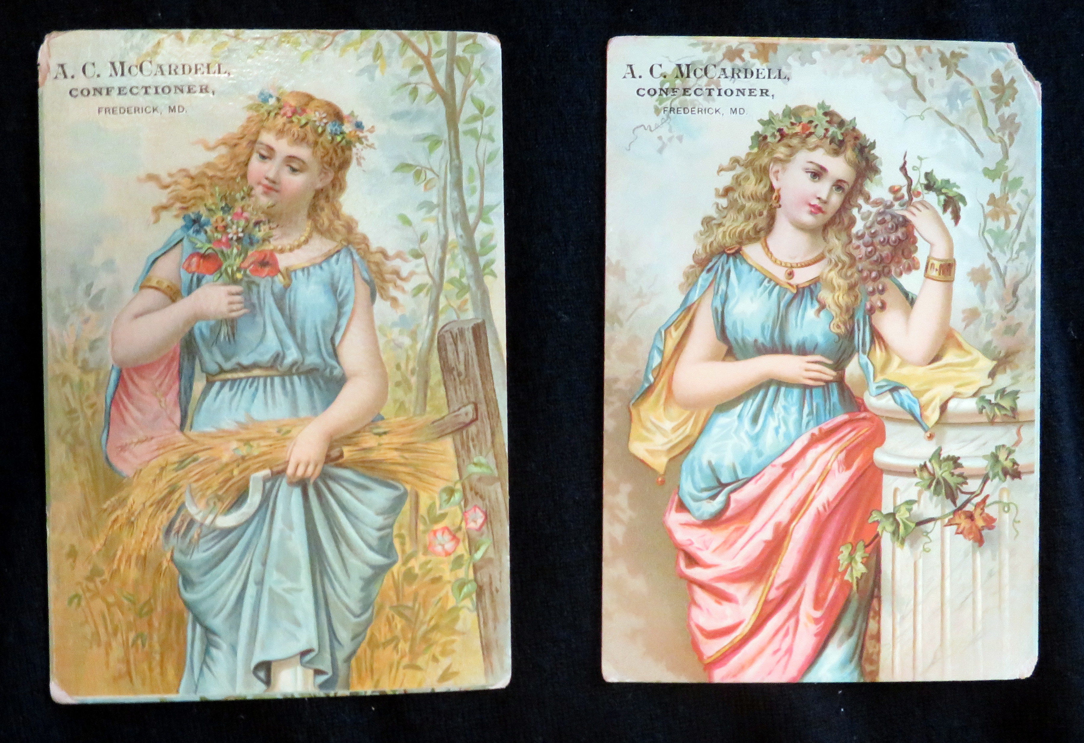 Frederick, MD: Examiner, [1900]. General wear. Damage to corners. . Each advertisement printed on heavy card stock has a chromolithograph illustration on the front and the menu of syrup flavors on the reverse. Both illustrate a woman wearing a Greek style dresses, and one is holding a branch of grapes while the other is holding flowers in one hand with a bunch of wheat and a scythe in the other. The advertisement on the back sides are the same for both- a list of the variety of health and soda drinks provided by A. C. McCardell. Some examples are: Pear Phosphates for impaired vitality, chocolate for nourishing and refreshment, Moxie for weakened energy, and Sarsaparilla for the blood. Also sold by A. C. McCardell were a whole line of Fruit Syrups and Ice Cream Soda, as well as Mineral Waters from Vichy (for Gentlemen), Deep Rock (for kidney trouble), and Bedford (for "sick headache"). Each item Measures 7" x 5".