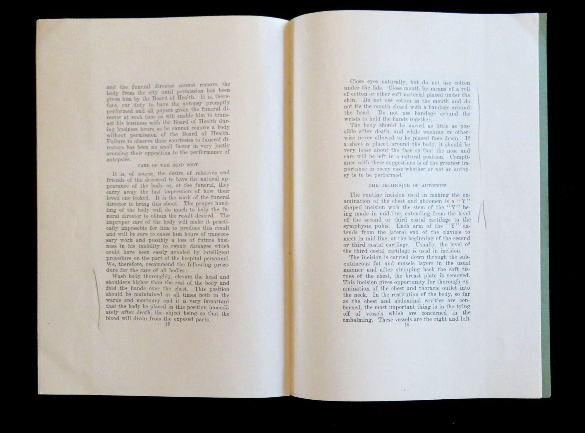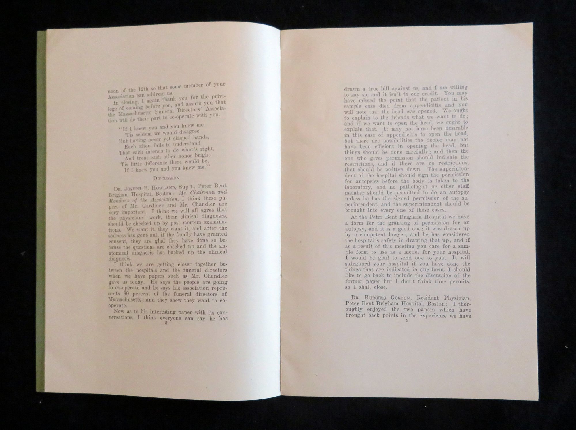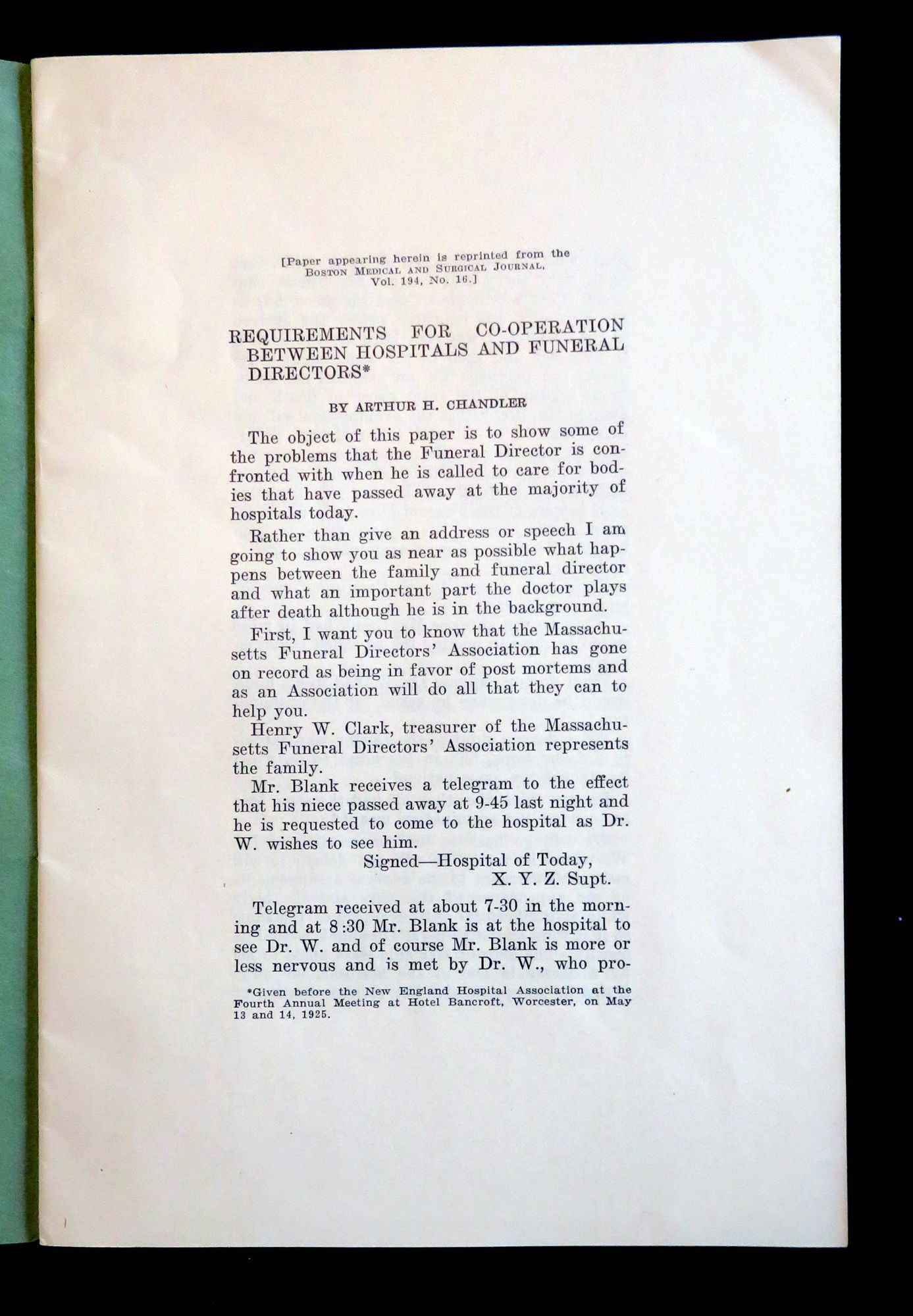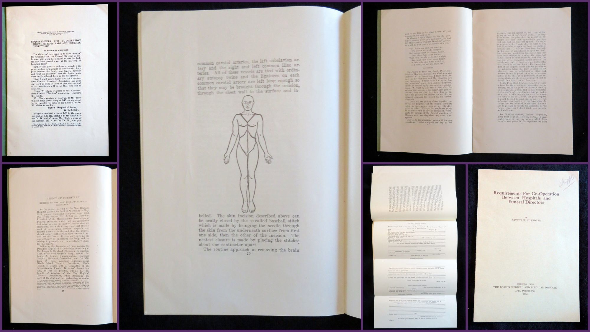 1926. General wear. Minor penciling.. This booklet contains a speech that was first delivered by Arthur H. Chandler at the New England Hospital Association Conference in May 1925. This speech gave a fictional telling of the death of Mr. Bank's niece and the subsequent miscommunications between the hospital and funeral home in regards to the care of her body, and ultimate dissatisfaction due to this that Mr. Banks had in regards to the resulting look of his niece. This story was used as a means of exemplifying the issues funeral directors were having in preparing bodies for viewing after an autopsy had been performed. After his speech, is a recording of the discussion which followed by a panel of members of the association. After there is a report of the committee regarding the issue, possible solutions, as well as examples of possible autopsy consent forms and a proposal for a standardization of autopsy methods. In addition to the text there is a simple illustration of the human body detailing the proposed incision locations. This speech, discussion and report was later published in the Boston Medical and Surgical Journal Vol. 194, No. 16, in April of 1926. This item is a reprinting of that article. There is no information regarding the publication date or time of this particular edition. 22 pps. Green wrappers. Staple binding. Measures 9" x 6