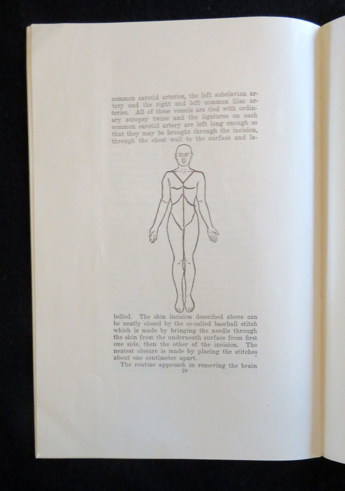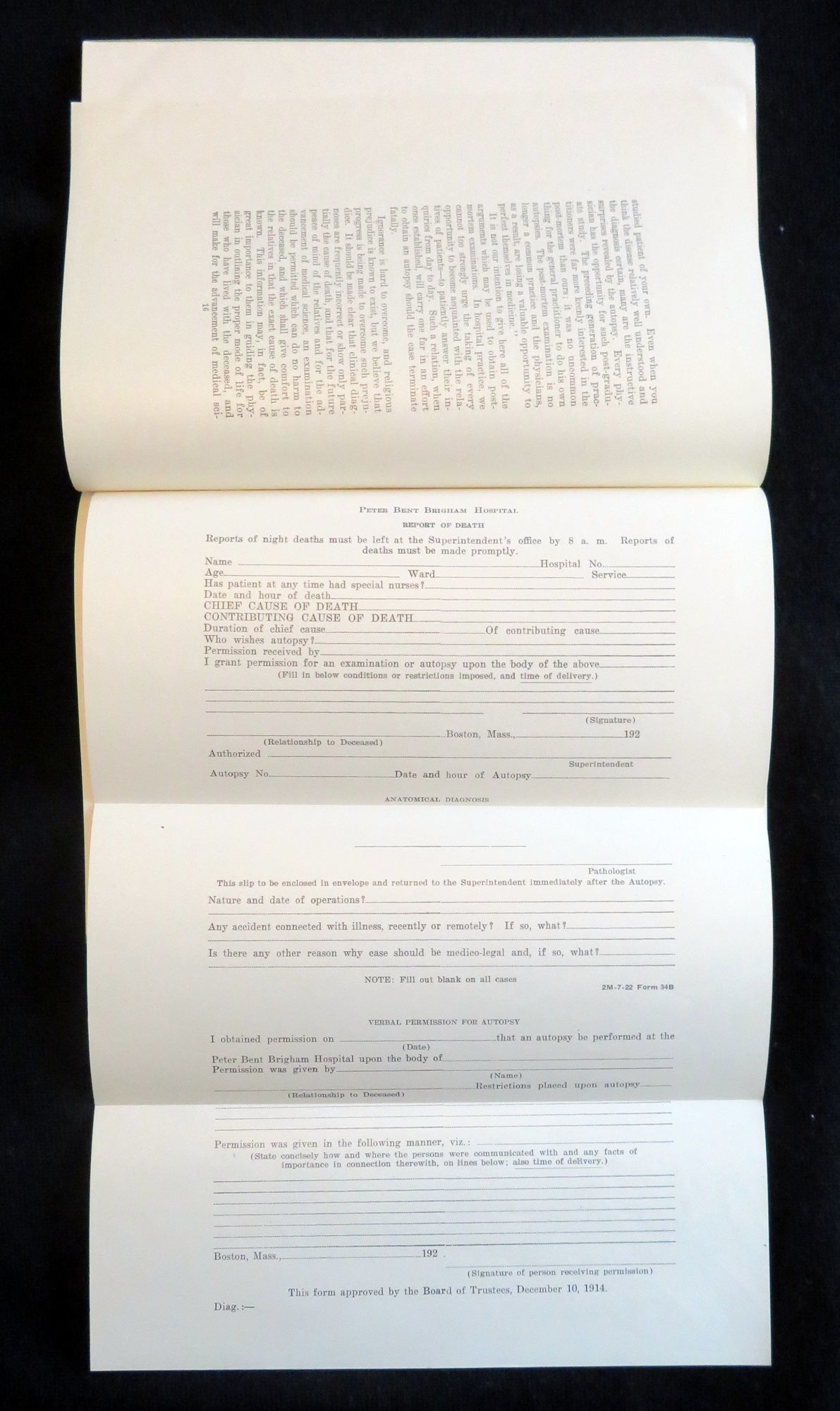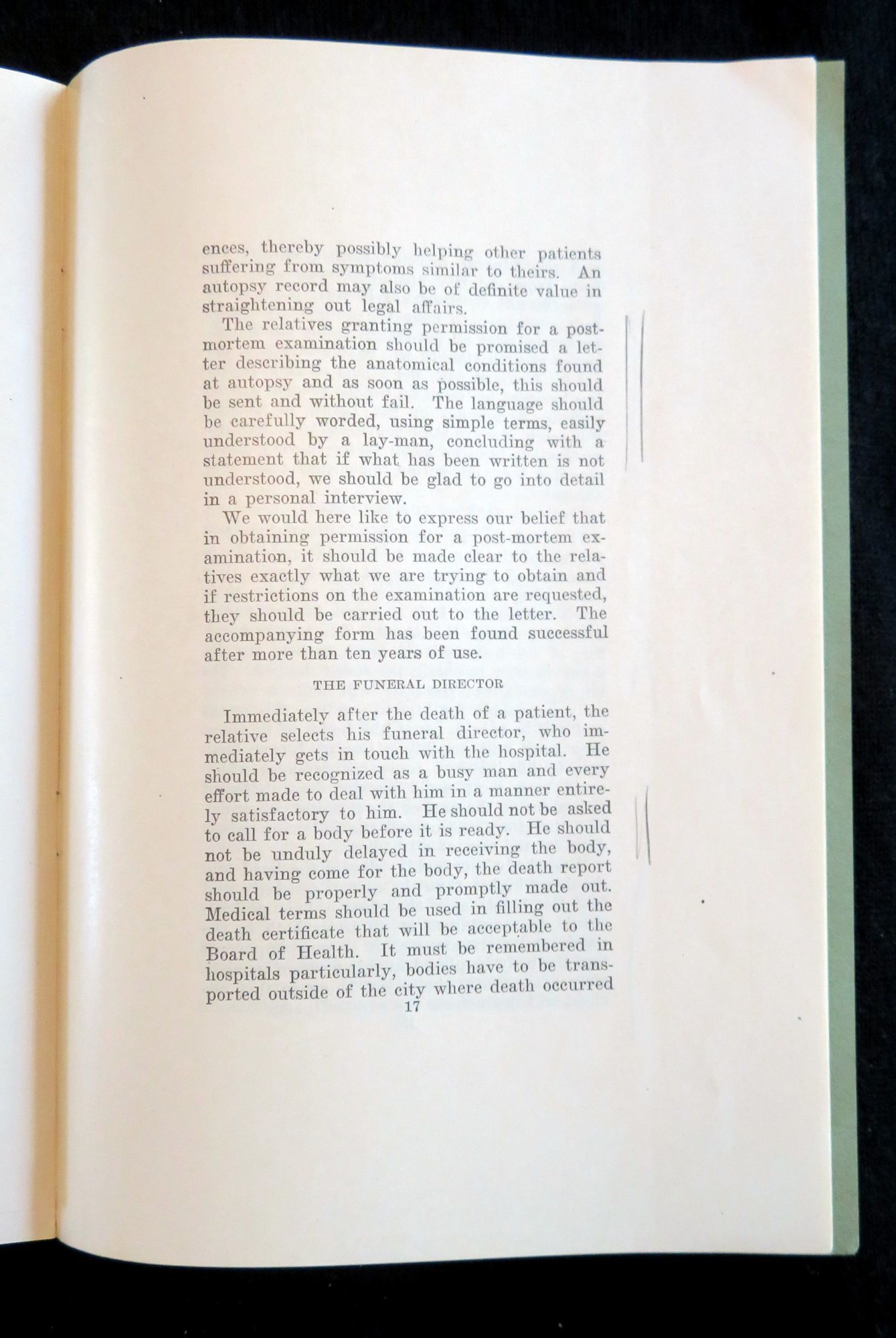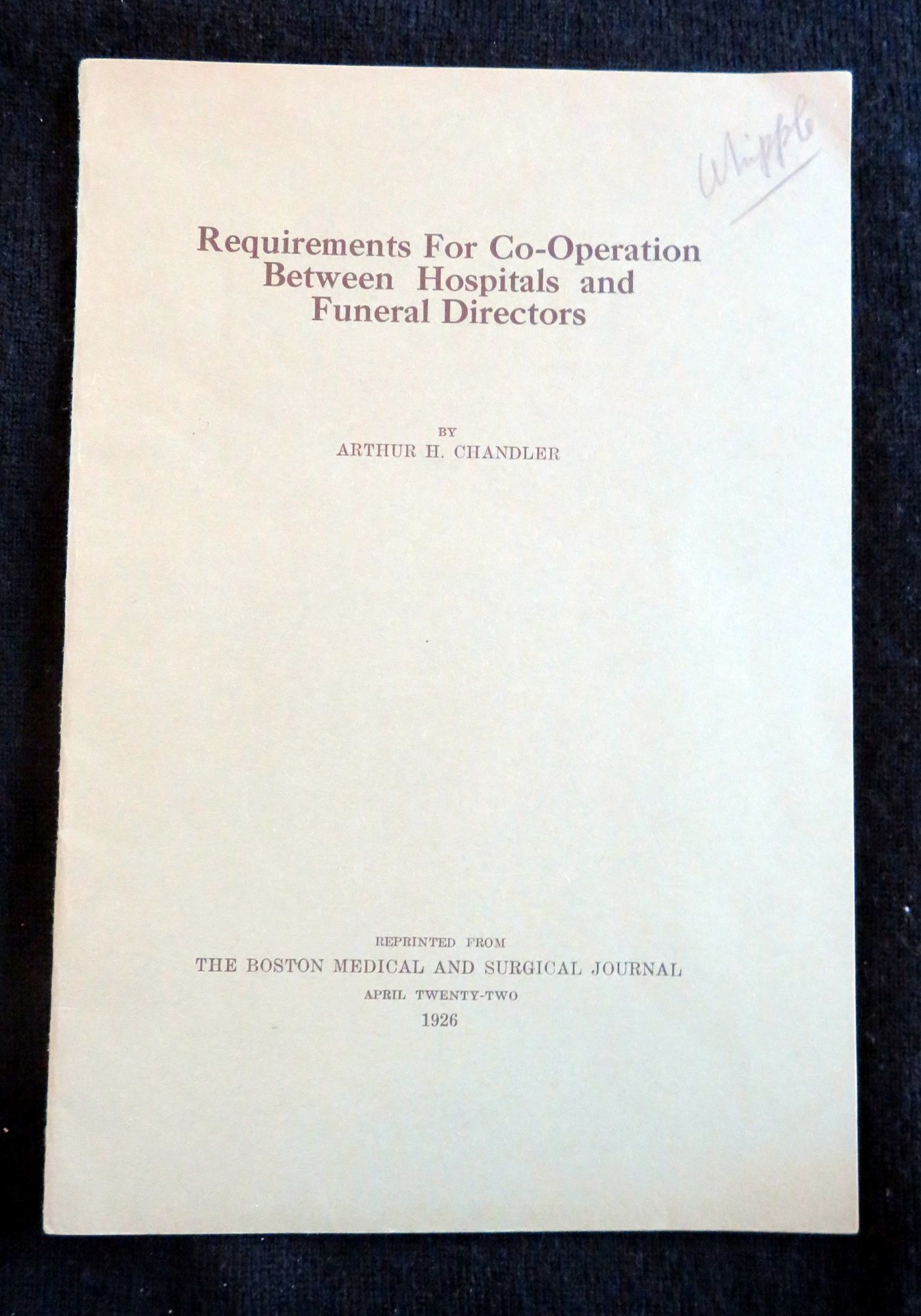 1926. General wear. Minor penciling.. This booklet contains a speech that was first delivered by Arthur H. Chandler at the New England Hospital Association Conference in May 1925. This speech gave a fictional telling of the death of Mr. Bank's niece and the subsequent miscommunications between the hospital and funeral home in regards to the care of her body, and ultimate dissatisfaction due to this that Mr. Banks had in regards to the resulting look of his niece. This story was used as a means of exemplifying the issues funeral directors were having in preparing bodies for viewing after an autopsy had been performed. After his speech, is a recording of the discussion which followed by a panel of members of the association. After there is a report of the committee regarding the issue, possible solutions, as well as examples of possible autopsy consent forms and a proposal for a standardization of autopsy methods. In addition to the text there is a simple illustration of the human body detailing the proposed incision locations. This speech, discussion and report was later published in the Boston Medical and Surgical Journal Vol. 194, No. 16, in April of 1926. This item is a reprinting of that article. There is no information regarding the publication date or time of this particular edition. 22 pps. Green wrappers. Staple binding. Measures 9" x 6