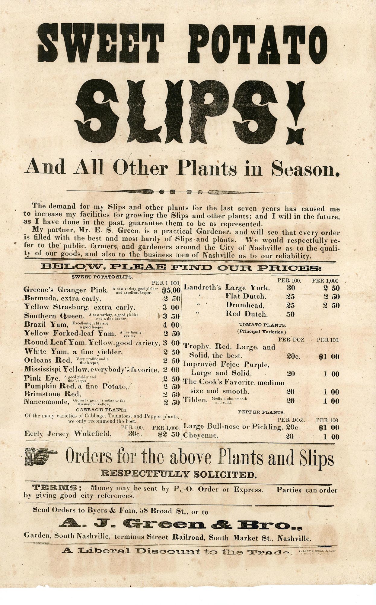 Nashville, TN: A. J. Green & Bro. & Byers & Fain, 1876. Letter folds.. An 18" x 12" broadside promoting Sweet Potato Slips! and All Other Plants in Season. Provides pricing information for a variety of Sweet Potato Slips, Cabbage, Tomato and Pepper Plants and prices for quantities of 100 and 1000 plants. Plant's include Brazil Yam, Pumpkin Red, Nancemont cabbages, Landreth's Large York Cabbage, Improved Fejee Purple Tomatoes and many more. Prices start at $2.50 per 1000 for select yams and sweet potatoes. A partnership between Byers & Fain and A. J. Green & Bro., a practical gardener. Includes original envelop with fancy cancel postmark.