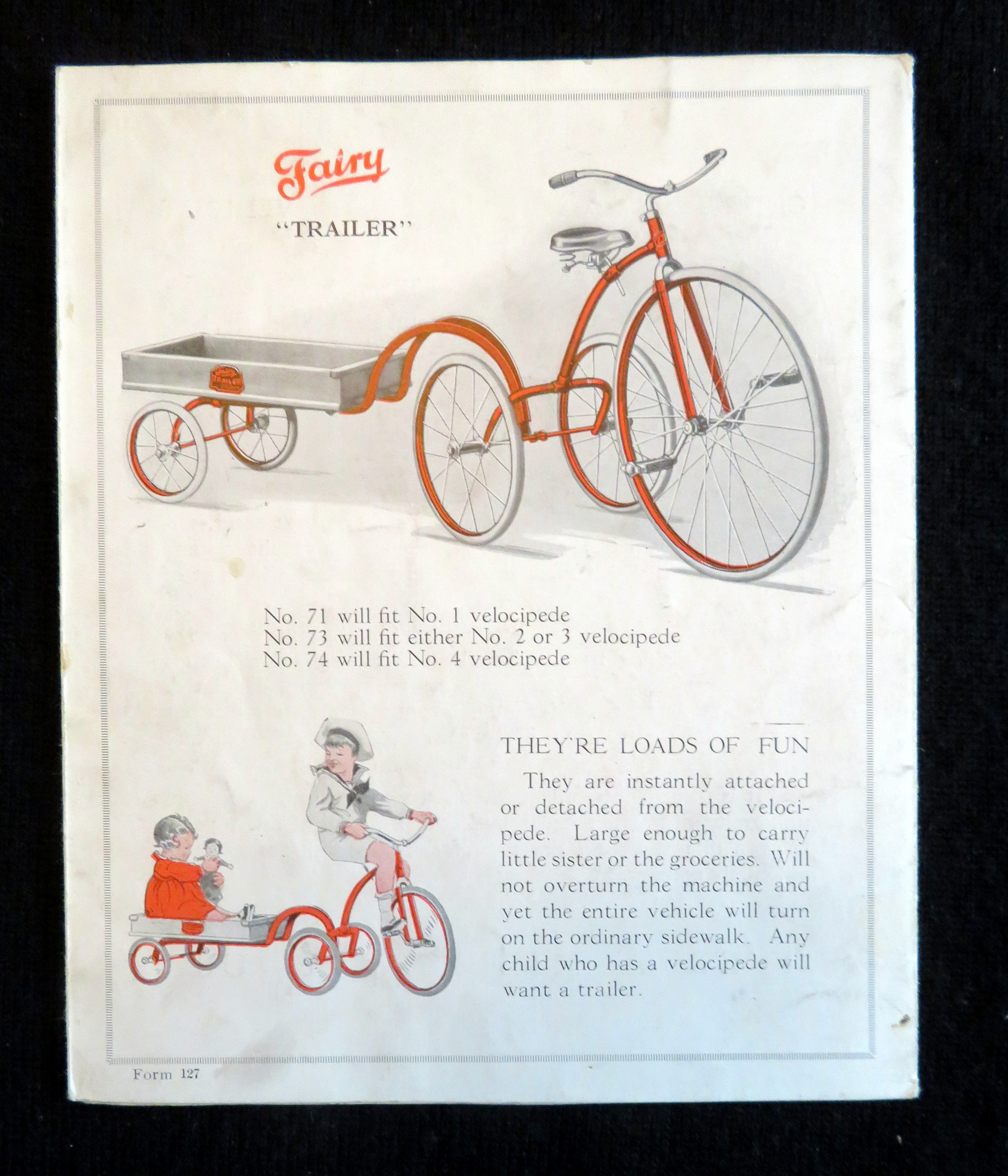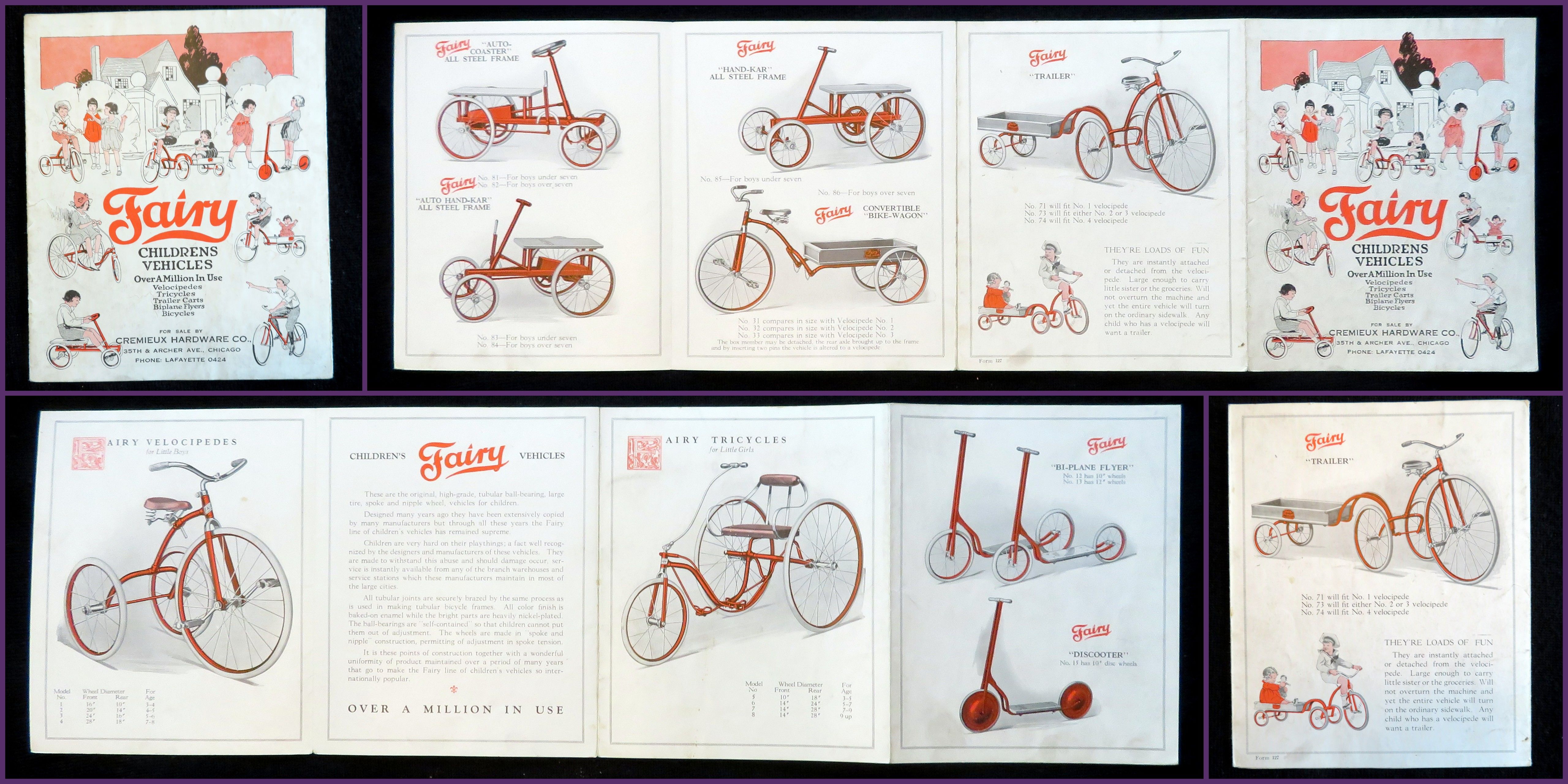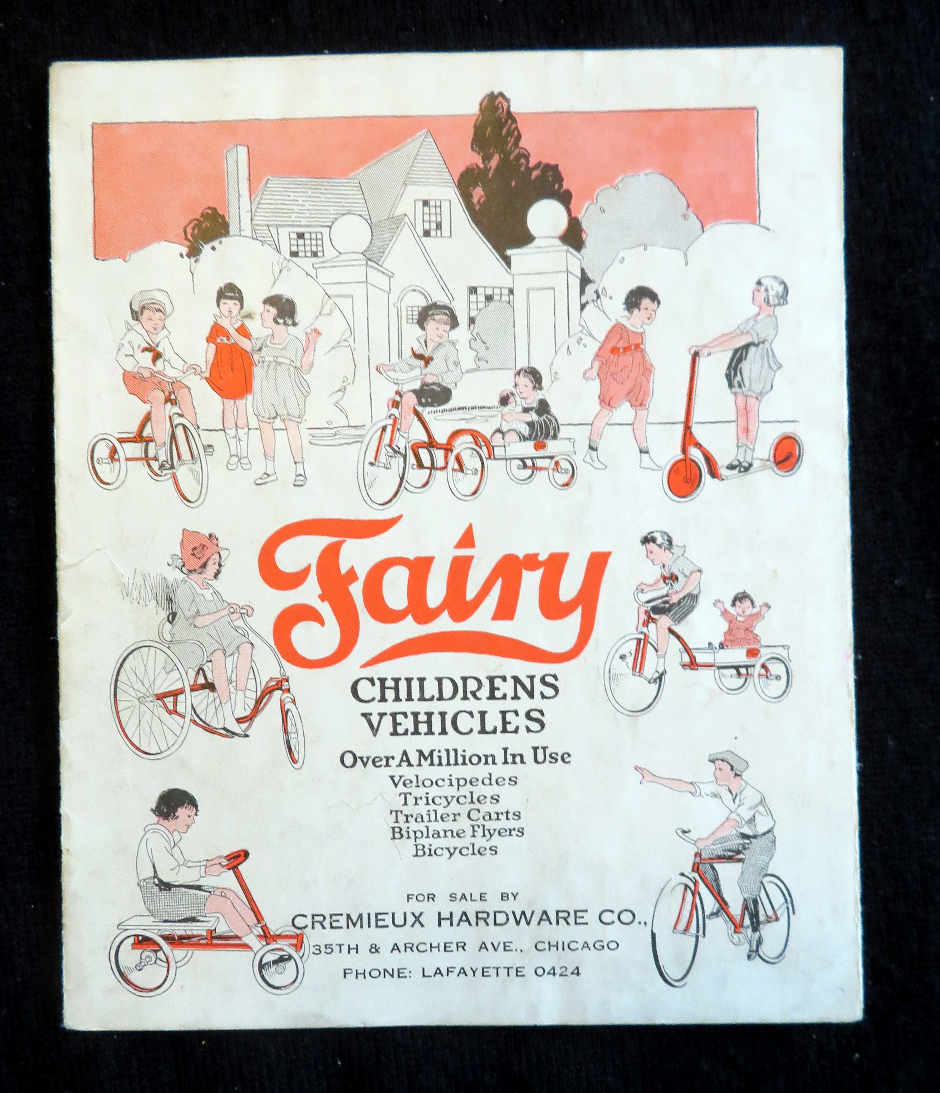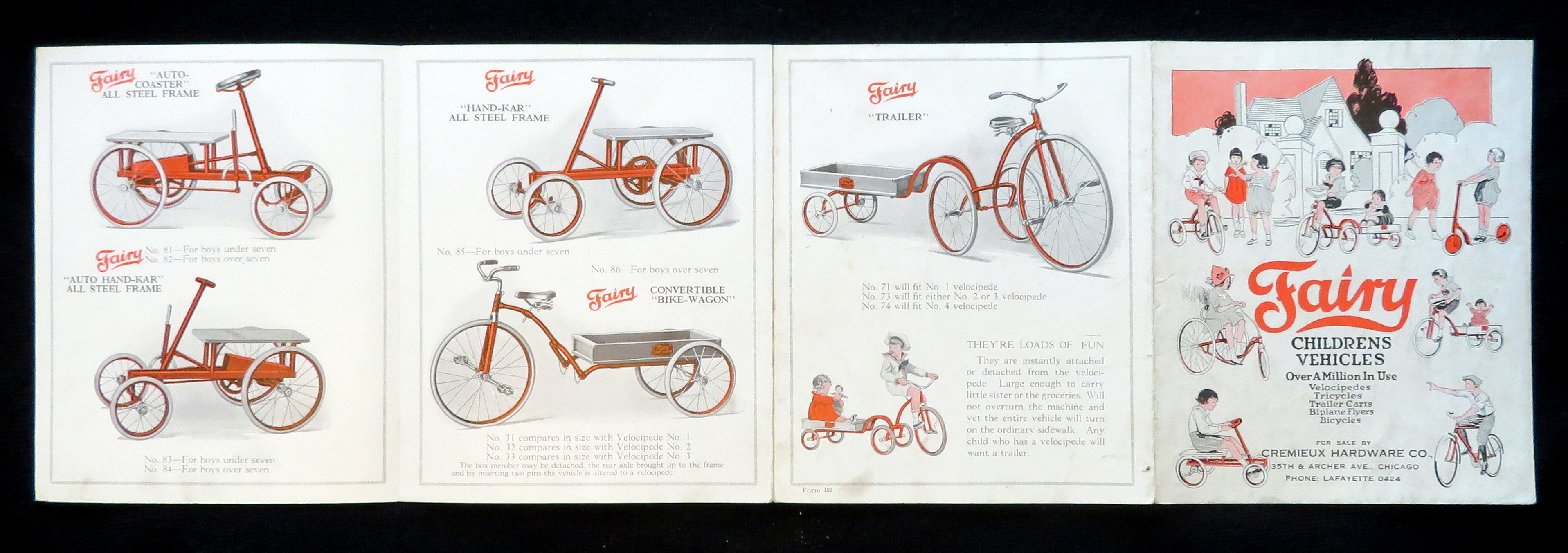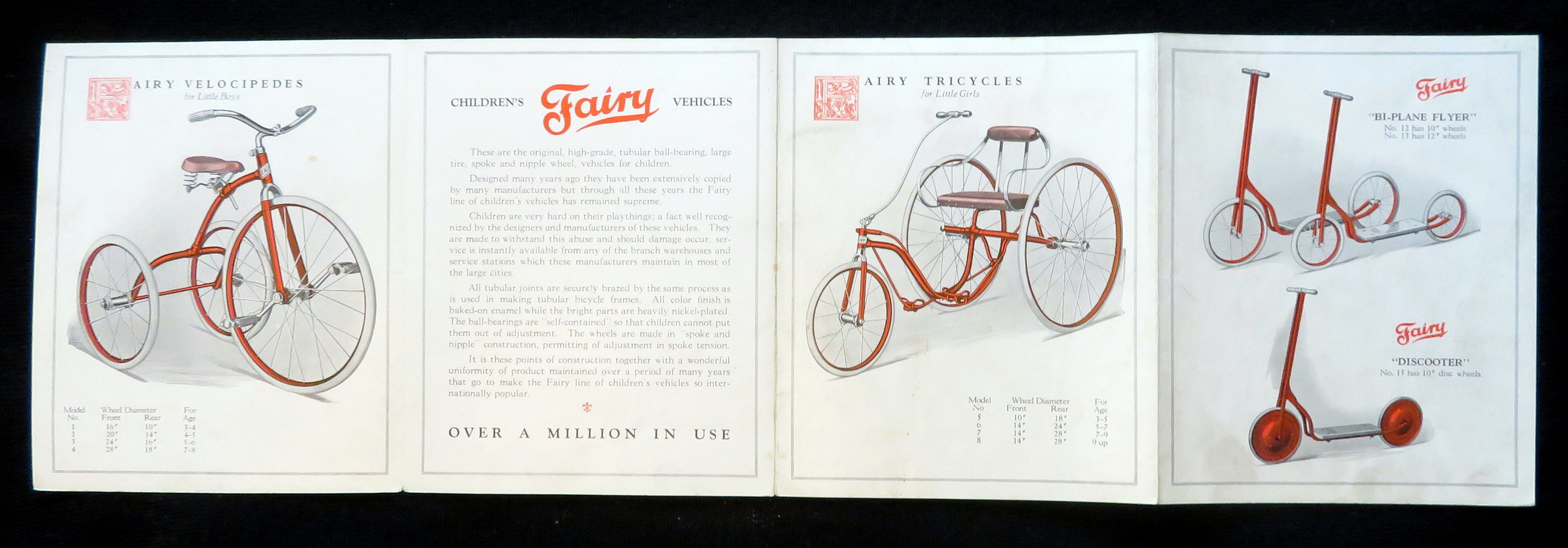 [Elyria, Ohio]: [Colson], 1920. Very good. Dust soiling.. Trade catalogue advertising bicycles, tricycles, velocipedes, carts, and flyers by the "Fairy" brand of vehicles for children in the 1930s. "Fairy" appears to have been owned at this time by the Colson company, that also made wheelchairs and related mobility equipment. This catalogue advertises nine different vehicles for children, each illustrated with a model name, wheel diameter, and age range when applicable. Note the special tricycle made "for Little Girls", which has a full seat, presumably to prevent little skirts from getting in the way and protecting modesty! Folding illus. leaflet measuring approx. 6.75" by 5.5" folded, 6.75" by 22" unfolded. Printed in grey and red.