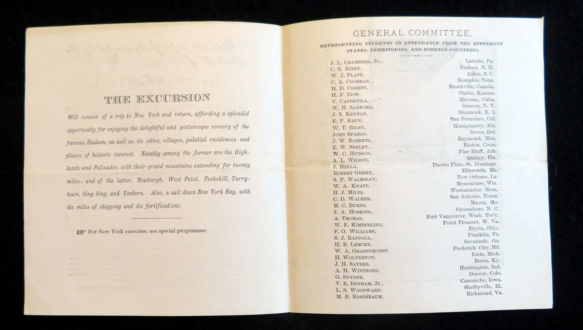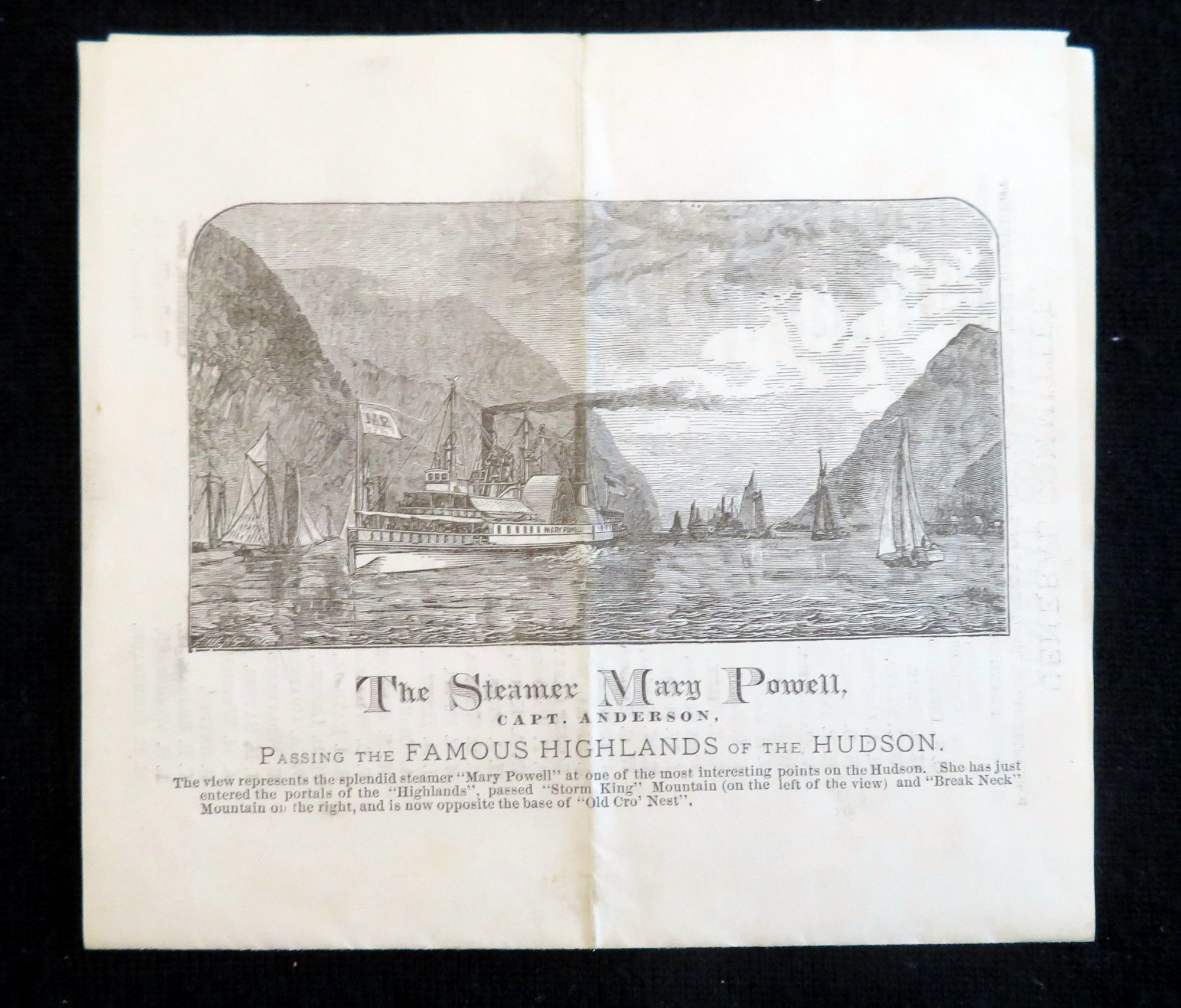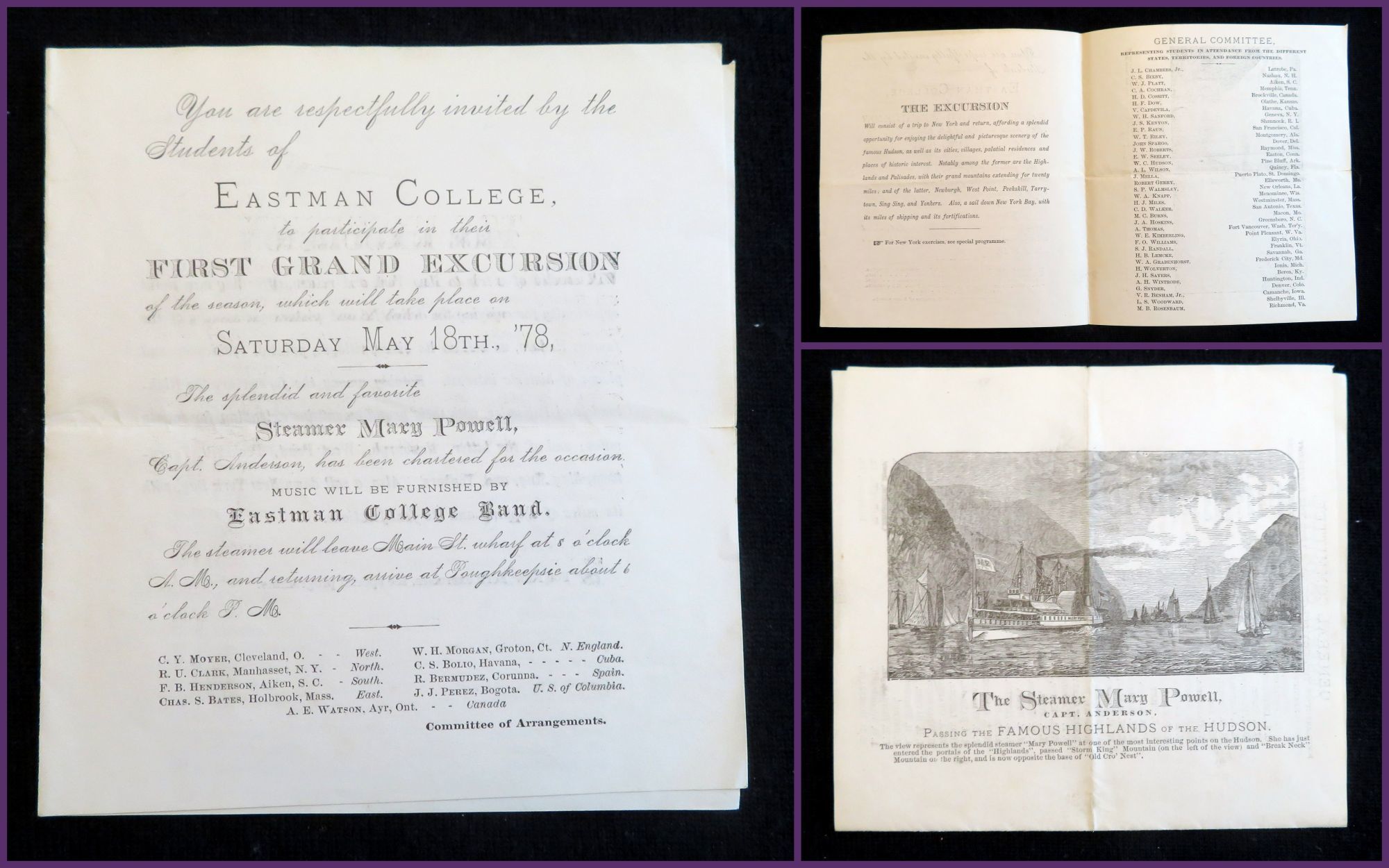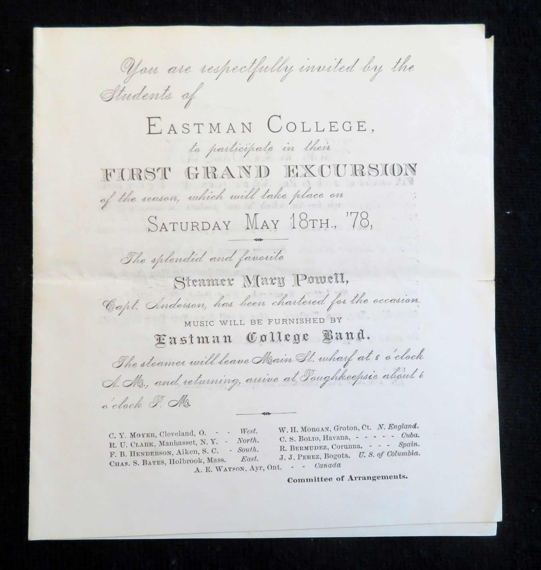 Poughkeepsie, NY: Eastman College, 1878. General wear. Crease folds.. An invite for the Eastman College's First Grand Excursion, otherwise known as "Poughkeepsie to the Ocean" (via news articles at the time). The students were to travel on Saturday, May 18, 1878, on the steamer Mary Powell, all the way to New York City from Poughkeepsie, via the Hudson River. Along the way they were to stop at variety of locations so that the students could enjoy the "delightful and picturesque scenery of the famous Hudson, as well as its cities, villages, palatial residences and places of historic interest." Two of the specific locations to visit mentioned in the invite were West Point and the prison Sing Sing. The Eastman College Band would provide the entertainment for the students on the excursion. The college itself was first known as Eastman National Business College, and later shorted to Eastman Business School, than Eastman College, was founded in 1859 by Harvey G. Eastman (cousin to George Eastman of Kodak fame). The school eventually became affiliated with the New York Business Institute before closing in 1931. The back of the invite has a black and white engraving of the Steamer Mary Powell "passing through the famous highlands of the Hudson". Single fold. Measures 6 1/4" x 5 3/4" (folded), 11 1/2" x 6 1/4