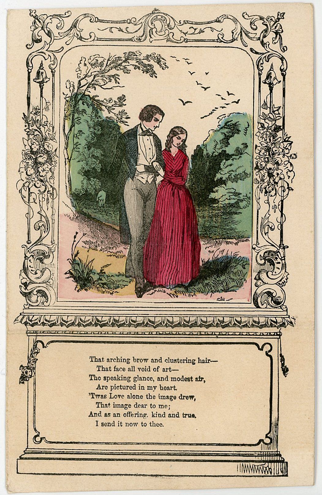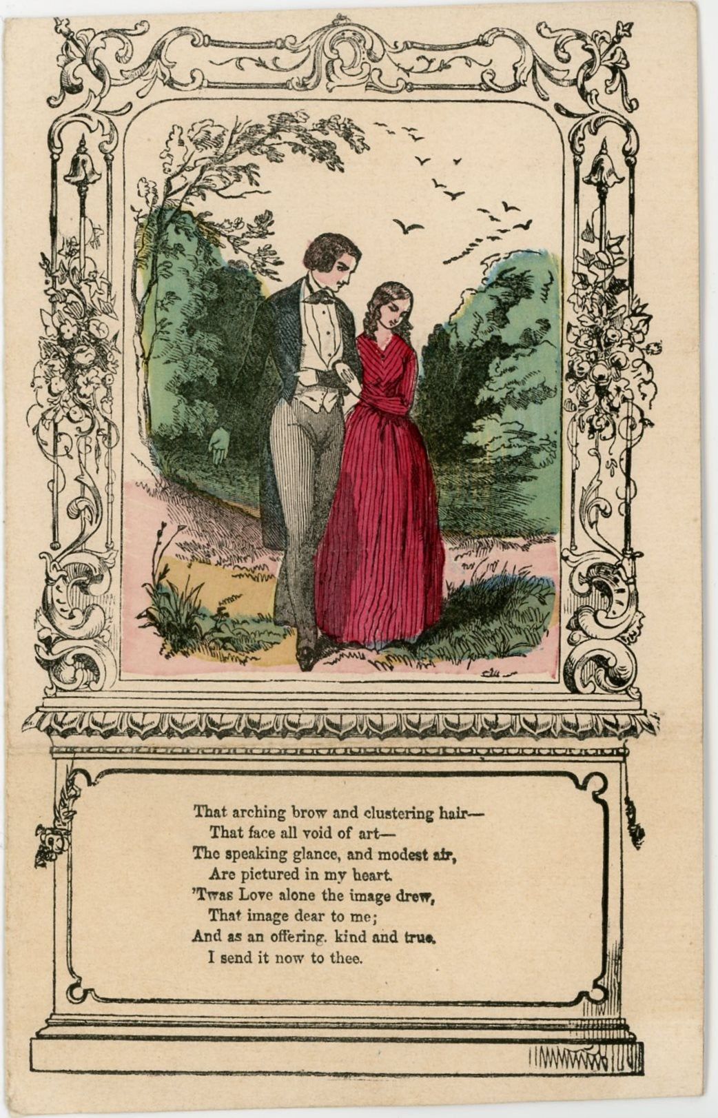 American, 1870. Printed slightly askew. Minimal wear.. A single-fold 7 3/4" x 4 7/8" lithograph valentine printed on plain paper. Image depicts a strolling somewhat sorrowful appearing couple. Decorative floral and filigree border. The verse below reads: