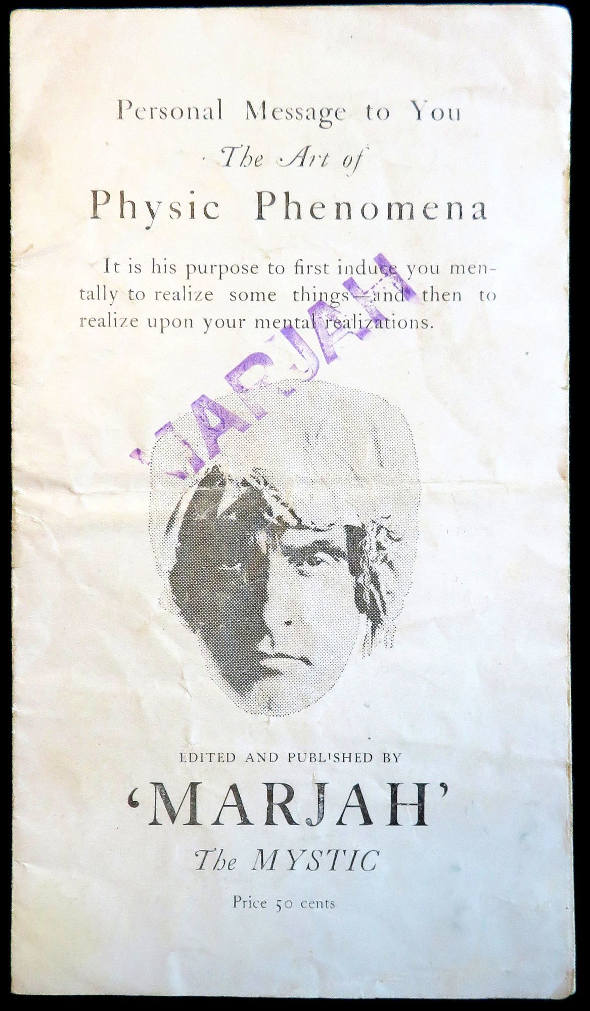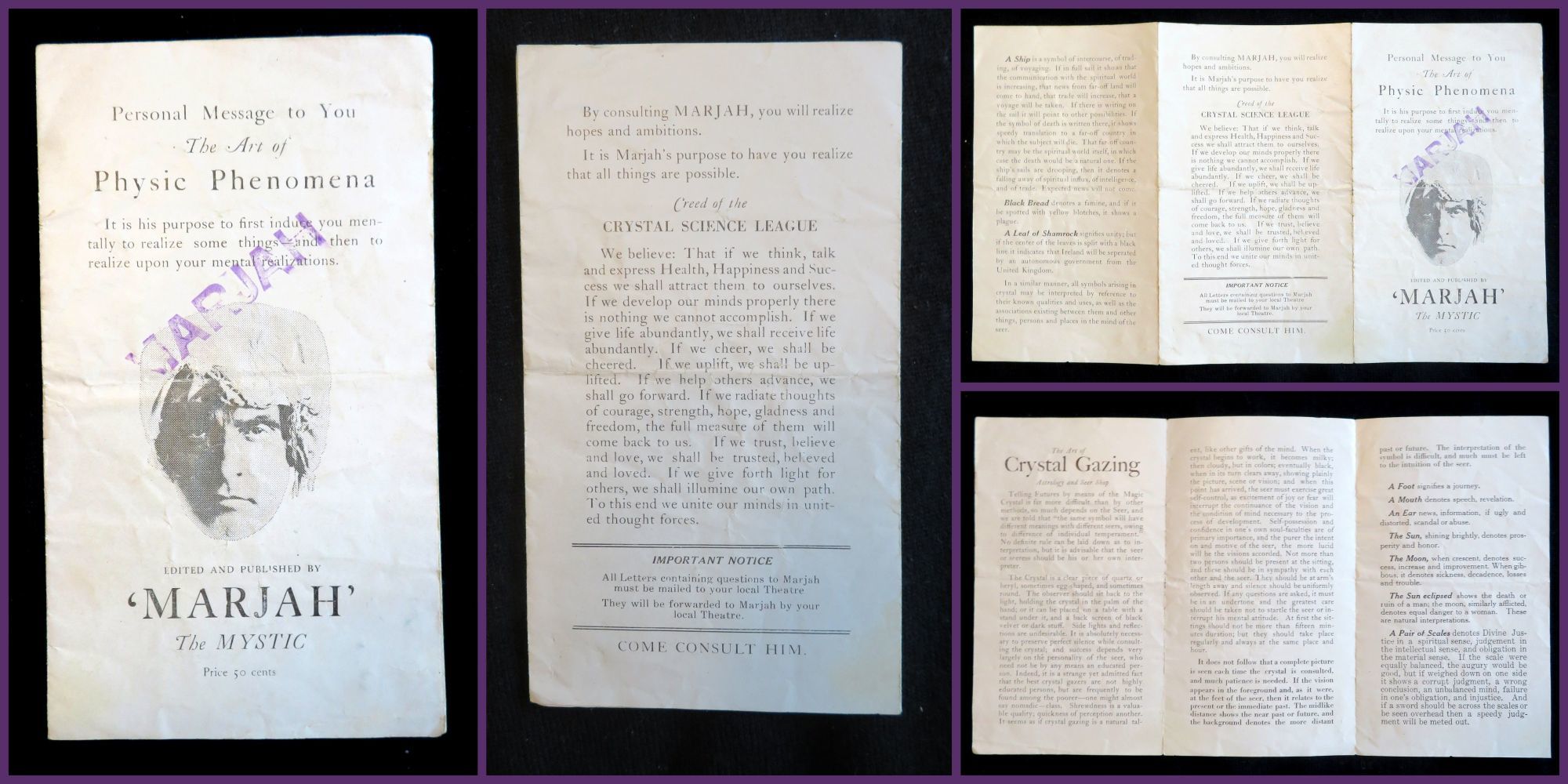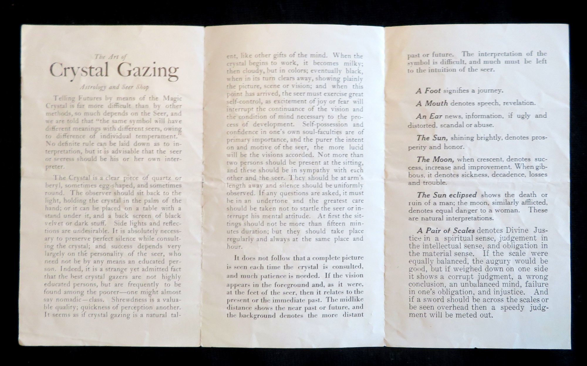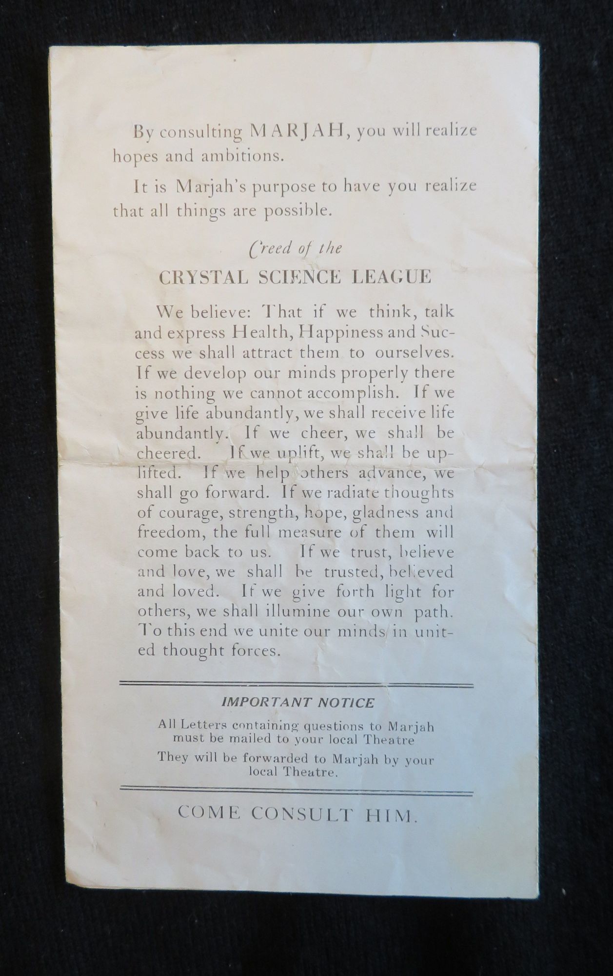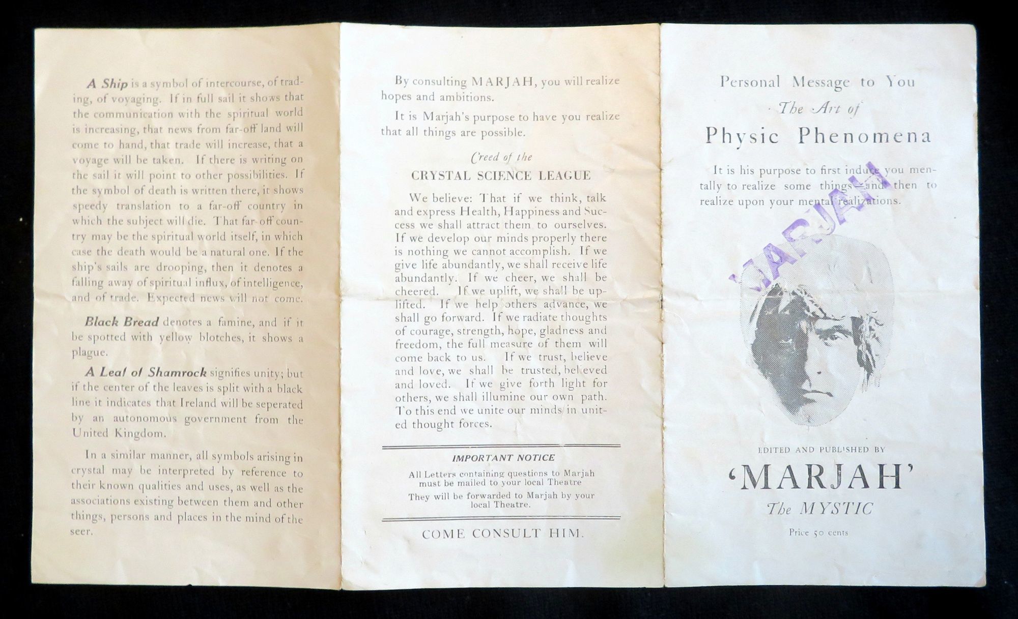 1920. General wear.. A tri-fold brochure about the "art of physic phenomena", or more specifically crystal gazing. The front cover features a 'floating head' of the Marjah with the text, "It is his purpose to first induce you mentally to realize some things and then to realize upon your mental realizations." Stamped across the front cover in dark blue ink is the word "Marjah". The brochure describes what crystal gazing is. Claiming that "telling futures by means of the Magic Crystal is far more difficult than by other methods, so much depends on the Seer, owing to difference of individual temperament." It continues on to give instructions on how to perform a reading, such as the "purer the intent on and motive of the seer, the more lucid will be the visions accorded." As well as stating that no more than two more people, other than the seer, should be at any gazing, and that they should sit an arm's length away from one another. A vision within the crystal takes patience to see and that depending on were it appears within the crystal (foreground, mid distance, or background) it relates to whether or not it vision is about the past, present or future. After these instructions, there a list of symbols one might see, and their meaning. For example, an ear means news and information, but if it is ugly or distorted it could mean a scandal or abuse. Black bread means famine, but if the bread has yellow spots on it as well, it means plague. Lastly, on the back, the "Creed of the Crystal Science League" is printed: "We believe: That if we think, talk, and express Health, Happiness and Success we shall attract them to ourselves. If we develop our minds properly there is nothing we cannot accomplish.... If we give forth light for others, we shall illumine our own path. To this end we united our minds in united thought forces." There is some references throughout the brochure of consulting with the Marjah, but the only information given on how is "All letters containing questions to Marjah must be mailed to your local Theatre. They will be forwarded to Marjah by your local Theatre." Measures 7" x 4" (folded). In researching Marjah, found an advertisement for an upcoming performance in The Times Herald, Port Huron, MI, Nov. 1920.