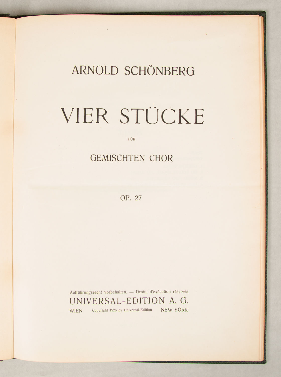 Wien: Universal-Edition [PN. U.E. 8549], 1926. Small folio. Full dark green cloth, titling gilt to spine. 1f. (title, contents), 3-4 (texts), 5 (notes on performance), 6-35 pp.