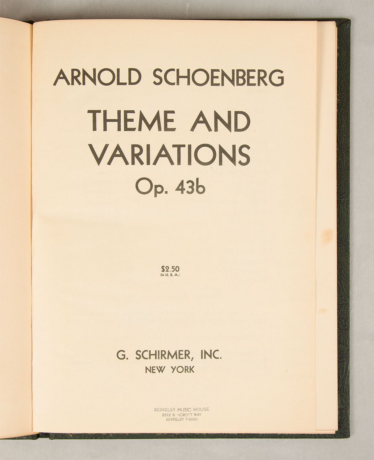 "It was Carl Engel, the president of Schirmer Publishing in New York, who suggested to Schönberg that he compose the Theme and Variations for Full Band, Op. 43. Engel had two objectives in mind; for one thing, he believed that the American wind band repertoire should be enriched by a challenging work from an outstanding composer of new music and, for another, he thought that a success in that medium, so popular in America, could help Schönberg out of his financial difficulties. ... Even while the piece was still being written, it soon became clear that the complexity of Schönberg’s setting could possibly exceed the technical capabilities of most American wind bands. So, in a letter dated August 16, 1942, Greissle suggested that Schönberg make a version for symphony orchestra – and the composer seems to have taken up the task with alacrity; the version for symphony orchestra (Op. 43b) must have been finished in October 1943." © Schott Music, Mainz / Universal Edition, Vienna.