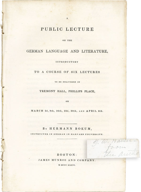 Boston: James Munroe and Company, 1836. First Edition. Octavo (21.5cm.); removed; 21pp. Faint vertical fold, light foxing, margins trimmed affecting author inscription else Very Good and sound. Inscribed in pencil at head of p. [3]: "G.W. Haven from the Author." Lecture delivered by the instructer in German at Harvard University during which he recites in the original German (reprinted here), Goethe's poem "Der Erlkönig." Of this piece Bokum argues that it "will suffice to persuade my hearers that the German language is not without euphony, that it admits of a great degree of expression, and that in point of pronunciation it does not present any great difficulty to the American student, since there are but very few elementary sounds to be acquired in addition to those which he already possesses in his own language" (p. 13). Uncommon.