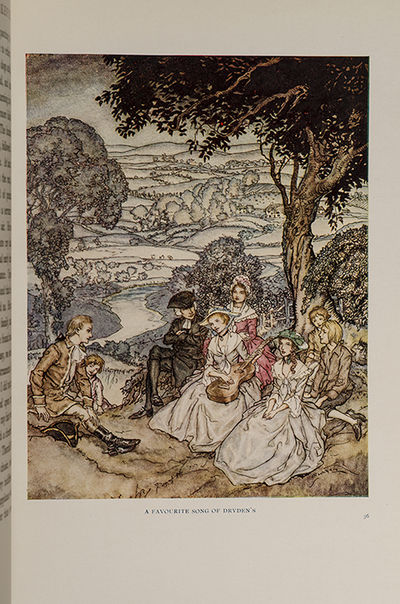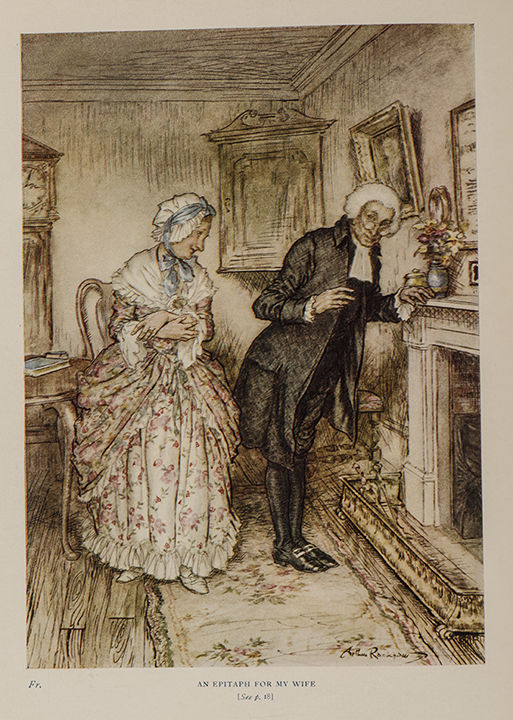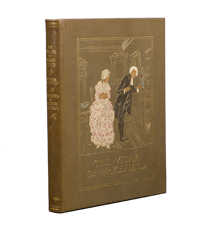 Reportedly published as a means for thwarting debt, The Vicar of Wakefield became one of the most popular novels of the late 18th century. Mixing irony with sentimentalism, it paints a portrait of village life "narrated by Dr. Primrose, the title character, whose family endured multiple trials -- including the loss of their fortune, the seduction of a daughter, the destruction of their home by fire, and the vicar's incarceration -- before all is put right at the end" (Britannica). Goldsmith was a noted Irish wit and a member of Samuel Johnson’s famed literary club, who Johnson praised as: “In genius, vivid, versatile, sublime. In style, clear, elevated, elegant." The legend of the book’s publication is that Goldsmith was about to be arrested by his landlady for debt, when Johnson was able to sell the manuscript of the novel to a publisher for sixty pounds, saving his friend in the nick of time. For this illustrated edition, Rackham embraced historical costume and his traditional whimsy, despite the more fashionable Jazz-Age and Art Deco style predominant at the time (Husdon).