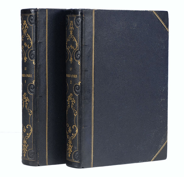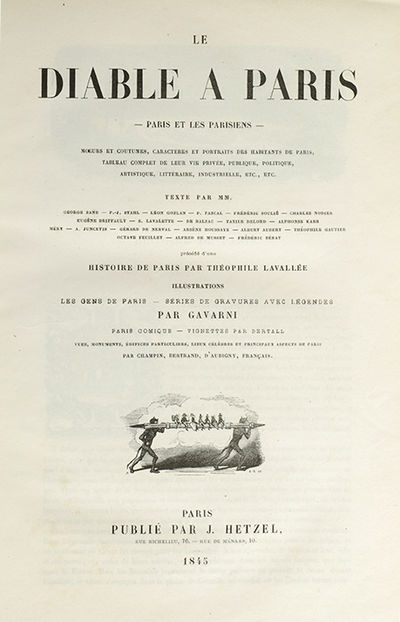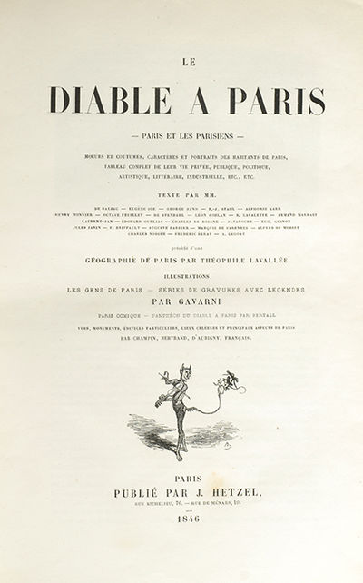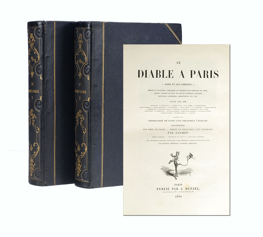 Le Diable a Paris. (in 2 vols). Paris et les Parisiens. Mœurs et coutumes, caractèes et portraits des habitants de Paris, tableau complet de leur vie privée, publique, politique, artistique, littéraire, industrielle, etc., etc. Texte par MM. George dDe Balzac, Taxile Delord, Alphonse Karr, Méry, A. Juncetis, Gérard de Nerval, Arsène Houssaye, Albert Aubert, Théophile Gautier, Octave Feuillet, Alfred de Musset, Frédéric Bérat, précédé d’une Histoire de Paris par Théophile Lavallée. Illustrations Les Gens de Paris, Séries de gravures avec légendes par Gavarni. Paris comique, vignettes par Bertall. Vues, monuments, édifices particuliers, lieux célèbres et principaux aspects de Paris par Champin, Bertrand, d’Aubigny, Français