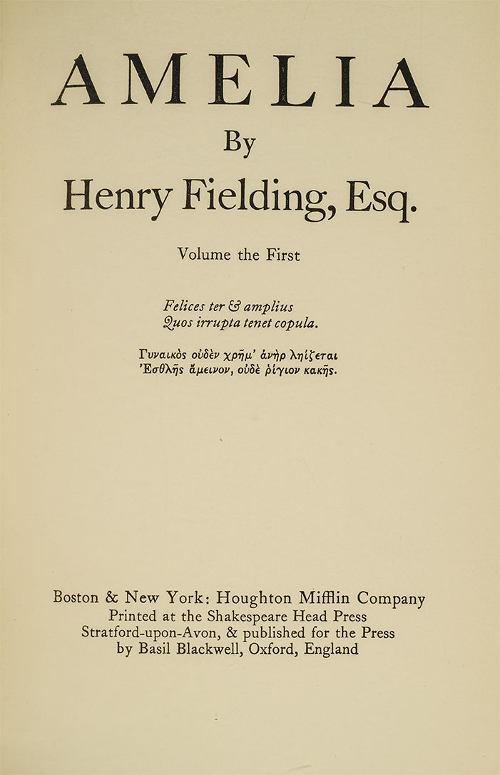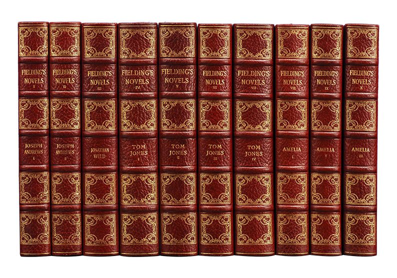 "The Elizabethan scholar A. H. Bullen established the Shakespeare Head Press in Stratford-up-Avon in 1904. His original aim was to produce a good edition of Shakespeare's works, and his ten volume Stratford Town Shakespeare was completed by 1907. After Bullen died in 1927, the press was acquired by a partnership including Basil Blackwell, the Oxford bookseller. Bernard Newdigate was appointed as typographer and under his direction the press worked within the Morris tradition" (Rogerson). The present contains: Joseph Andrews (2 vols); Jonathan Wild; Tom Jones; (4 vols) and Amelia (3 vols).
