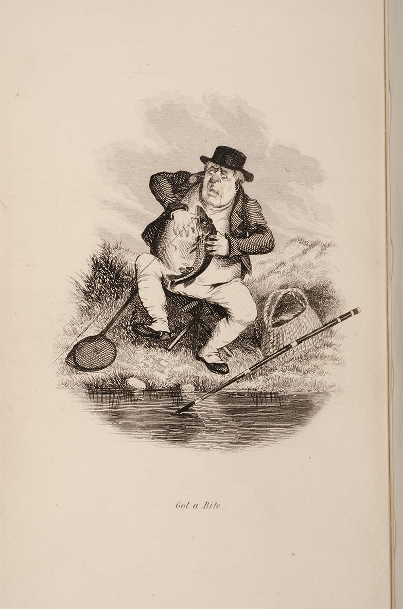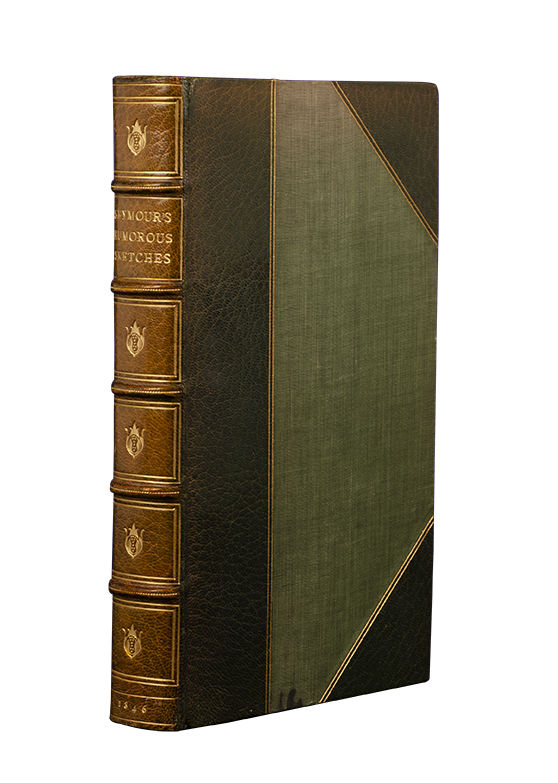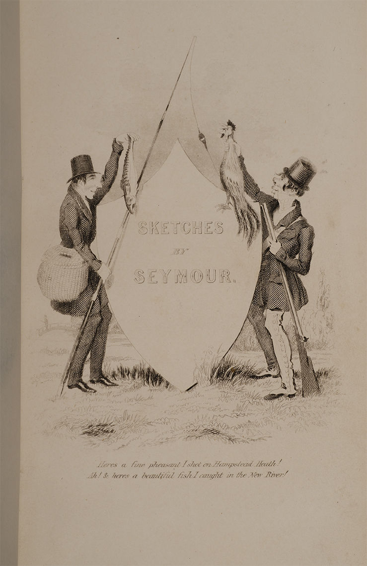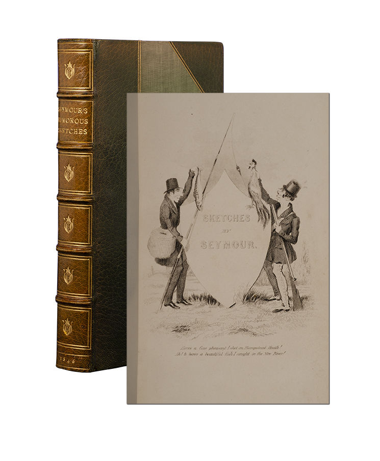 Robert Seymour (1798-1836) was a popular and prolific illustrator and satirical cartoonist specializing in sporting subjects. "Influenced by the work of caricaturist George Cruikshank (1792-1878), Seymour gave up a career as a draftsman to devote himself to illustration, beginning under the pseudonym Short Shanks. By 1830, his political caricatures were widely circulated through the satirical journals Figaro in London and The Looking-Glass, or McLean’s Monthly. Highly strung and extremely sensitive about his status as an artist, Seymour was emotionally and mentally unstable, having suffered a nervous breakdown in 1830. Despite the enormous output of Seymour, very little of his work was colored, his illustrations being mostly woodcuts or etchings. It will be remembered that Seymour originated the idea of a series of Cockney sporting sketches to be published in monthly parts. The idea was taken up by Chapman and Hall, who engaged Dickens to write the letterpress. From this grew the famous Pickwick Papers” (Abbey).