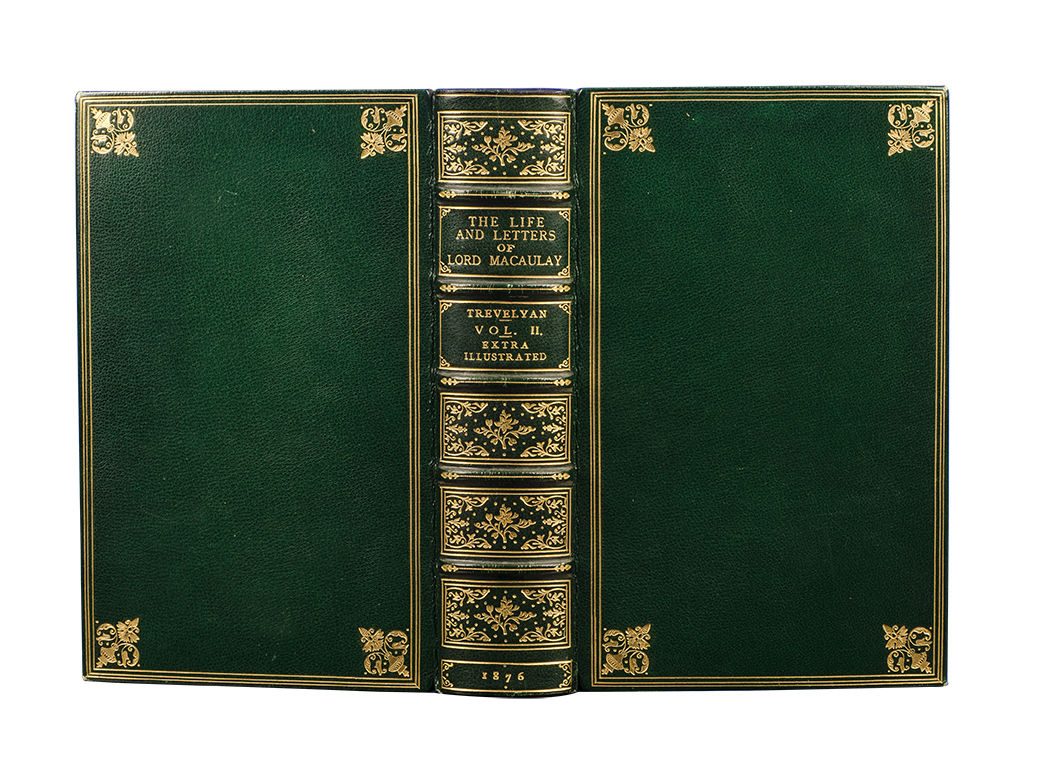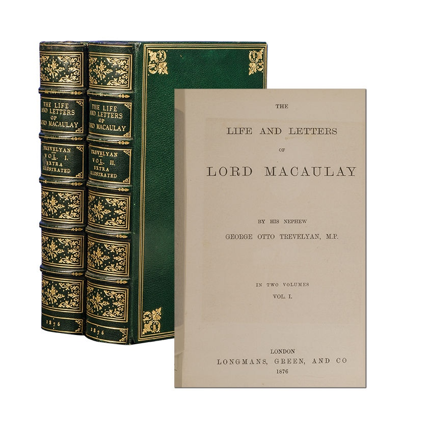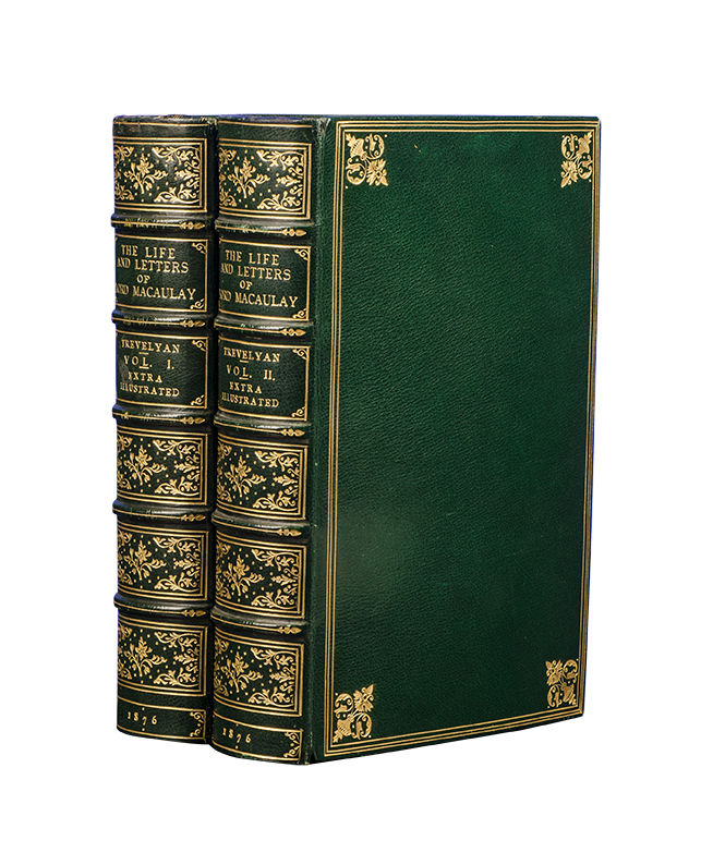 London: Longmans, Green, and Co, 1876. First edition. Extra Illustrated with seventy-seven fine portraits and views, including thirty-seven in color. Two octavo volumes (8 1/4 x 5 1/4 inches; 209 x 133 mm.). Bound ca. 1910 by Root & Son of London (stamp-signed on front turn-ins) in full dark green morocco. Covers decoratively bordered in gilt, spines with five raised bands elaborately tooled and lettered in gilt in compartments, green silk liners and end leaves, all edges gilt. Headcap of volume one expertly and almost invisibly repaired. Collating xii, 475, [1, blank]; viii, 480. Engraved frontispiece portrait of Lord Macaulay in volume II. Extra-illustrated by the insertion of sixty-eight fine engraved (mainly nineteenth century) portraits, many of which are inlaid to size, including thirty-seven with hand-coloring. In addition there are nine nineteenth century engraved views. A very Fine copy.