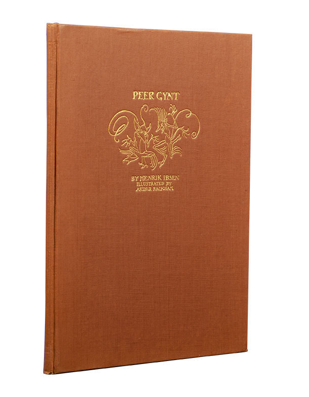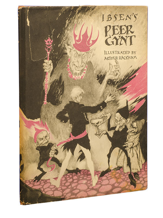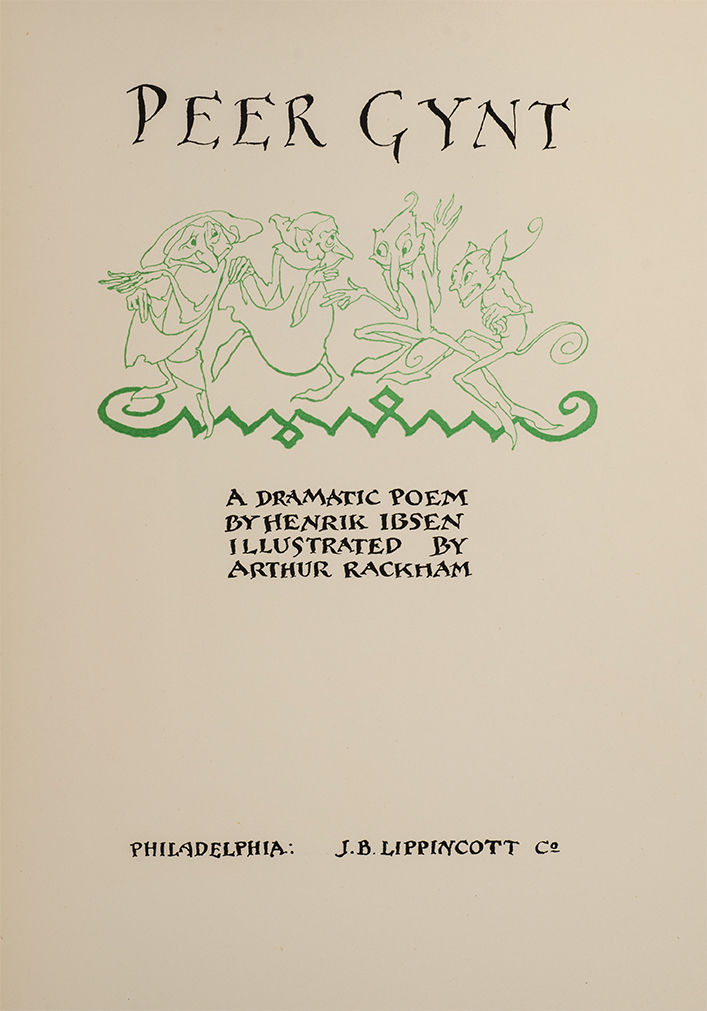A great rarity. These were obviously produced in minimal quantity for the publisher's salespeople to solicit advance orders from bookshops. The 'list' of illustrations leaf states "[There will be Twelve Plates in Colour]" The vignettes on the half-title and title-page in the published edition are printed in a much lighter and brighter green. The list of books Illustrated by Arthur Rackham on the verso of the half-title is very different from the published edition. The two color plates are: "Peer and the Woman in Green" [in the published edition this plate faces p. 66 and is titled "Peer follows the Woman in Green"] and "Anitra's Dance" [in the published edition this plate faces page 148]. Although this sample has the Lippincott imprint, the verso of the title-page says "Printed in Great Britain."